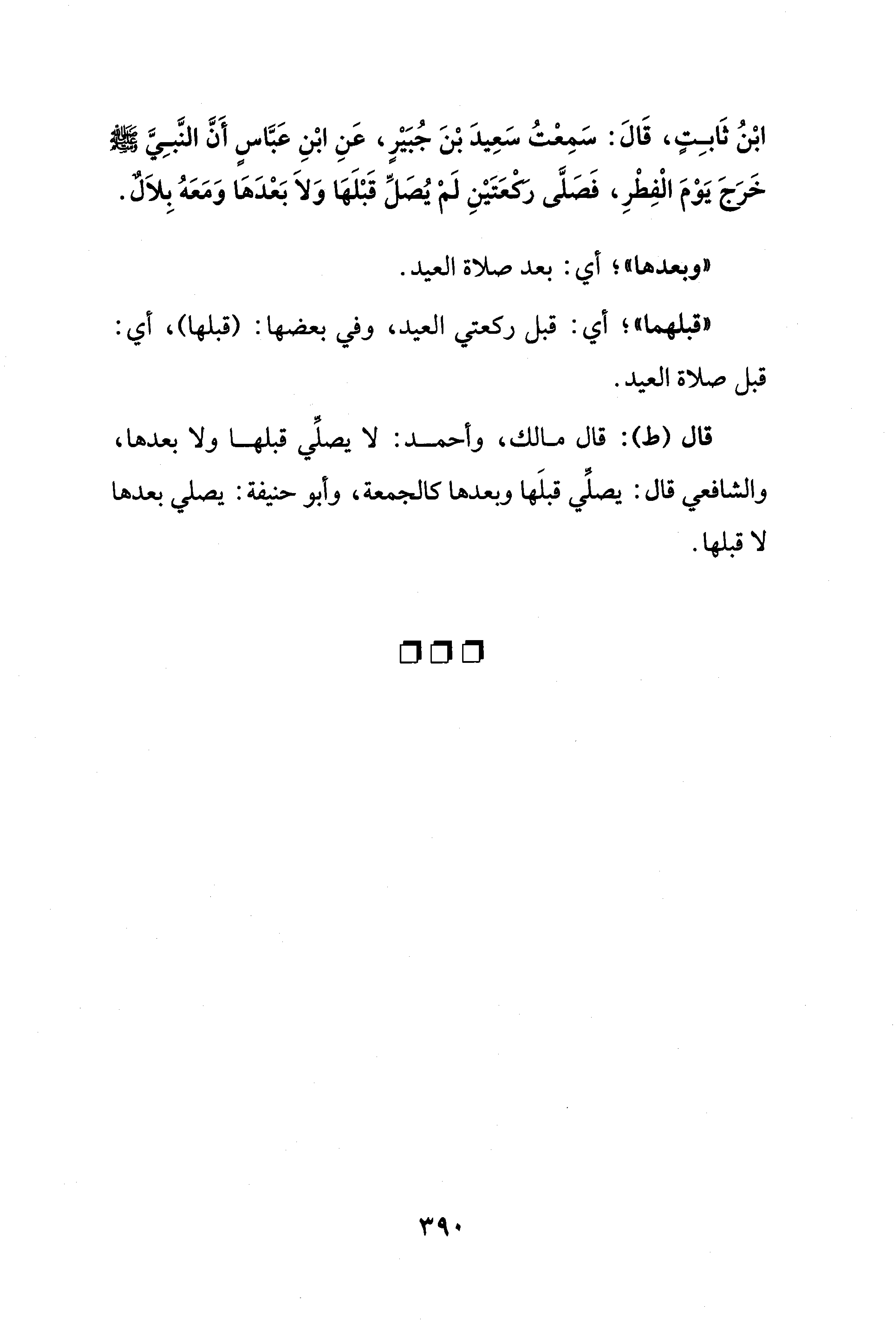 ابْنُ ثَابِتٍ، قَالَ: سَمِعْتُ سَعِيدَ بْنَ جُبَيْرٍ، عَنِ ابْنِ عَبَّاسٍ أَنَّ النَّبِيَّ - صلى الله عليه وسلم - خَرَجَ يَوْمَ الْفِطْرِ، فَصَلَّى رَكعَتَيْنِ لَمْ يُصَلِّ قَبْلَهَا وَلاَ بَعْدَهَا وَمَعَهُ بِلاَلٌ.