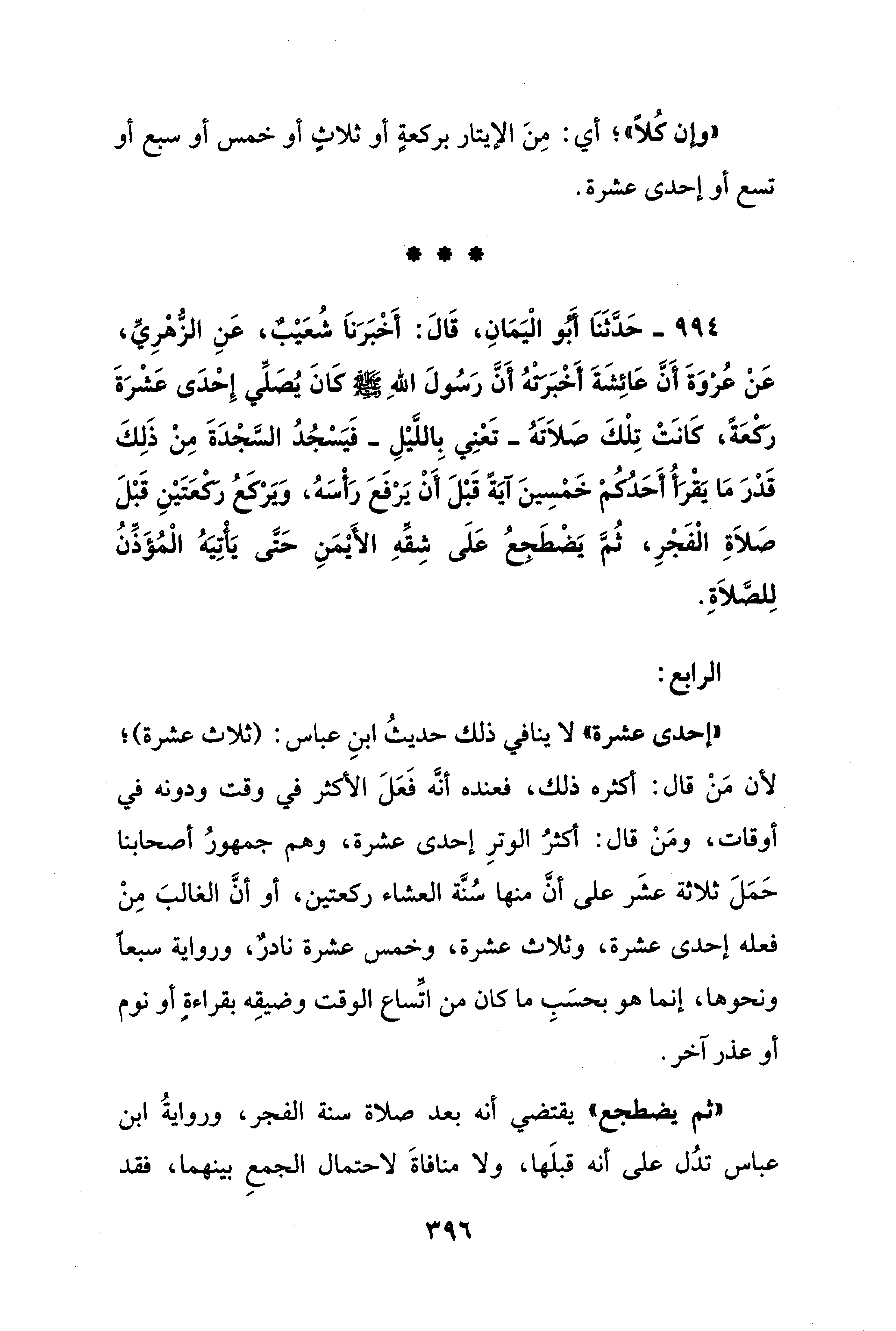994 - حَدَّثَنَا أَبُو الْيَمَانِ، فَالَ: أَخْبَرَناَ شُعَيْبٌ، عَنِ الزُّهْرِيِّ، عَنْ عُرْوَةَ أَنَّ عَائِشَةَ أَخْبَرتْهُ أَنَّ رَسُولَ اللهِ - صلى الله عليه وسلم - كَانَ يُصَلِّي إِحْدَى عَشْرَةَ رَكْعَةً، كَانَتْ تِلْكَ صَلاَتَهُ -تَعْنِي بِاللَّيْلِ- فَيَسْجُدُ السَّجْدَةَ مِنْ ذَلِكَ قَدْرَ مَا يَقْرَأُ أَحَدُكُمْ خَمْسِينَ آيَةً قَبْلَ أَنْ يَرْفَعَ رَأْسَهُ، وَيَرْكَعُ رَكعَتَيْنِ قَبْلَ صَلاَةِ الْفَجْرِ، ثُمَّ يَضْطَجعُ عَلَى شِقِّهِ الأَيْمَنِ حَتَّى يَأْتِيَهُ الْمُؤَذِّنُ لِلصَّلاَةِ.