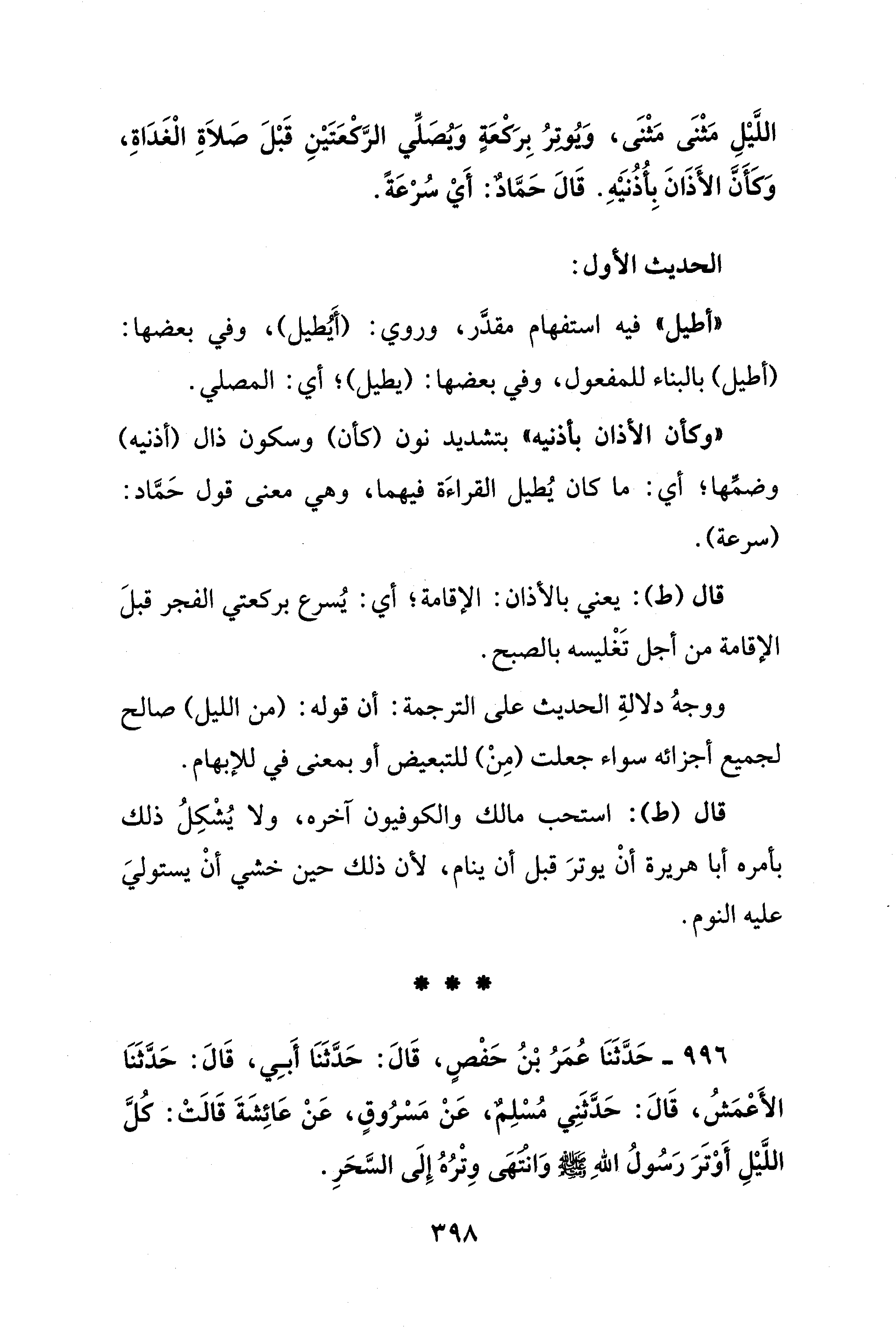 996 - حَدَّثَنَا عُمَرُ بْنُ حَفْصٍ، قَالَ: حَدَّثَنَا أَبِي، قَالَ: حَدَّثَنَا الأَعْمَشُ، قَالَ: حَدَّثَنِي مُسْلِمٌ، عَنْ مَسْرُوقٍ، عَنْ عَائِشَةَ قَالَتْ: كُلَّ اللَّيْلِ أَوْتَرَ رَسُولُ اللهِ - صلى الله عليه وسلم - وَانْتَهَى وِتْرُهُ إِلَى السَّحَرِ.