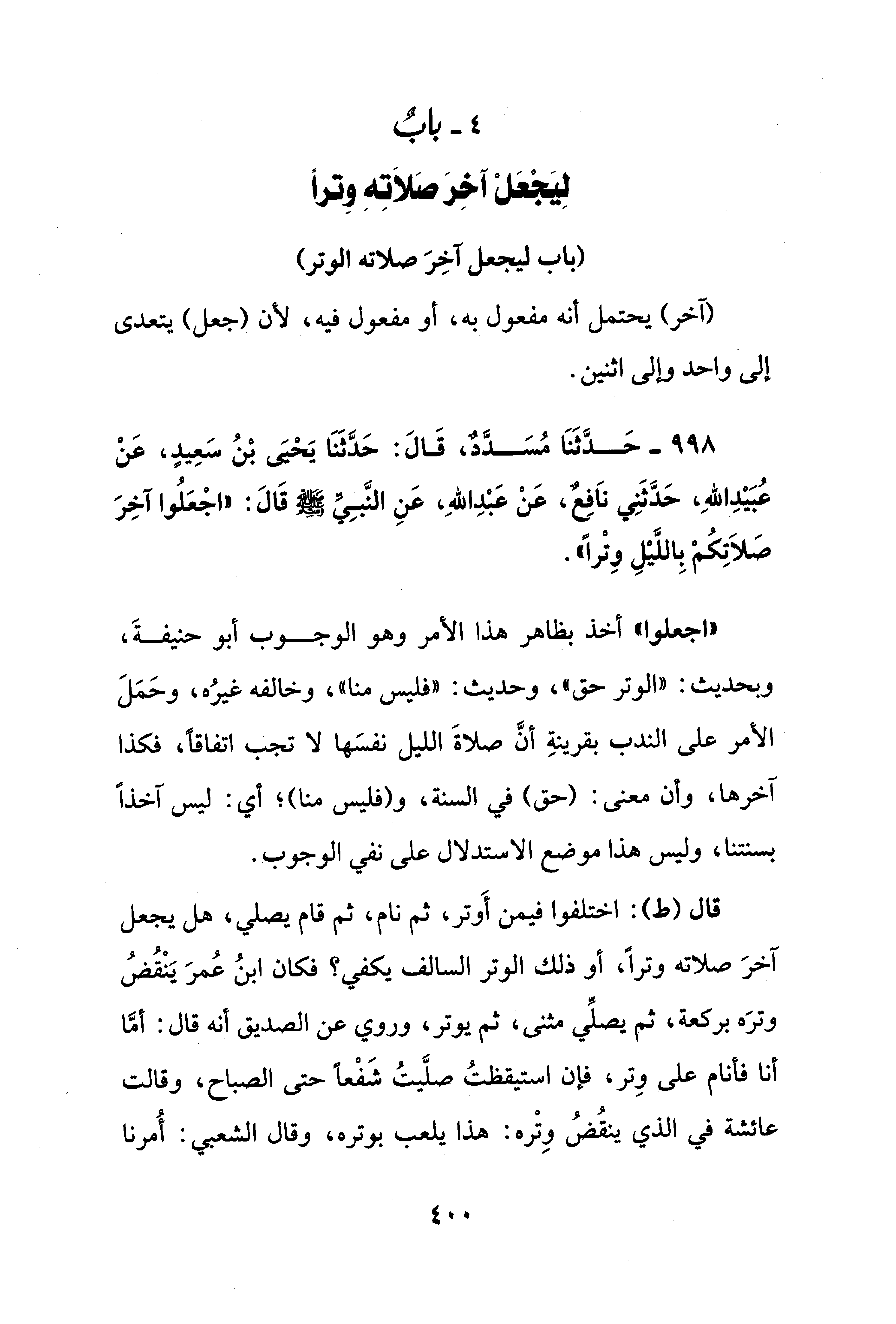 4 - بابٌ لِيَجْعَلْ آخِرَ صَلاَتِهِ وِترًا