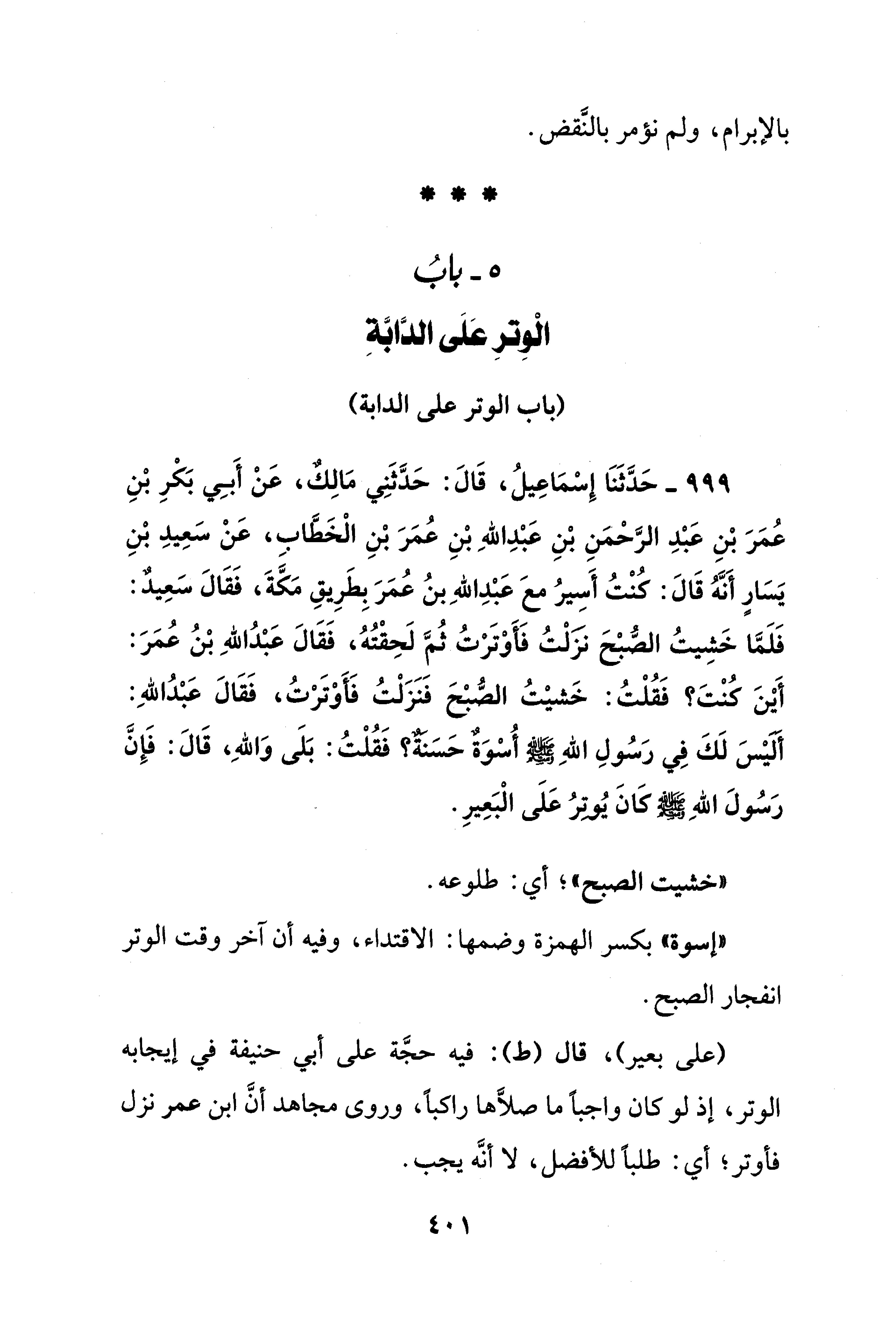 999 - حَدَّثَنَا إِسْمَاعِيلُ، قَالَ: حَدَّثَنِي مَالِكٌ، عَنْ أَبِي بَكْرِ بْنِ عُمَرَ بْنِ عَبْدِ الرَّحْمَنِ بْنِ عَبْدِ اللهِ بْنِ عُمَرَ بْنِ الْخَطَّابِ، عَنْ سَعِيدِ بْنِ يَسَارٍ أَنَّهُ قَالَ: كنْتُ أَسِيرُ معَ عَبْدِ اللهِ بنُ عُمَرَ بِطَرِيقِ مَكَّةَ، فَقَالَ سَعِيدٌ: فَلَمَّا خَشِيتُ الصُّبْحَ نزَلْتُ فَأَوْتَرْتُ ثُمِّ لَحِقْتُهُ، فَقَالَ عَبْدُ اللهِ بْنُ عُمَرَ: أَيْنَ كُنْتَ؟ فَقُلْتُ: خَشيْتُ الصُّبْحَ فنَزَلْتُ فَأَوْتَرْتُ، فَقَالَ عَبْدُ اللهِ: أَلَيْسَ لَكَ فِي رَسُولِ اللهِ - صلى الله عليه وسلم - أُسْوَةٌ حَسَنَةٌ؟ فَقُلْتُ: بَلَى وَاللهِ، قَالَ: فَإِنَّ رَسُولَ اللهِ - صلى الله عليه وسلم - كَانَ يُوترُ عَلَى الْبَعِيرِ.