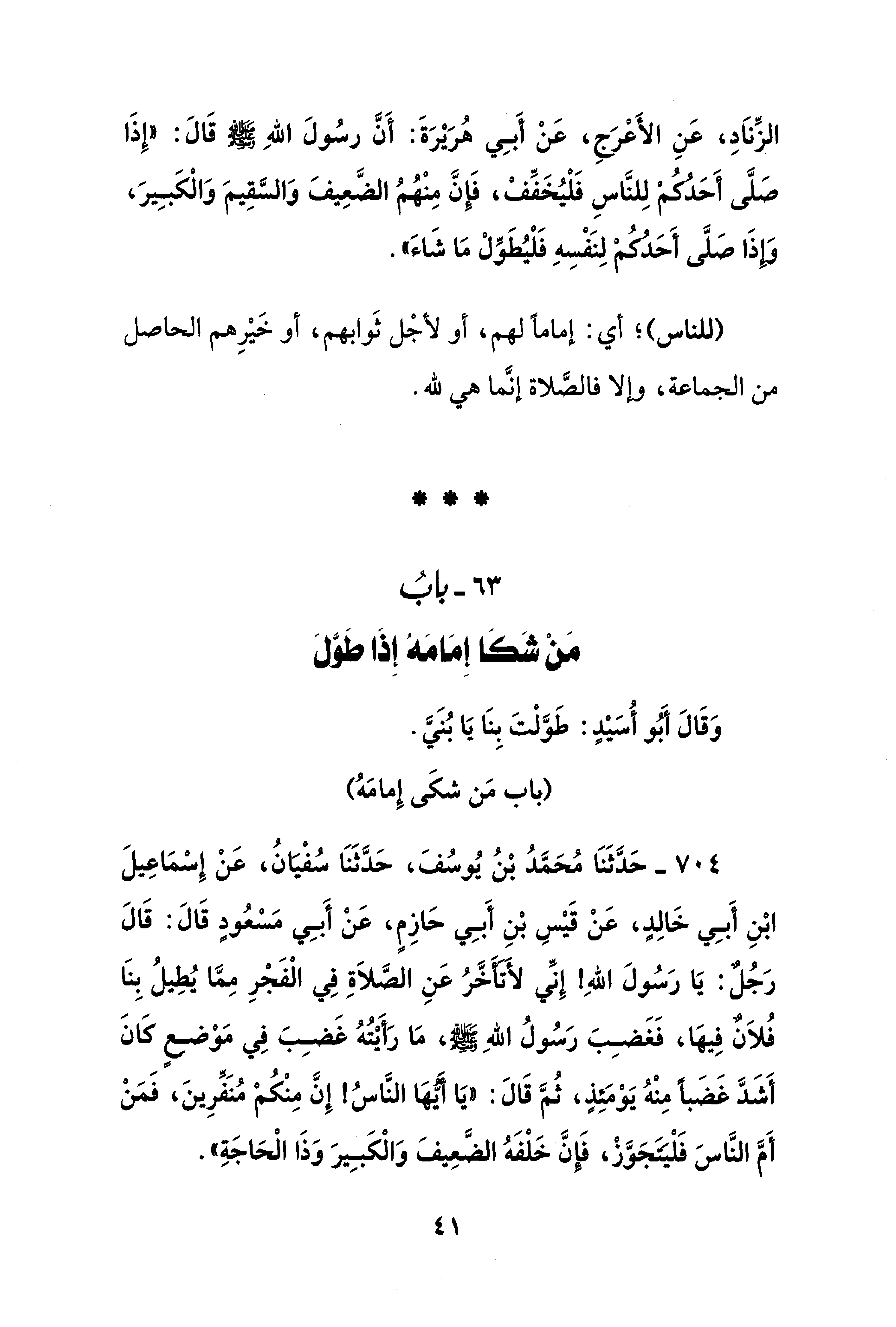 704 - حَدَّثَنَا مُحَمَّدُ بْنُ يُوسُفَ، حَدَّثَنَا سُفْيَانُ، عَنْ إسْمَاعِيلَ ابْنِ أَبِي خَالِدٍ، عَنْ قَيْسِ بْنِ أَبِي حَازِمٍ، عَنْ أَبِي مَسْعُودٍ قَالَ: قَالَ رَجُلٌ: يَا رَسُولَ اللهِ! إِنِّي لأَتأخَّرُ عَنِ الصَّلاَةِ فِي الْفَجْرِ مِمَّا يُطِيلُ بِنَا فُلاَنٌ فِيهَا، فَغَضِبَ رَسُولُ اللهِ - صلى الله عليه وسلم -، مَا رَأَيْتُهُ غَضِبَ فِي مَوْضعٍ كَانَ أَشَدَّ غَضَبًا مِنْهُ يَوْمَئِذٍ، ثُمَّ قَالَ: "يَا أيُّهَا النَّاسُ! إِنَّ مِنْكُمْ مُنَفِّرِينَ، فَمَنْ أَمَّ النَّاسَ فَلْيتَجَوَّزْ، فَإِنَّ خَلْفَهُ الضَّعِيفَ وَالْكَبِيرَ وَذَا الْحَاجَةِ".