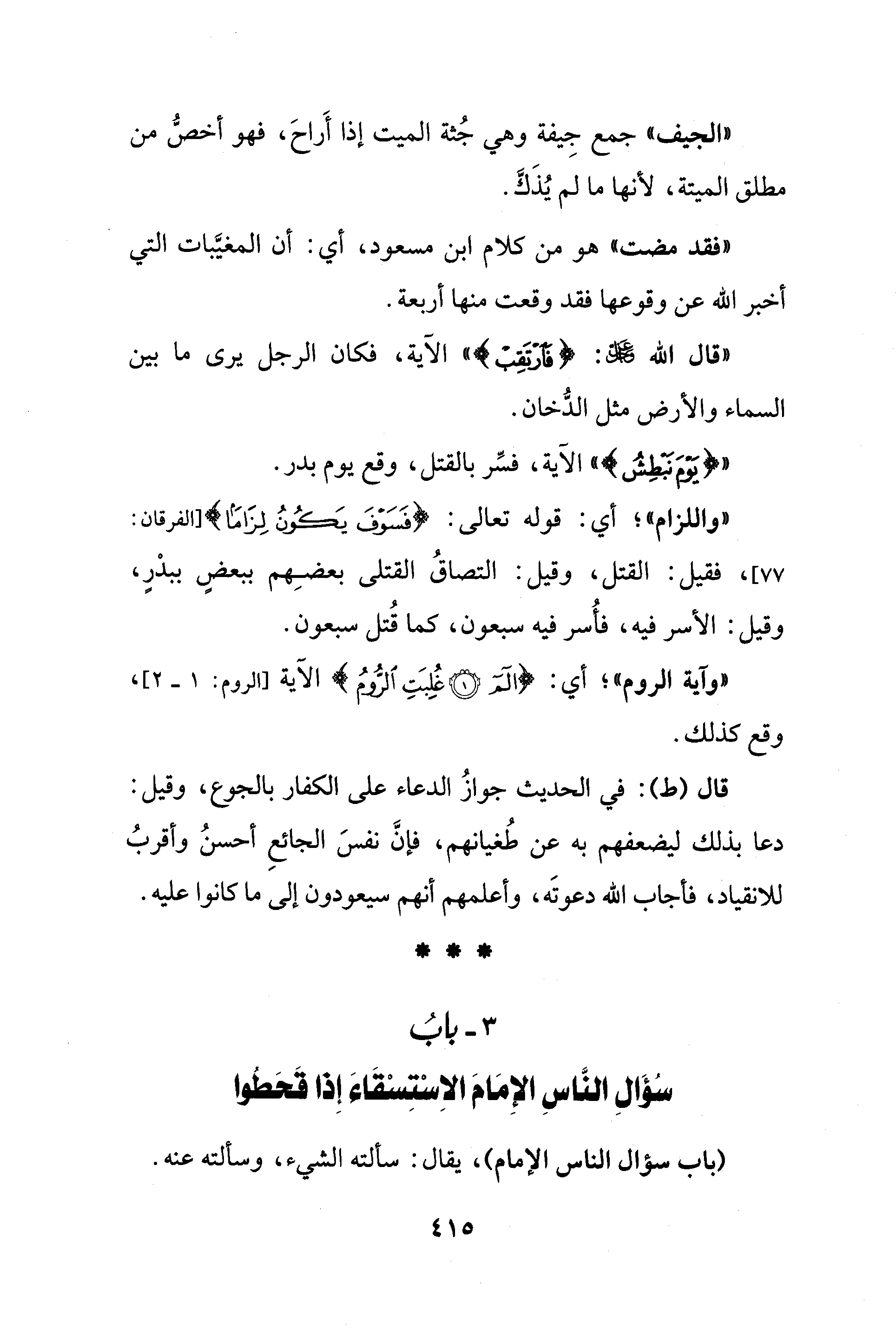 "واللزام"؛ أي: قوله تعالى: {فَسَوْفَ يَكُونُ لِزَامًا} [الفرقان: 77]، فقيل: القتل، وقيل: التصاقُ القتلى بعضِهم ببعضِ ببدْرٍ، وقيل: الأسر فيه، فأُسر فيه سبعون، كما قُتل سبعون.
