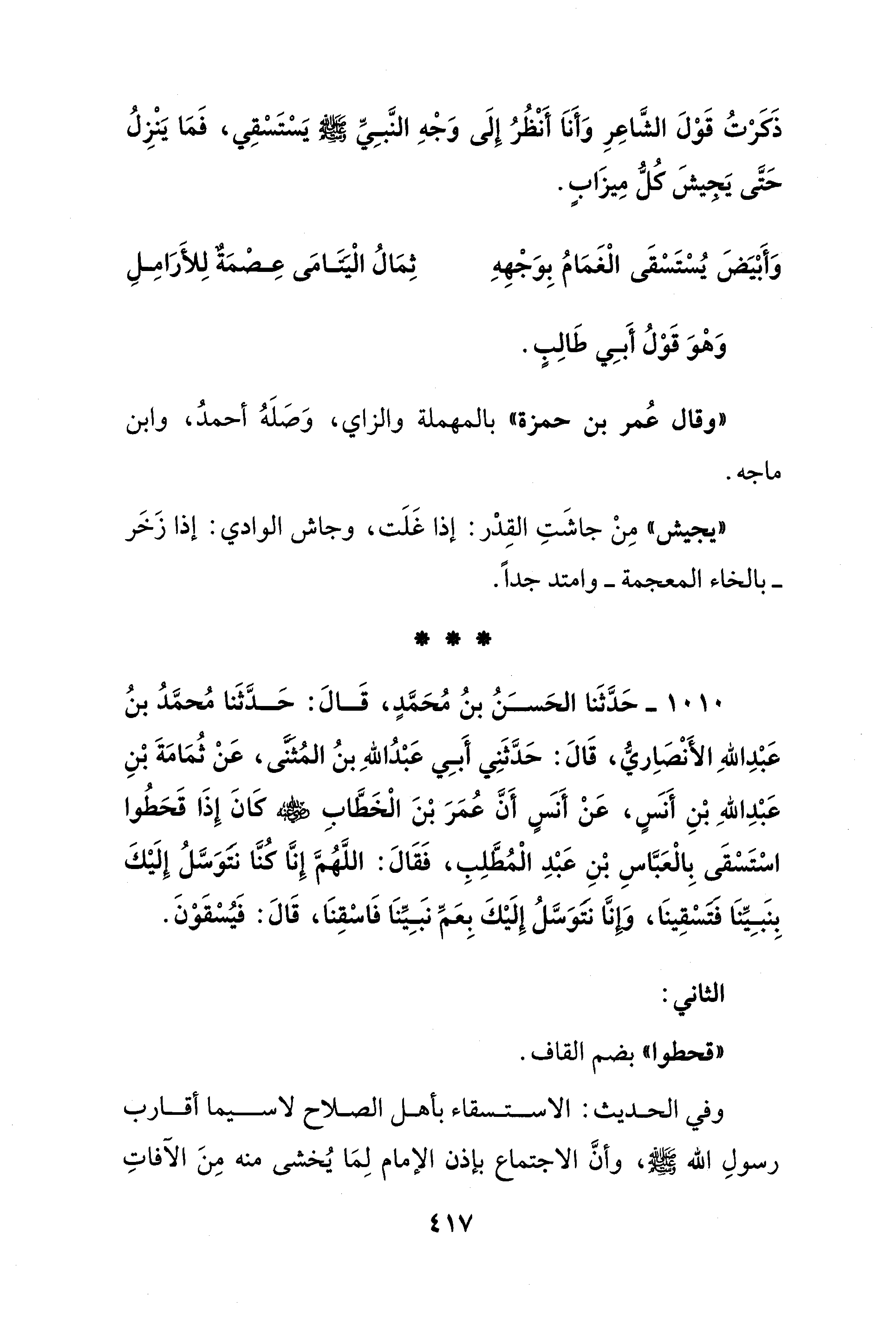 1010 - حَدَّثَنا الحَسَنُ بنُ مُحَمَّدٍ، قَالَ: حَدَّثَنا مُحمَّدُ بنُ عَبْدِ اللهِ الأَنْصَاِريُّ، قَالَ: حَدَّثَنِي أَبِي عَبْدُ اللهِ بنُ المُثَنَّى، عَنْ ثُمَامَةَ بْنِ عَبْدِ اللهِ بْنِ أَنسٍ، عَنْ أَنسٍ أَنَّ عُمَرَ بْنَ الْخَطَّابِ - رضي الله عنه - كَانَ إِذَا قَحَطُوا اسْتَسْقَى بِالْعَبَّاسِ بْنِ عَبْدِ الْمُطَّلِبِ، فَقَالَ: اللَّهُمَّ إِنَّا كنَّا نتَوَسَّلُ إِلَيْكَ بِنَبِيِّنَا فتسْقِينَا، وَإِنَّا نتَوَسَّلُ إِلَيْكَ بِعَمِّ نبَيِّنَا فَاسْقِنَا، قَالَ: فَيُسْقَوْنَ.