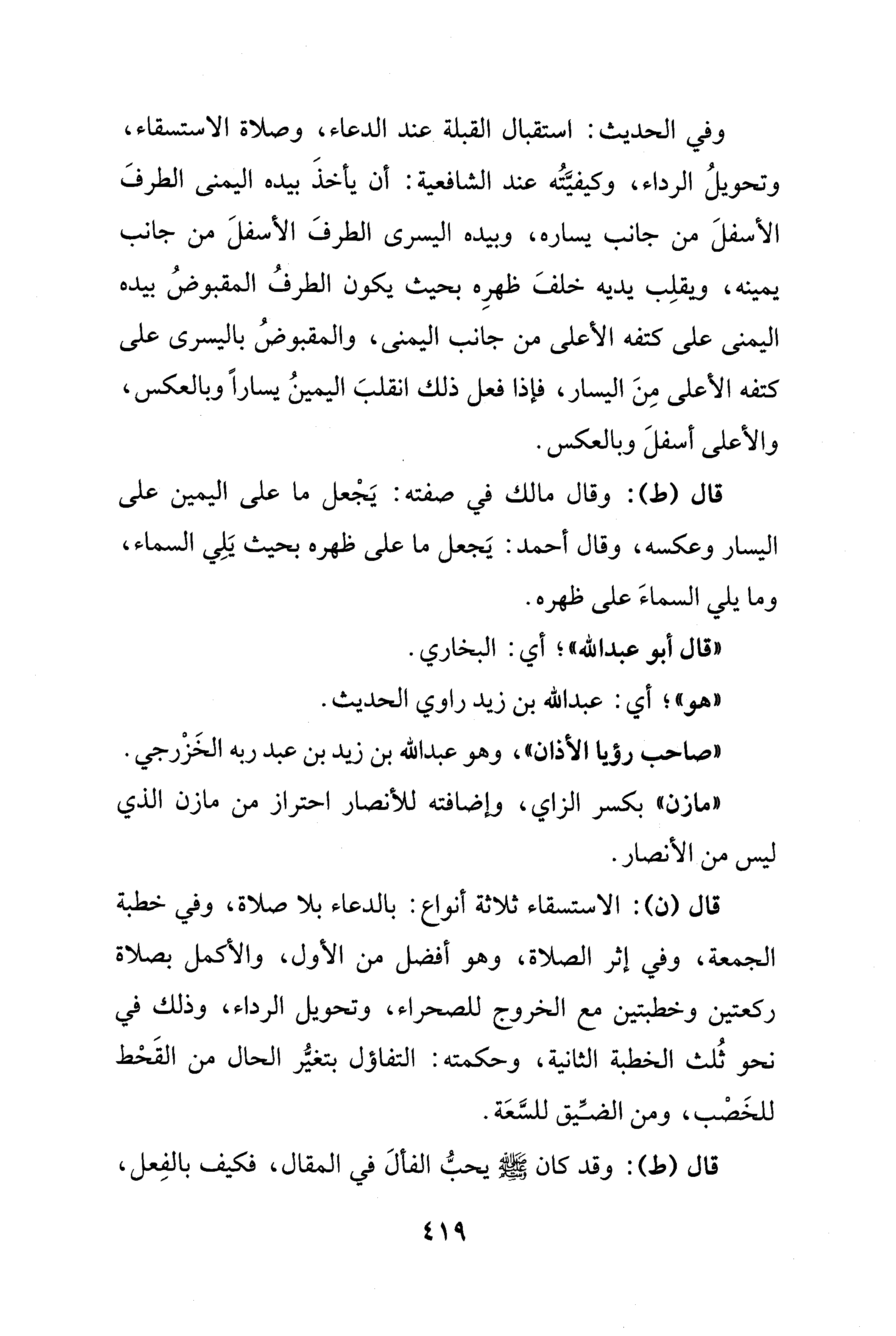 وفي الحديث: استقبال القبلة عند الدعاء، وصلاة الاستسقاء، وتحويلُ الرداء، وكيفيَّتُه عند الشافعية: أن يأخذَ بيده اليمنى الطرفَ الأسفلَ من جانب يساره، وبيده اليسرى الطرفَ الأسفلَ من جانب يمينه، ويقلِب يديه خلفَ ظهرِه بحيث يكون الطرفُ المقبوضُ بيده اليمنى على كتفه الأعلى من جانب اليمنى، والمقبوضُ باليسرى على كتفه الأعلى مِنَ اليسار، فإذا فعل ذلك انقلبَ اليمينُ يسارًا وبالعكس، والأعلى أسفلَ وبالعكس.