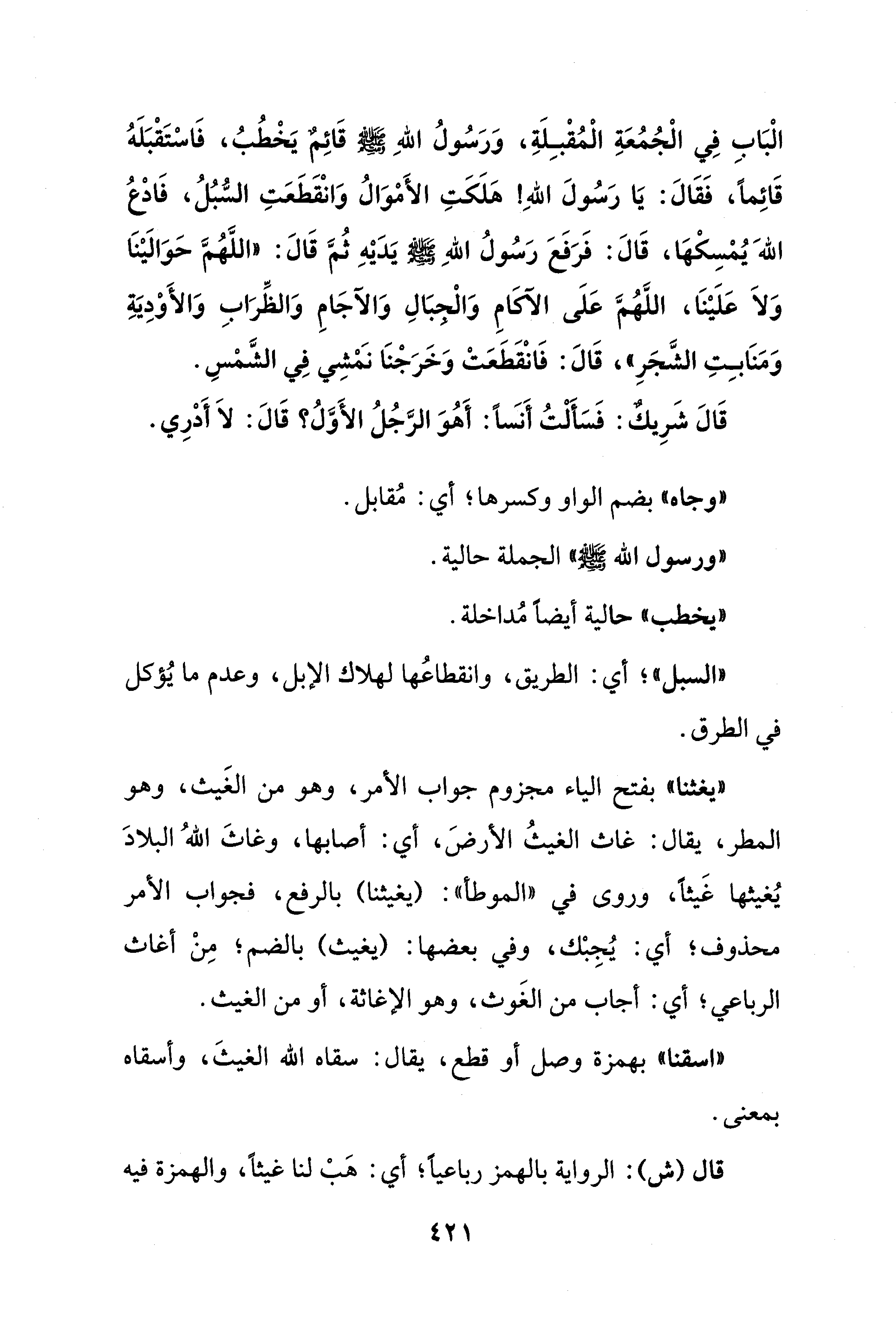 الْبَابِ فِي الْجُمُعَةِ الْمُقْبِلَةِ، وَرَسُولُ اللهِ - صلى الله عليه وسلم - قَائِمٌ يَخْطُبُ، فَاسْتَقْبَلَهُ قَائِمًا، فَقَالَ: يَا رَسُولَ اللهِ! هَلَكَتِ الأَمْوَالُ وَانْقَطَعَتِ السُّبُلُ، فَادْعُ اللهَ يُمْسِكْهَا، قَالَ: فَرَفَعَ رَسُولُ اللهِ - صلى الله عليه وسلم - يَدَيْهِ ثُمَّ قَالَ: "اللَّهُمَّ حَوَالَيْنَا وَلاَ عَلَيْنَا، اللَّهُمَّ عَلَى الآكَامِ وَالْجبَالِ وَالآجَامِ وَالظِّرَابِ وَالأَوْدِيَةِ وَمَنَابِتِ الشَّجَرِ"، قَالَ: فَانْقَطَعَتْ وَخَرَجْنَا نَمْشِي فِي الشَّمْسِ.