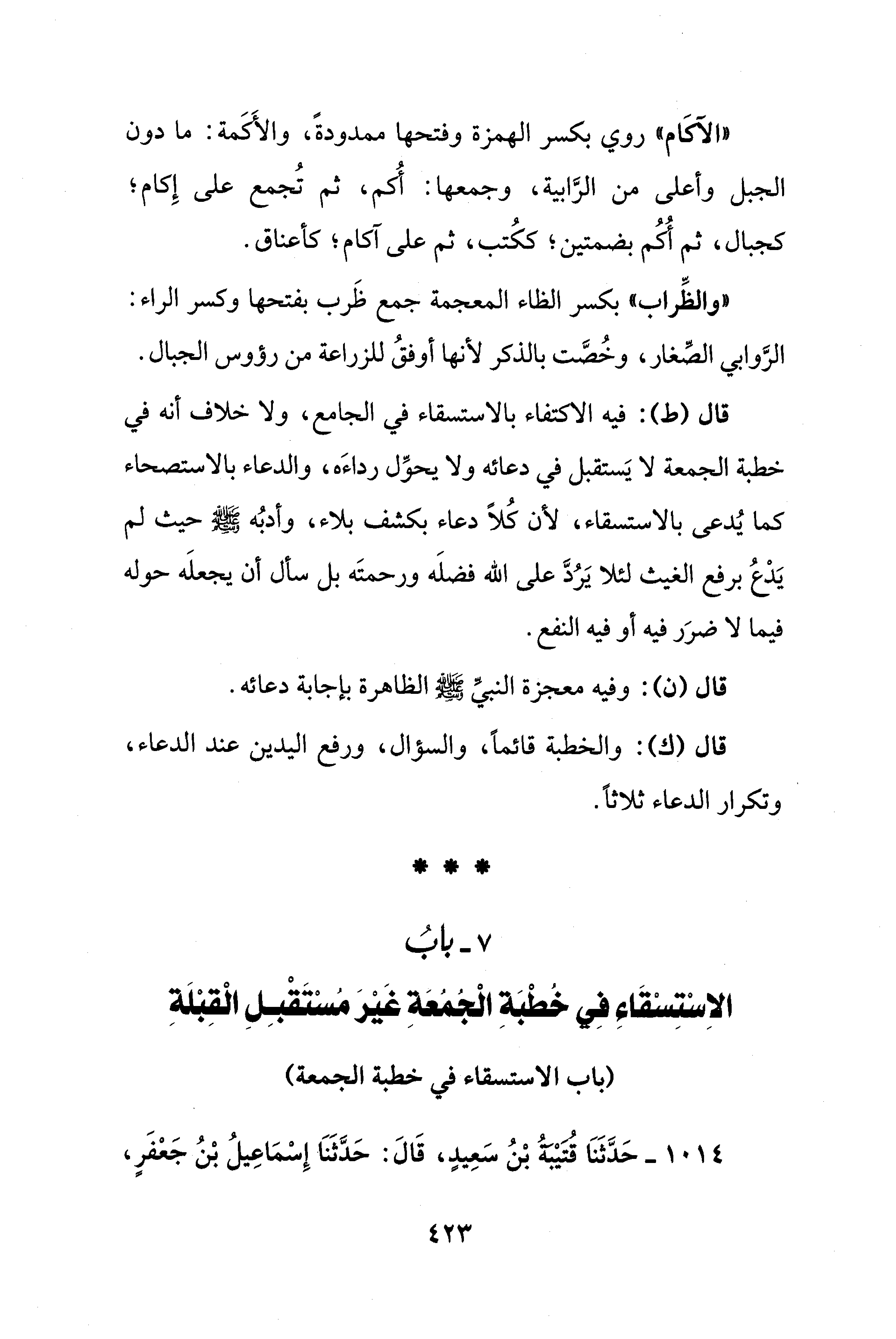 قال (ك): والخطبة قائمًا، والسؤال، ورفع اليدين عند الدعاء، وتكرار الدعاء ثلاثًا.