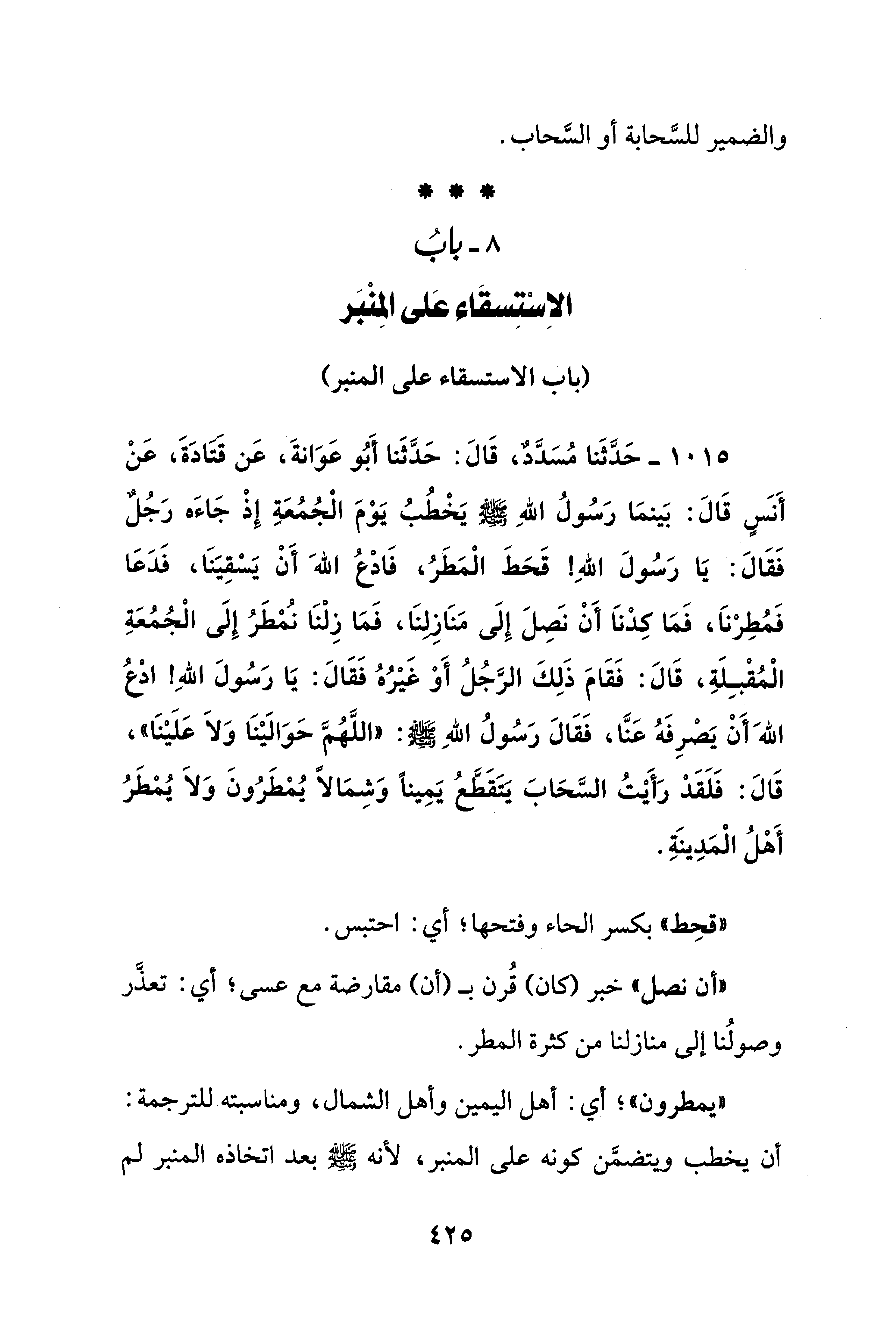 1015 - حَدَّثَنا مُسَدَّدٌ، قَالَ: حَدَّثَنا أَبُو عَوَانةَ، عَن قتادَةَ، عَنْ أَنسٍ قَالَ: بَينمَا رَسُولُ اللهِ - صلى الله عليه وسلم - يَخْطُبُ يَوْمَ الْجُمُعَةِ إِذْ جَاءَه رَجُلٌ فَقَالَ: يَا رَسُولَ اللهِ! قَحَطَ الْمَطَرُ، فَادْعُ اللهَ أَنْ يَسْقِيَنَا، فَدَعَا فَمُطِرْناَ، فَمَا كِدْناَ أَنْ نَصِلَ إِلَى مَنَازِلِنَا، فَمَا زِلْنَا نُمْطَرُ إِلَى الْجُمُعَةِ الْمُقْبِلَةِ، قَالَ: فَقَامَ ذَلِكَ الرَّجُلُ أَوْ غَيْرُهُ فَقَالَ: يَا رَسُولَ اللهِ! ادْعُ اللهَ أَنْ يَصْرِفَهُ عَنَّا، فَقَالَ رَسُولُ اللهِ - صلى الله عليه وسلم -: "اللَّهُمَّ حَوَالَيْنَا وَلاَ عَلَيْنَا"، قَالَ: فَلَقَدْ رَأَيْتُ السَّحَابَ يَتَقَطَّعُ يَمِينًا وَشِمَالًا يُمْطَرُونَ وَلاَ يُمْطَرُ أَهْلُ الْمَدِينَةِ.