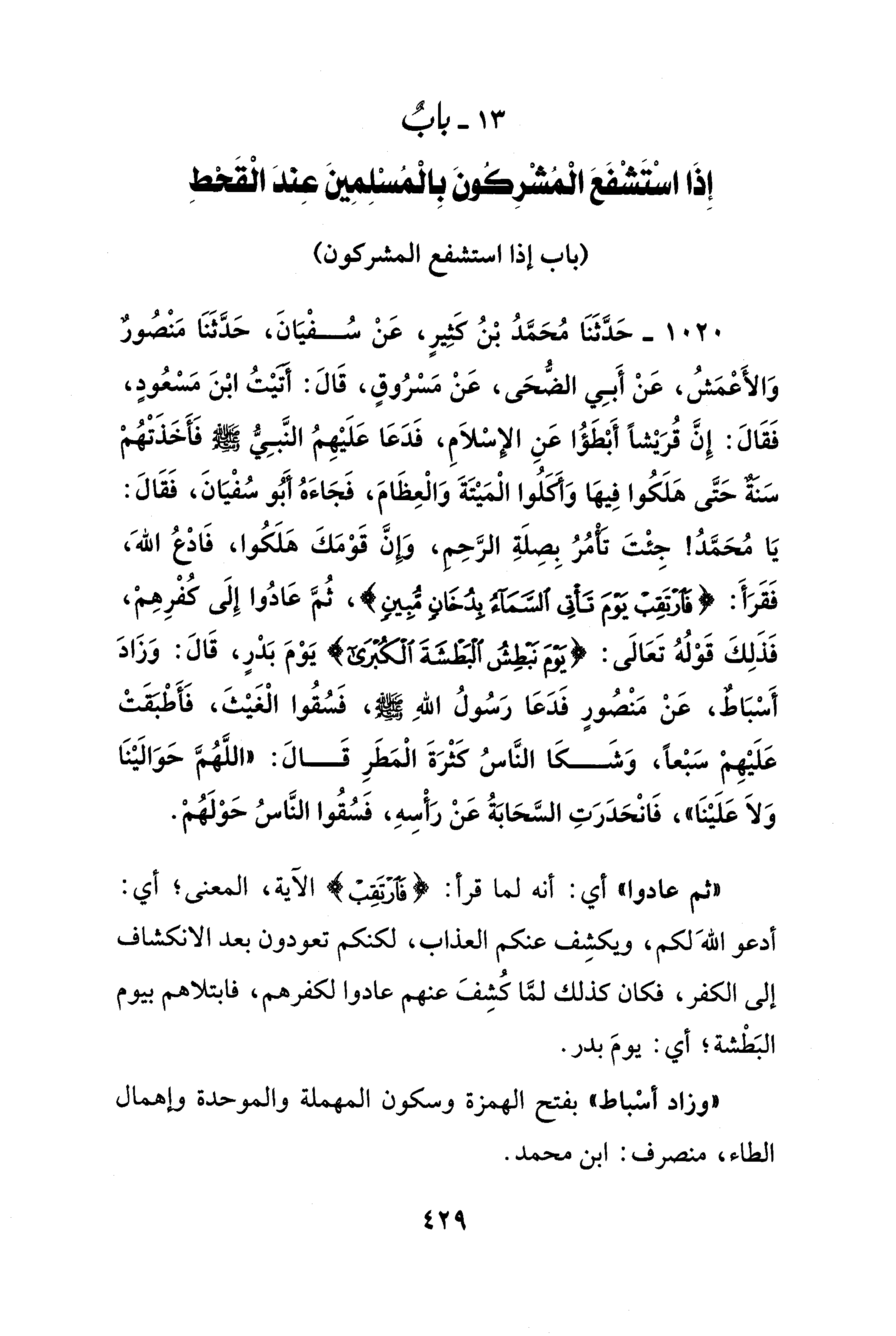 1020 - حَدَّثَنَا مُحَمَّدُ بنُ كَثِيرٍ، عَنْ سُفْيَانَ، حَدَّثَنَا مَنْصُورٌ وَالأَعْمَشُ، عَنْ أَبِي الضُّحَى، عَنْ مَسْرُوقٍ، قَالَ: أَتَيْتُ ابْنَ مَسْعُودٍ، فَقَالَ: إِنَّ قُرَيْشًا أَبْطَؤُا عَنِ الإِسْلاَمِ، فَدَعَا عَلَيْهِمُ النَّبِيُّ - صلى الله عليه وسلم - فَأَخَذَتْهُمْ سَنَةٌ حَتَّى هَلَكُوا فِيهَا وَأَكَلُوا الْمَيْتَةَ وَالْعِظَامَ، فَجَاءَهُ أَبُو سُفْيَانَ، فَقَالَ: يَا مُحَمَّدُ! جِئْتَ تَأْمُرُ بِصِلَةِ الرَّحِمِ، وَإِنَّ قَوْمَكَ هَلَكُوا، فَادْع اللهَ، فَقَرَأَ: {فَارْتَقِبْ يَوْمَ تَأْتِي السَّمَاءُ بِدُخَانٍ مُبِينٍ}، ثُمَّ عَادُوا إِلَى كُفْرِهِمْ، فَذَلِكَ قَوْلُهُ تَعَالَى: {يَوْمَ نَبْطِشُ الْبَطْشَةَ الْكُبْرَى} يَوْمَ بَدْرٍ، قَالَ: وَزَادَ أَسْبَاطٌ، عَنْ مَنْصُورٍ فَدَعَا رَسُولُ اللهِ - صلى الله عليه وسلم -، فَسُقُوا الْغَيْثَ، فَأَطْبَقَتْ عَلَيْهِمْ سَبْعًا، وَشَكَا النَّاسُ كَثْرَةَ الْمَطَرِ قَالَ: "اللَّهُمَّ حَوَالَيْنَا وَلاَ عَلَيْنَا"، فَانْحَدَرَتِ السَّحَابَةُ عَنْ رَأْسِهِ، فَسُقُوا النَّاسُ حَوْلَهُمْ.