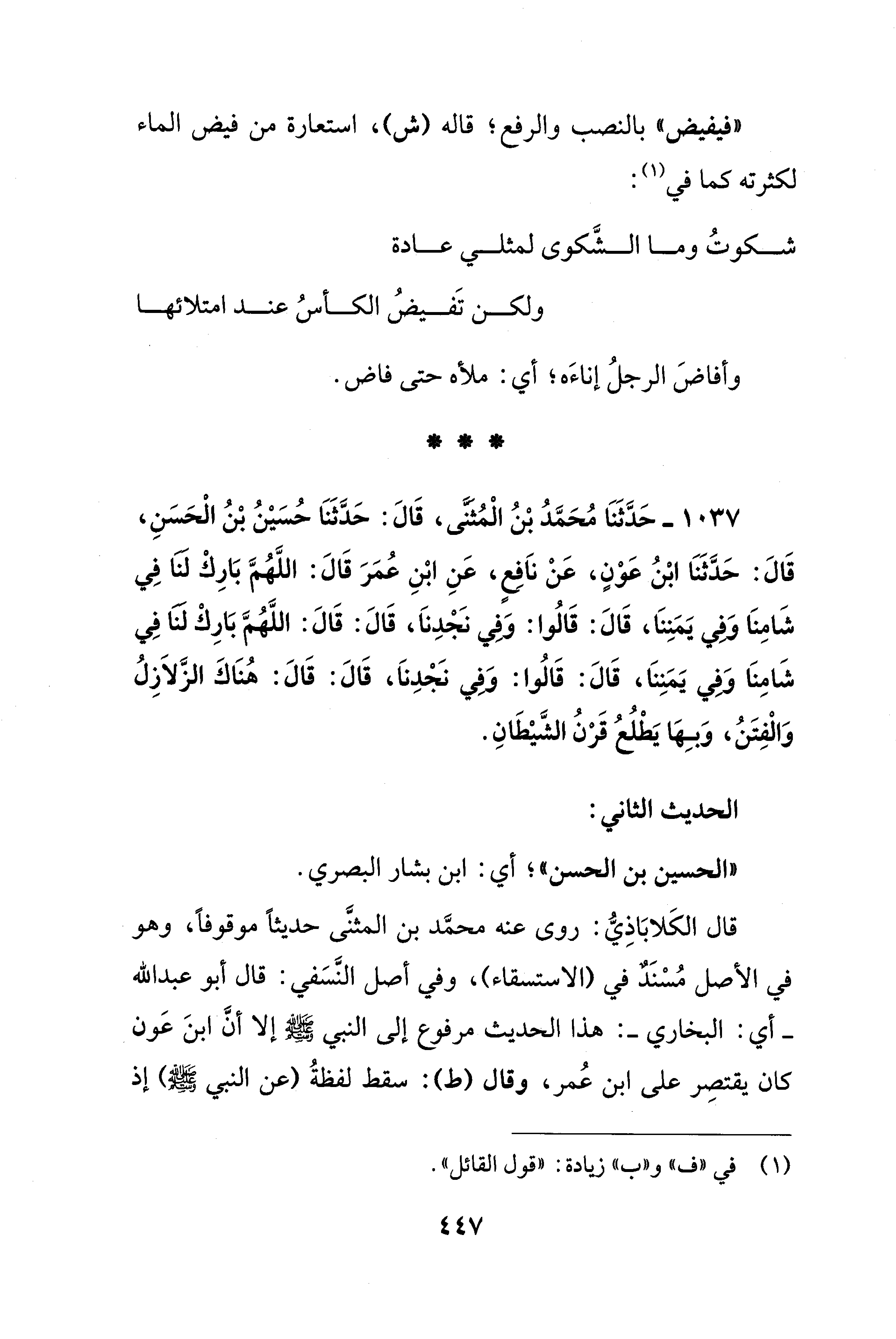 1037 - حَدَّثَنَا مُحَمَّدُ بْنُ الْمُثَنَّى، قَالَ: حَدَّثَنَا حُسَيْنُ بْنُ الْحَسَنِ، قَالَ: حَدَّثَنَا ابْنُ عَوْنٍ، عَنْ ناَفِعٍ، عَنِ ابْنِ عُمَرَ قَالَ: اللَّهُمَّ بَارِكْ لنا فِي شَامِنَا وَفِي يَمَنِنَا، قَالَ: قَالُوا: وَفِي نَجْدِناَ، قَالَ: قَالَ: اللَّهُمَّ بَارِكْ لنا فِي شَامِنَا وَفِي يَمَنِنَا، قَالَ: قَالُوا: وَفِي نَجْدِناَ، قَالَ: قَالَ: هُنَاكَ الزَّلاَزِلُ وَالْفِتَنُ، وَبِهَا يَطْلُعُ قَرْنُ الشَّيْطَانِ.