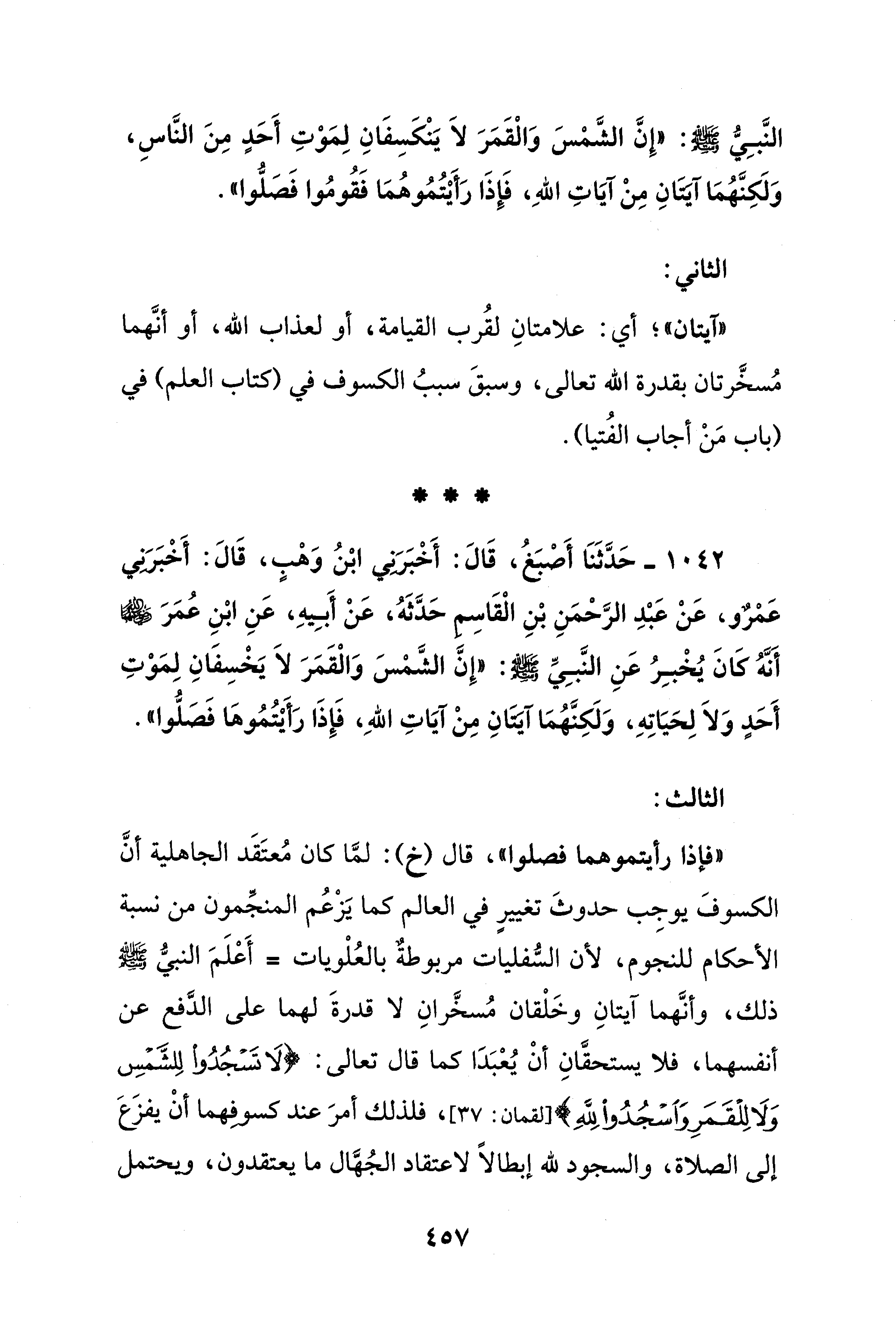 1042 - حَدَّثَنَا أَصْبَغُ، قَالَ: أَخْبَرَنِي ابْنُ وَهْبٍ، قَالَ: أَخْبَرَنِي عَمْرٌو، عَنْ عَبْدِ الرَّحْمَنِ بْنِ الْقَاسِمِ حَدَّثَهُ، عَنْ أَبِيهِ، عَنِ ابْنِ عُمَرَ - رضي الله عنهما - أَنَّهُ كَانَ يُخْبِرُ عَنِ النَّبِيِّ - صلى الله عليه وسلم -: "إِنَّ الشَّمْسَ وَالْقَمَرَ لاَ يَخْسِفَانِ لِمَوْتِ أَحَدٍ وَلاَ لِحَيَاتِهِ، وَلَكِنَّهُمَا آيَتَانِ مِنْ آيَاتِ اللهِ، فَإِذَا رَأَيْتُمُوهَا فَصَلُّوا".