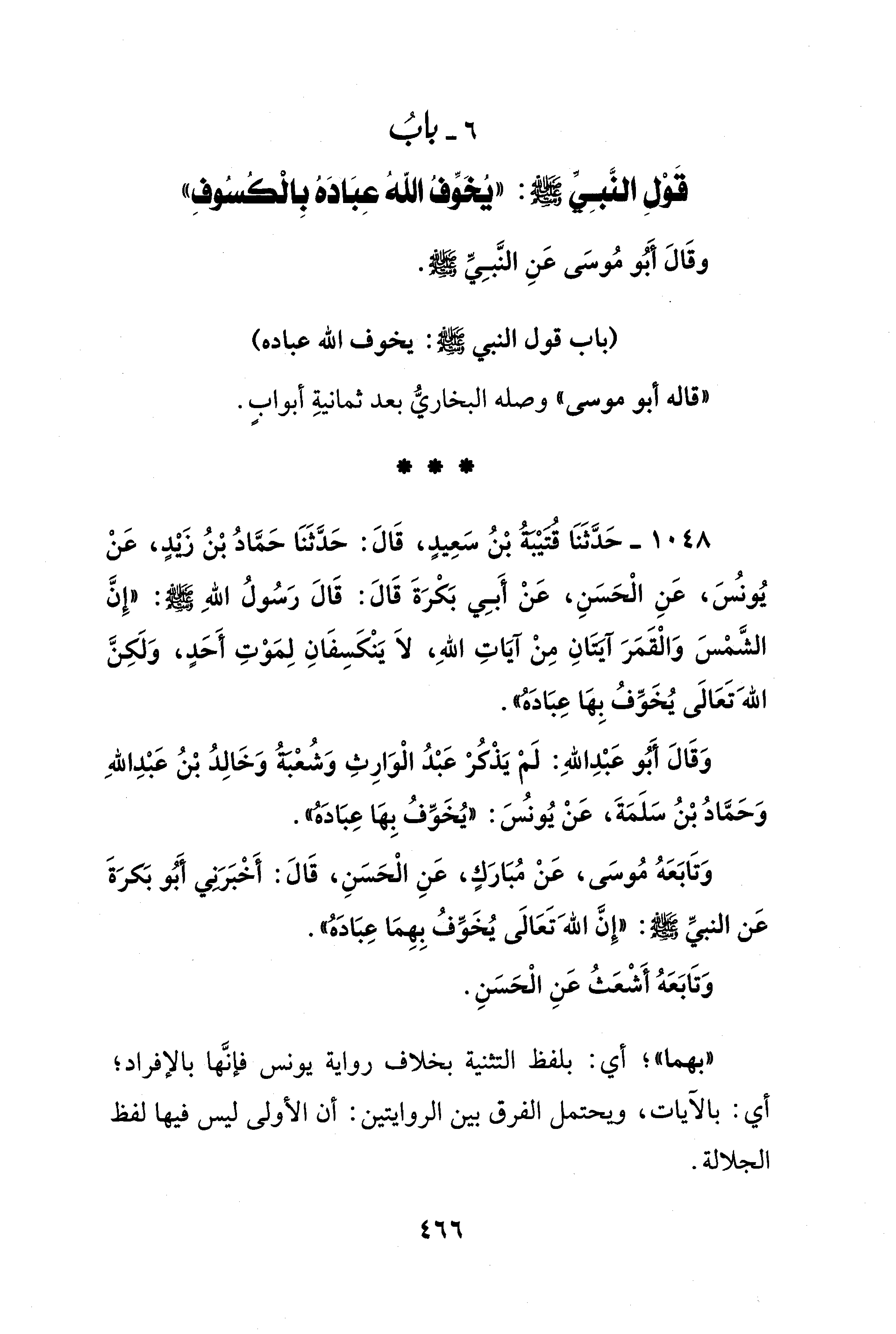 1048 - حَدَّثَنَا قُتيْبَةُ بْنُ سَعِيدٍ، قَالَ: حَدَّثَنَا حَمَّادُ بْنُ زَيْدٍ، عَنْ يُونُسُ، عَنِ الْحَسَنِ، عَنْ أَبِي بَكْرَةَ قَالَ: قَالَ رَسُولُ اللهِ - صلى الله عليه وسلم -: "إِنَّ الشَّمْسَ وَالْقَمَرَ آيَتَانِ مِنْ آيَاتِ اللهِ، لاَ يَنْكَسِفَانِ لِمَوْتِ أَحَدٍ، وَلَكِنَّ اللهَ تَعَالَى يُخَوِّفُ بِهَا عِبَادَهُ".