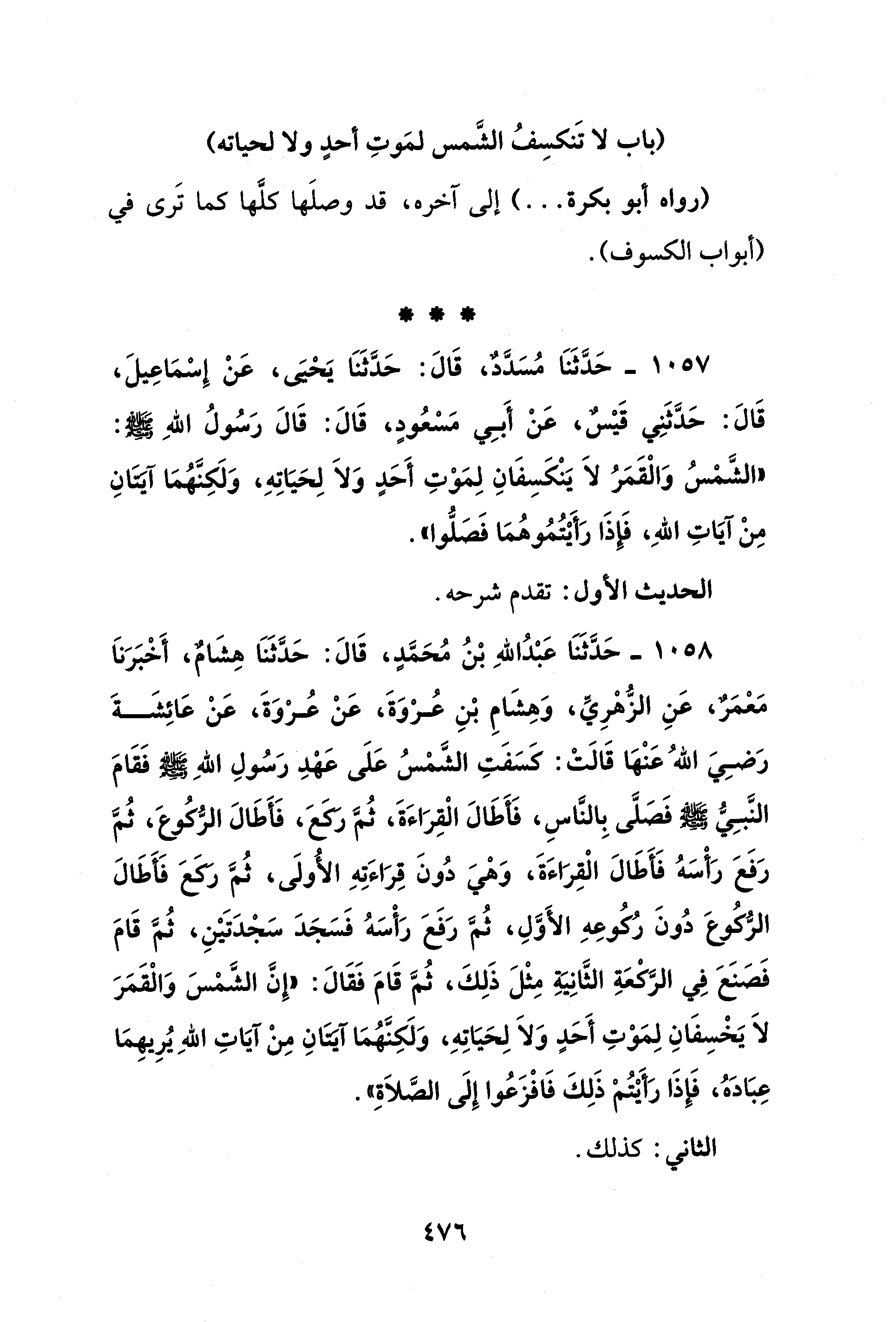 1058 - حَدَّثَنَا عَبْدُ اللهِ بْنُ مُحَمَّدٍ، قَالَ: حَدَّثَنَا هِشَامٌ، أَخْبَرَناَ مَعْمَرٌ، عَنِ الزُّهْرِيِّ، وَهِشَامِ بْنِ عُرْوَةَ، عَنْ عُرْوَةَ، عَنْ عَائِشَةَ رَضِيَ اللهُ عَنْهَا قَالَتْ: كَسَفَتِ الشَّمْسُ عَلَى عَهْدِ رَسُولِ اللهِ - صلى الله عليه وسلم - فَقَامَ النَّبِيُّ - صلى الله عليه وسلم - فَصَلَّى بِالنَّاسِ، فَأَطَالَ الْقِرَاءَةَ، ثُمَّ رَكَعَ، فَأَطَالَ الرُّكُوعَ، ثُمَّ رَفَعَ رَأْسَهُ فَأَطَالَ الْقِرَاءَةَ، وَهْيَ دُونَ قِرَاءَتِهِ الأُولَى، ثُمَّ رَكَعَ فَأَطَالَ الرُّكُوعَ دُونَ رُكُوعِهِ الأَوَّلِ، ثُمَّ رَفَعَ رَأْسَهُ فَسَجَدَ سَجْدَتَيْنِ، ثُمَّ قَامَ فَصَنَعَ فِي الرَّكْعَةِ الثَّانِيَةِ مِثْلَ ذَلِكَ، ثُمَّ قَامَ فَقَالَ: "إِنَّ الشَّمْسَ وَالْقَمَرَ لاَ يَخْسِفَانِ لِمَوْتِ أَحَدٍ وَلاَ لِحَيَاتِهِ، وَلَكِنَّهُمَا آيَتَانِ مِنْ آيَاتِ اللهِ يُرِيهِمَا عِبَادَهُ، فَإِذَا رَأَيْتُمْ ذَلِكَ فَافْزَعُوا إِلَى الصَّلاَةِ".