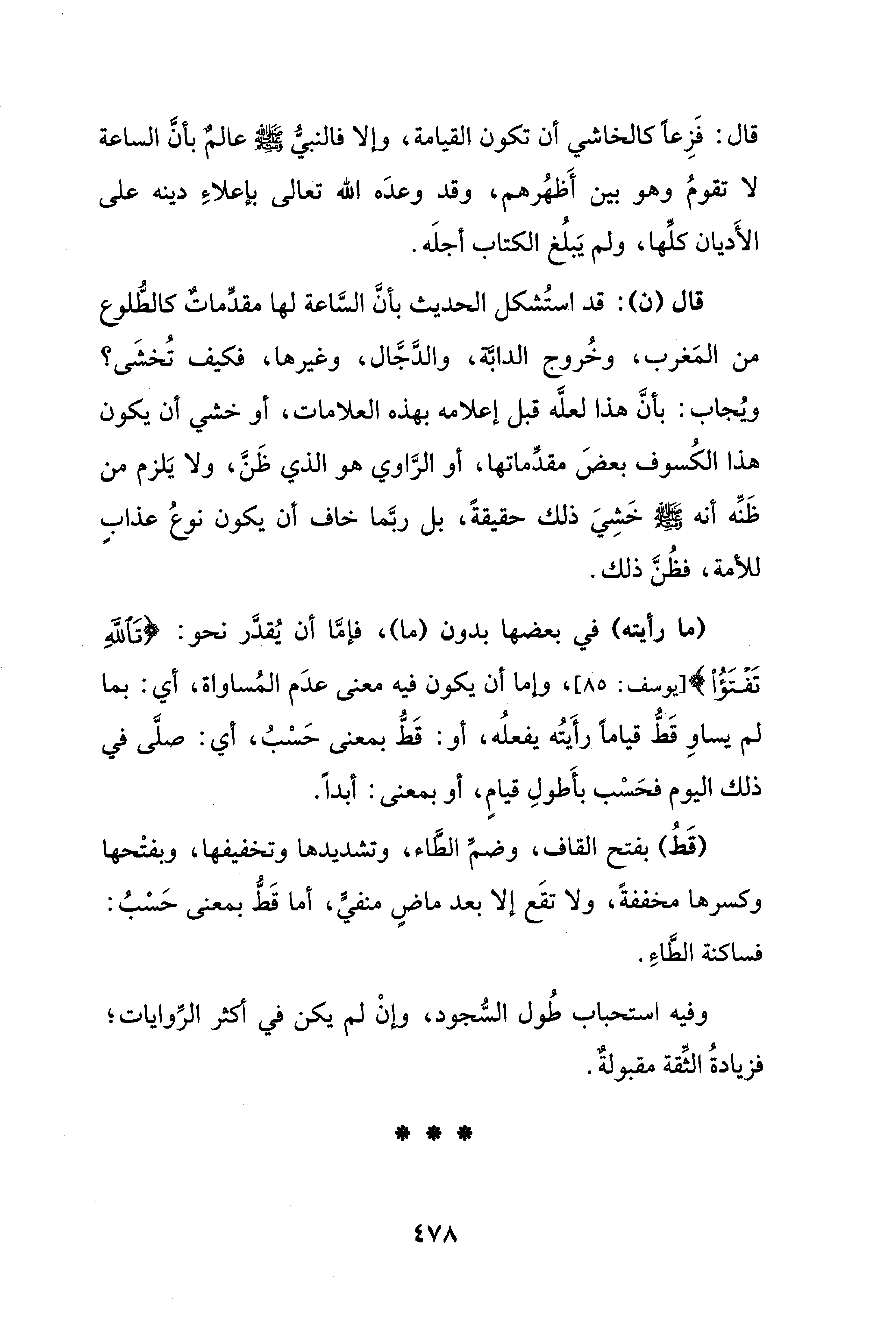 قال (ن): قد استُشكل الحديث بأنَّ السَّاعة لها مقدِّماتٌ كالطُّلوع من المَغرب، وخُروج الدابَّة، والدَّجَّال، وغيرها، فكيف تُخشَى؟ ويُجاب: بأنَّ هذا لعلَّه قبل إعلامه بهذه العلامات، أو خشي أن يكون هذا الكُسوف بعضَ مقدِّماتها، أو الرَّاوي هو الذي ظَنَّ، ولا يَلزم من ظَنِّه أنه - صلى الله عليه وسلم - خَشِيَ ذلك حقيقةً، بل ربما خاف أن يكون نوعُ عذابٍ للأمة، فظُنَّ ذلك.