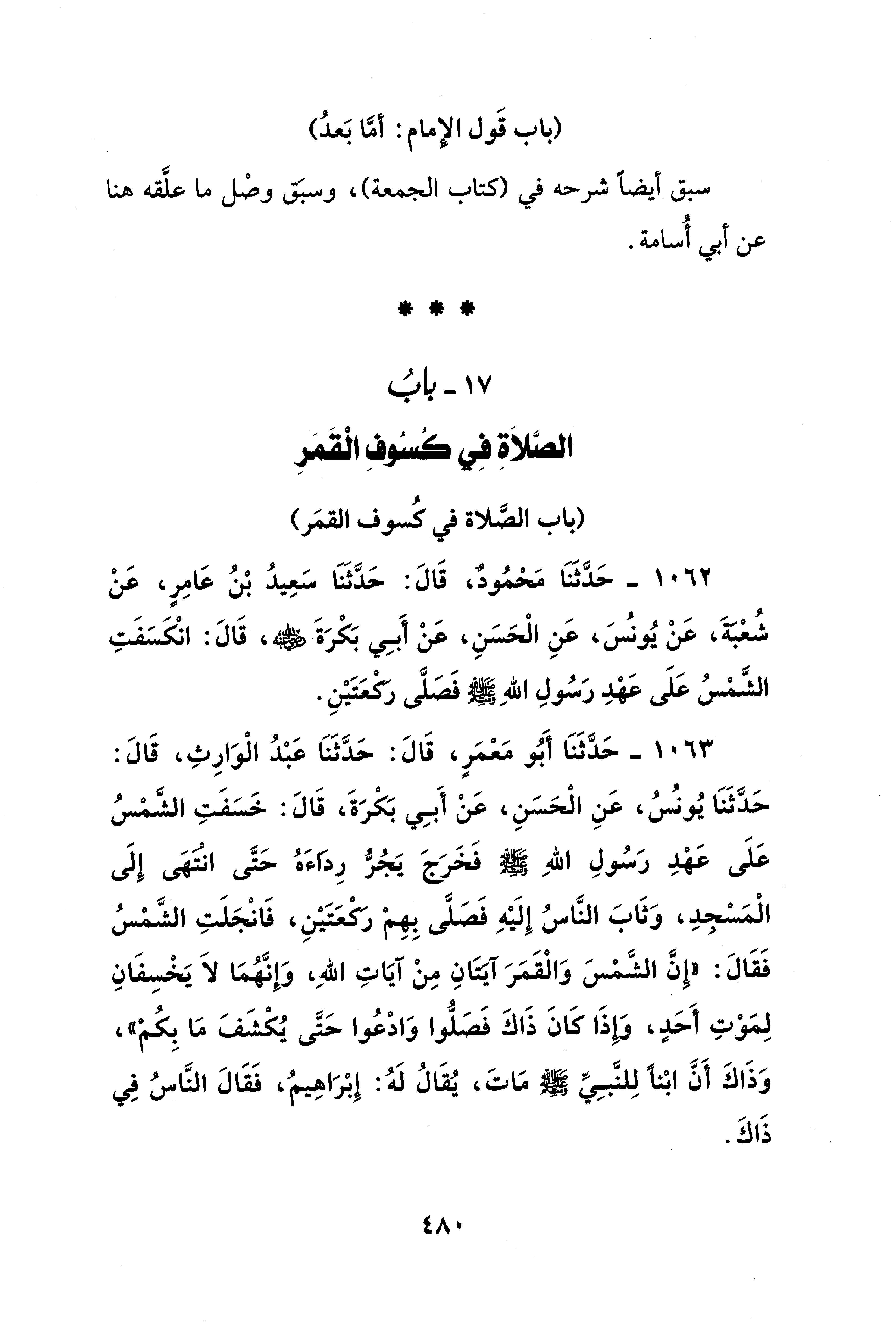 1062 - حَدَّثَنَا مَحْمُودٌ، قَالَ: حَدَّثَنَا سَعِيدُ بْنُ عَامِرٍ، عَنْ شعبة، عَنْ يُونُسَ، عَنِ الْحَسَنِ، عَنْ أَبِي بَكْرَةَ - رضي الله عنه -، قَالَ: انْكَسَفَتِ الشَّمْسُ عَلَى عَهْدِ رَسُولِ اللهِ - صلى الله عليه وسلم - فَصَلَّى ركعَتَيْنِ.