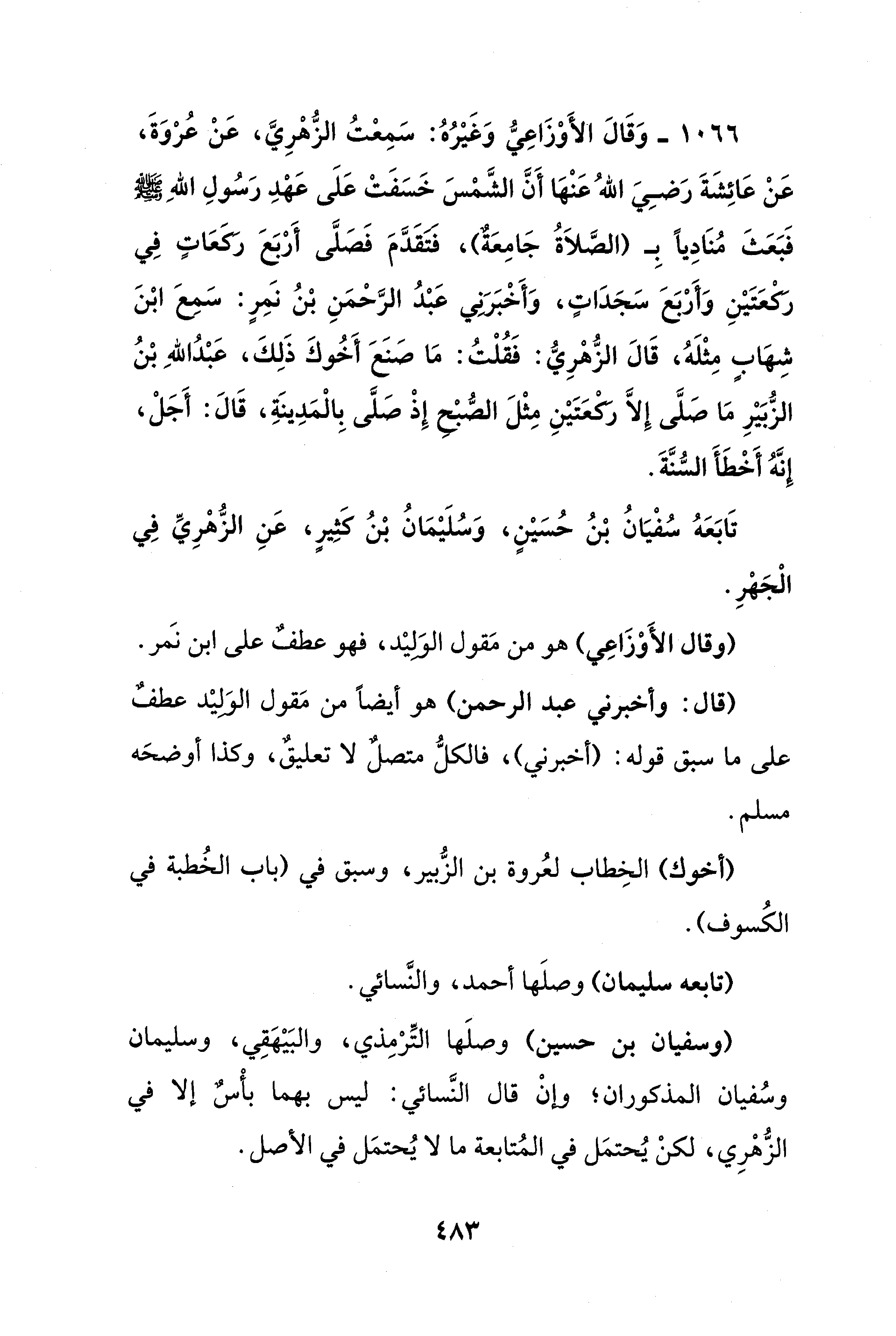 1066 - وَقَالَ الأَوْزَاعيِ وَغَيْرُهُ: سَمِعْتُ الزُّهْرِيَّ، عَنْ عُرْوَةَ، عَنْ عَائِشَةَ رَضِيَ اللهُ عَنْهَا أَنَّ الشَّمْسَ خَسَفَتْ عَلَى عَهْدِ رَسُولِ اللهِ - صلى الله عليه وسلم - فَبَعَثَ مُنَادِيًا بِـ (الصَّلاَةُ جَامِعَةٌ)، فتَقَدَّمَ فَصَلَّى أَرْبَعَ ركَعَاتٍ فِي ركعَتَيْنِ وَأَرْبَعَ سَجَدَاتٍ، وَأَخْبَرَني عَبْدُ الرَّحْمَنِ بْنُ نَمِرٍ: سَمِعَ ابْنَ شِهَابٍ مِثْلَهُ، قَالَ الزُّهْرِيُّ: فَقُلْتُ: مَا صَنَعَ أَخُوكَ ذَلِكَ، عَبْدُ اللهِ بْنُ الزُّبَيْرِ مَا صَلَّى إِلَّا ركعَتَيْنِ مِثْلَ الصُّبْح إِذْ صلَّى بِالْمَدِينَةِ، قَالَ: أَجَلْ، إِنَّهُ أَخْطَأ السُّنَّةَ.
