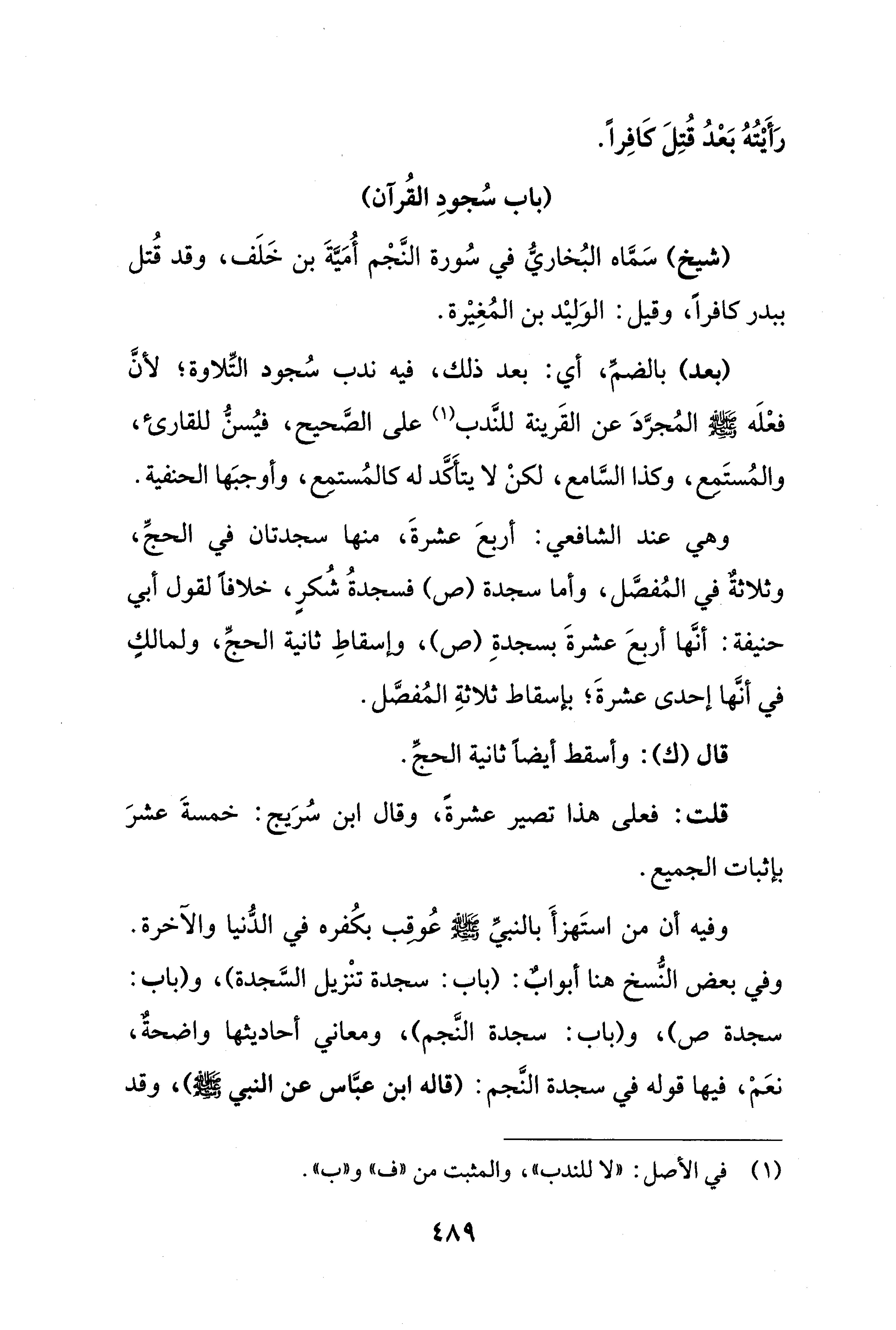 (بعد) بالضمِّ، أي: بعد ذلك، فيه ندب سُجود التِّلاوة؛ لأنَّ فعْلَه - صلى الله عليه وسلم - المُجرَّدَ عن القَرينة للنَّدب (¬1) على الصَّحيح، فيُسنُّ للقارئ، والمُستَمِع، وكذا السَّامع، لكنْ لا يتأكَّد له كالمُستمع، وأوجبَها الحنفية.