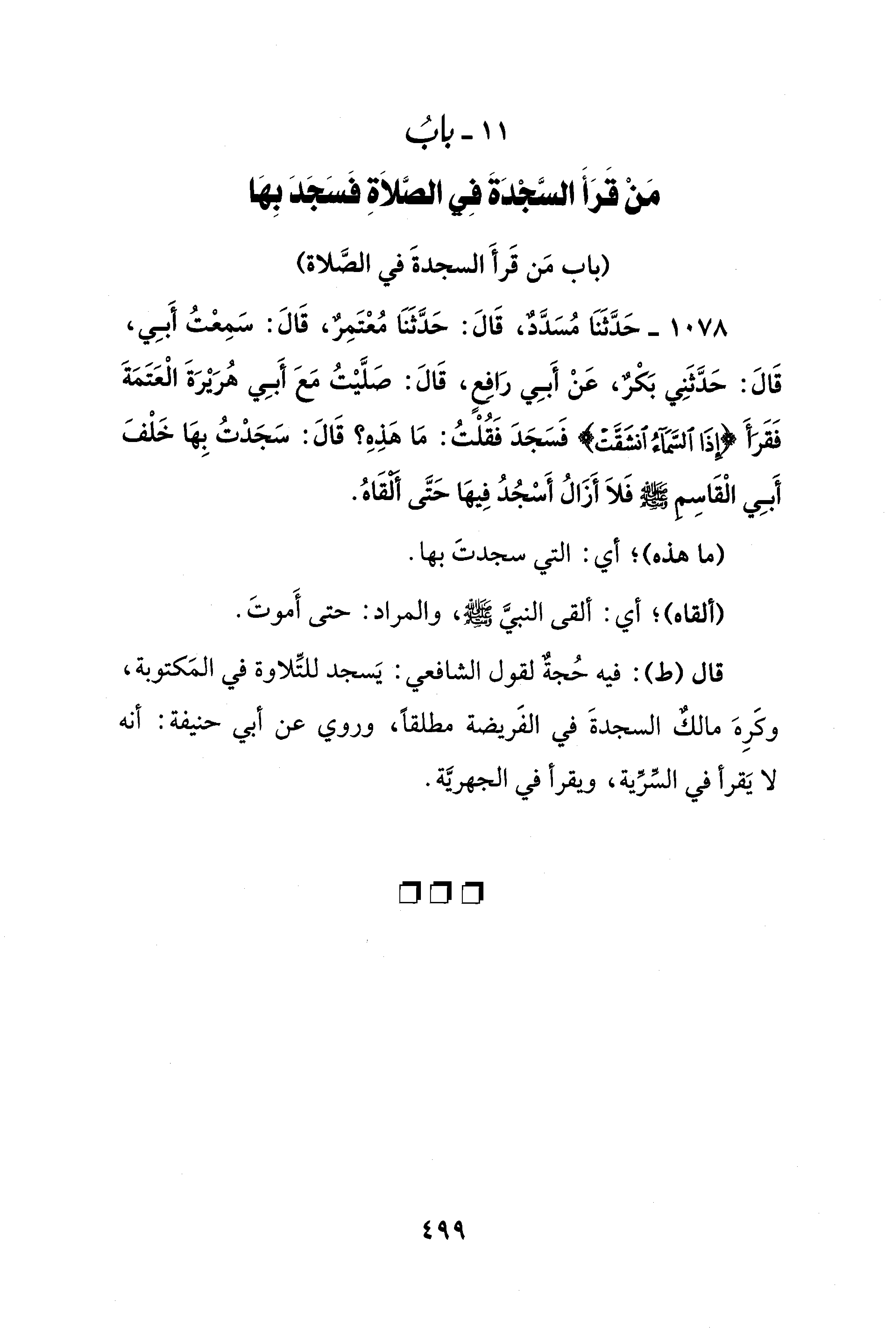 1078 - حَدَّثنا مُسَدَّدٌ، قَالَ: حَدَّثَنَا مُعْتَمِرٌ، قَالَ: سَمِعْتُ أَبِي، قَالَ: حَدَّثَنِي بَكْرٌ، عَنْ أَبِي رَافِعٍ، قالَ: صلَّيْتُ مَعَ أَبِي هُرَيْرَةَ الْعَتَمَةَ فَقَرَأَ {إِذَا السَّمَاءُ انْشَقَّتْ} [الانشقاق: 1] فَسَجَدَ فَقُلْتُ: مَا هَذِهِ؟ قَالَ: سَجَدْتُ بِهَا خَلْفَ أَبِي الْقَاسِم - صلى الله عليه وسلم - فَلاَ أَزَالُ أَسْجُدُ فِيهَا حَتَّى ألقَاهُ.