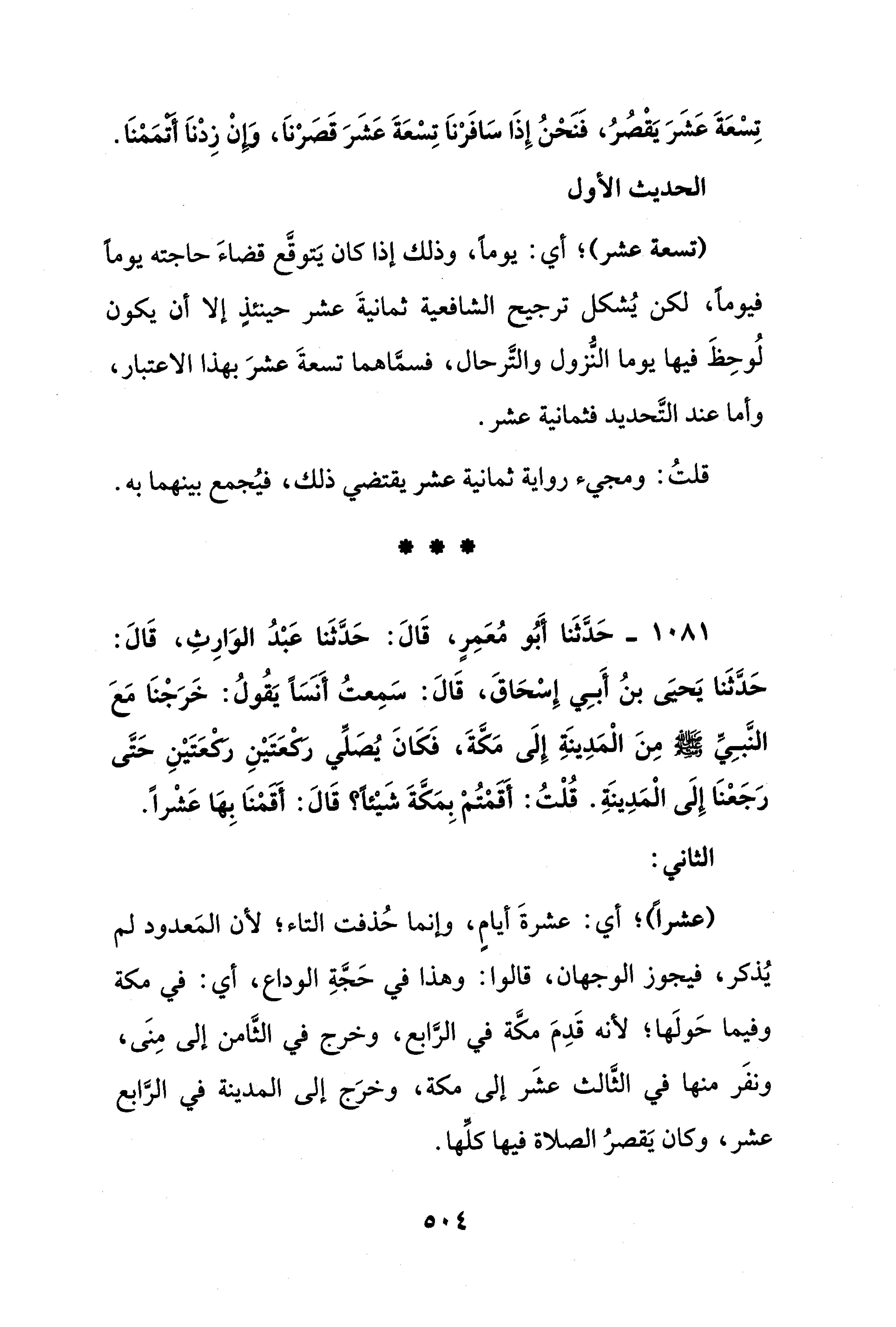 1081 - حَدَّثَنا أَبُو مُعَمِرٍ، قَالَ: حَدَّثَنا عَبْدُ الوَارِثِ، قَالَ: حَدَّثَنا يَحيَى بنُ أَبِي إِسْحَاقَ، قَالَ: سَمِعتُ أَنسًا يَقُولُ: خَرَجْنَا مَعَ النَّبِيِّ - صلى الله عليه وسلم - مِنَ الْمَدِينَةِ إِلَى مَكَّةَ، فَكَانَ يُصَلِّي رَكعَتَيْنِ رَكعَتَيْنِ حَتَّى رَجَعْنَا إِلَى الْمَدِينَةِ. قُلْتُ: أقمْتُمْ بِمَكَّةَ شَيْئًا؟ قَالَ: أَقَمْنَا بِهَا عَشْرًا.