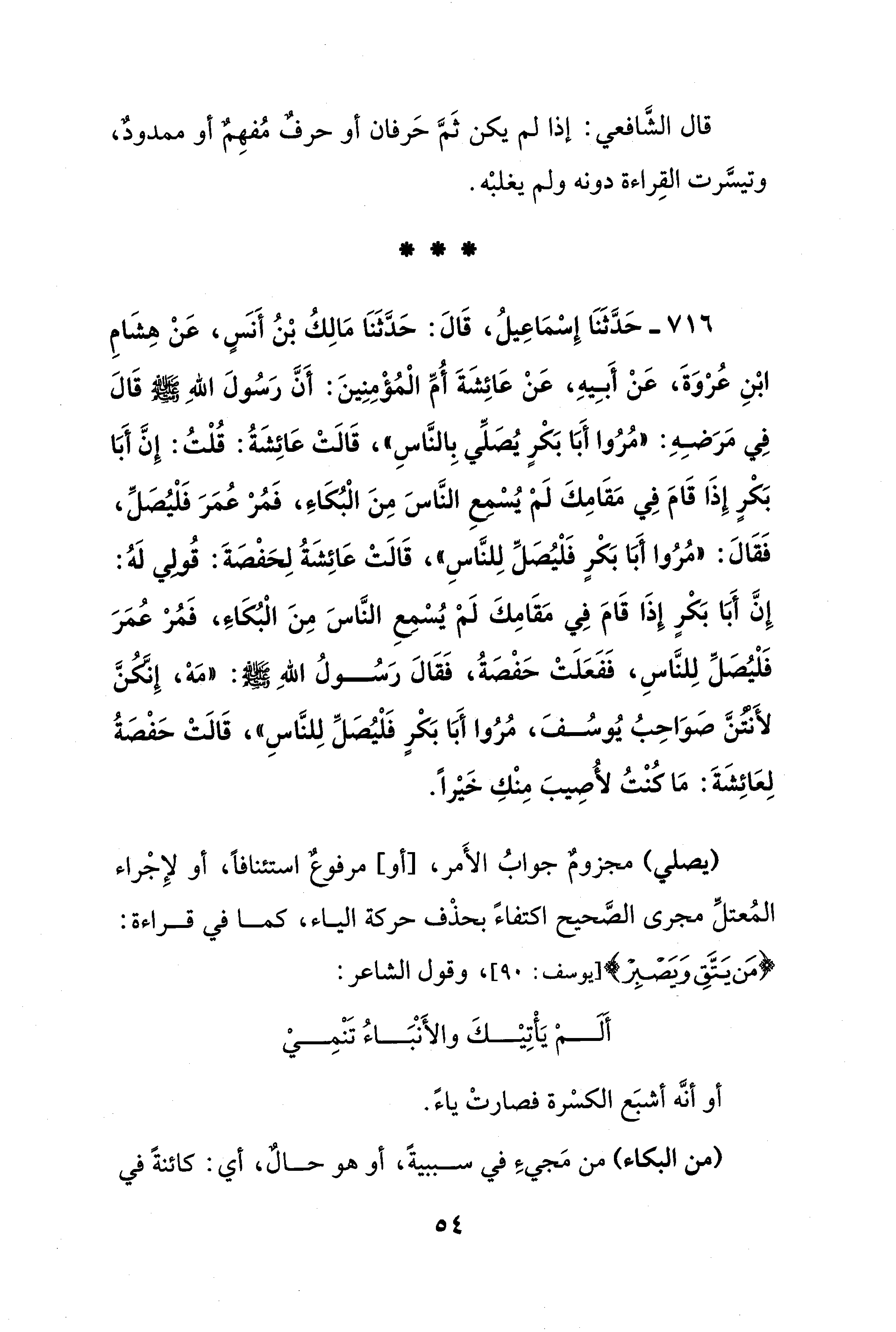 716 - حَدَّثَنَا إِسْمَاعِيلُ، قَالَ: حَدَّثَنَا مَالِكُ بْنُ أَنسٍ، عَنْ هِشَامِ ابْنِ عُرْوَةَ، عَنْ أَبِيهِ، عَنْ عَائِشَةَ أُمِّ الْمُؤْمِنِينَ: أَنَّ رَسُولَ اللهِ - صلى الله عليه وسلم - قَالَ فِي مَرَضِهِ: "مُرُوا أَبَا بَكْرٍ يُصَلِّي بِالنَّاسِ"، قَالَتْ عَائِشَةُ: قُلْتُ: إِنَّ أَبَا بَكْرٍ إِذَا قَامَ فِي مَقَامِكَ لَمْ يُسْمِعِ النَّاسَ مِنَ الْبُكَاءَ، فَمُرْ عُمَرَ فَلْيُصَلِّ، فَقَالَ: "مُرُوا أَبَا بَكْرٍ فَلْيُصَلِّ لِلنَّاسِ"، قَالَتْ عَائِشَةُ لِحَفْصَةَ: قُولي لَهُ: إِنَّ أَبَا بَكْرٍ إِذَا قَامَ فِي مَقَامِكَ لَمْ يُسْمِعِ النَّاسَ مِنَ الْبُكَاءَ، فَمُرْ عُمَرَ فَلْيُصَلِّ لِلنَّاسِ، فَفَعَلَتْ حَفْصَةُ، فَقَالَ رَسُولُ اللهِ - صلى الله عليه وسلم -: "مَهْ، إِنَّكنَّ لأَنتنَّ صَوَاحِبُ يُوسُفَ، مُرُوا أَبَا بَكْرٍ فَلْيُصَلِّ لِلنَّاسِ"، قَالَتْ حَفْصَةُ لِعَائِشَةَ: مَا كُنْتُ لأُصِيبَ مِنْكِ خَيْرًا.