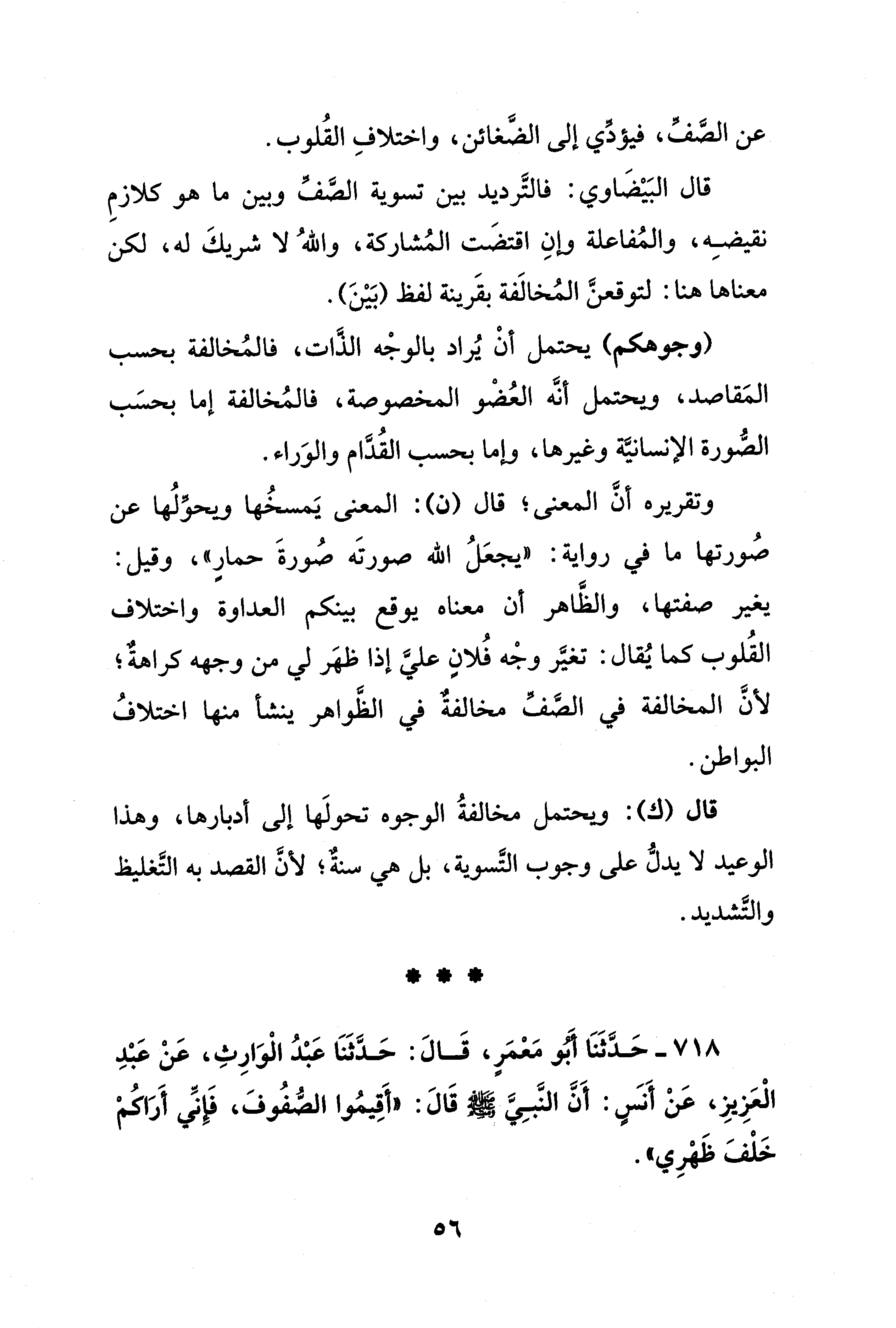 718 - حَدَّثَنَا أبو مَعْمَرٍ، قَالَ: حَدَّثَنَا عَبْدُ الْوَارِثِ، عَنْ عَبْدِ الْعَزِيزِ، عَنْ أَنسٍ: أَنَّ النَّبِيَّ - صلى الله عليه وسلم - قَالَ: "أقِيمُوا الصُّفُوفَ، فَإنِّي أَرَاكُمْ خَلْفَ ظَهْرِي".