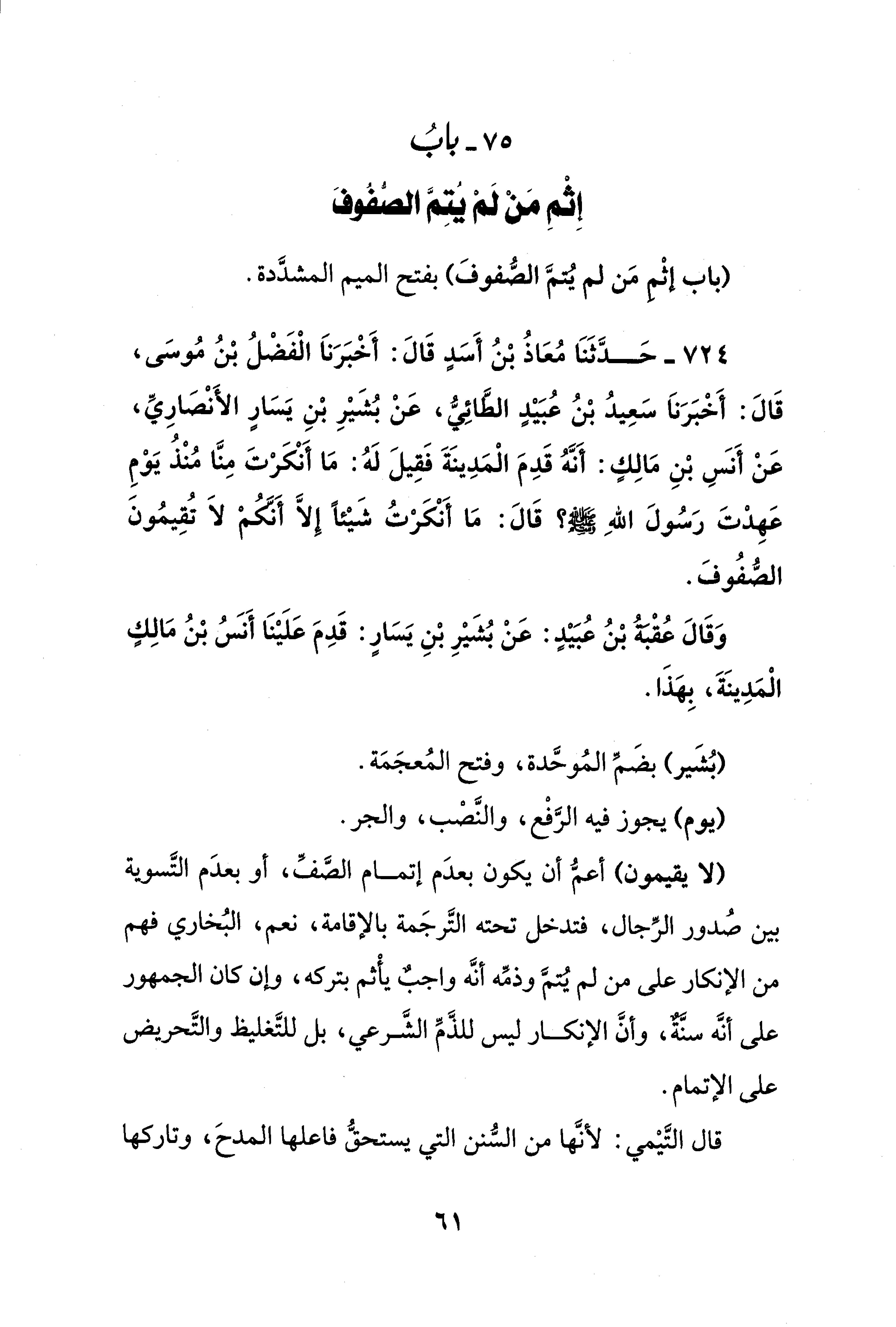 75 - بابُ إِثْمِ مَنْ لَمْ يُتِمَّ الصُّفُوفَ
