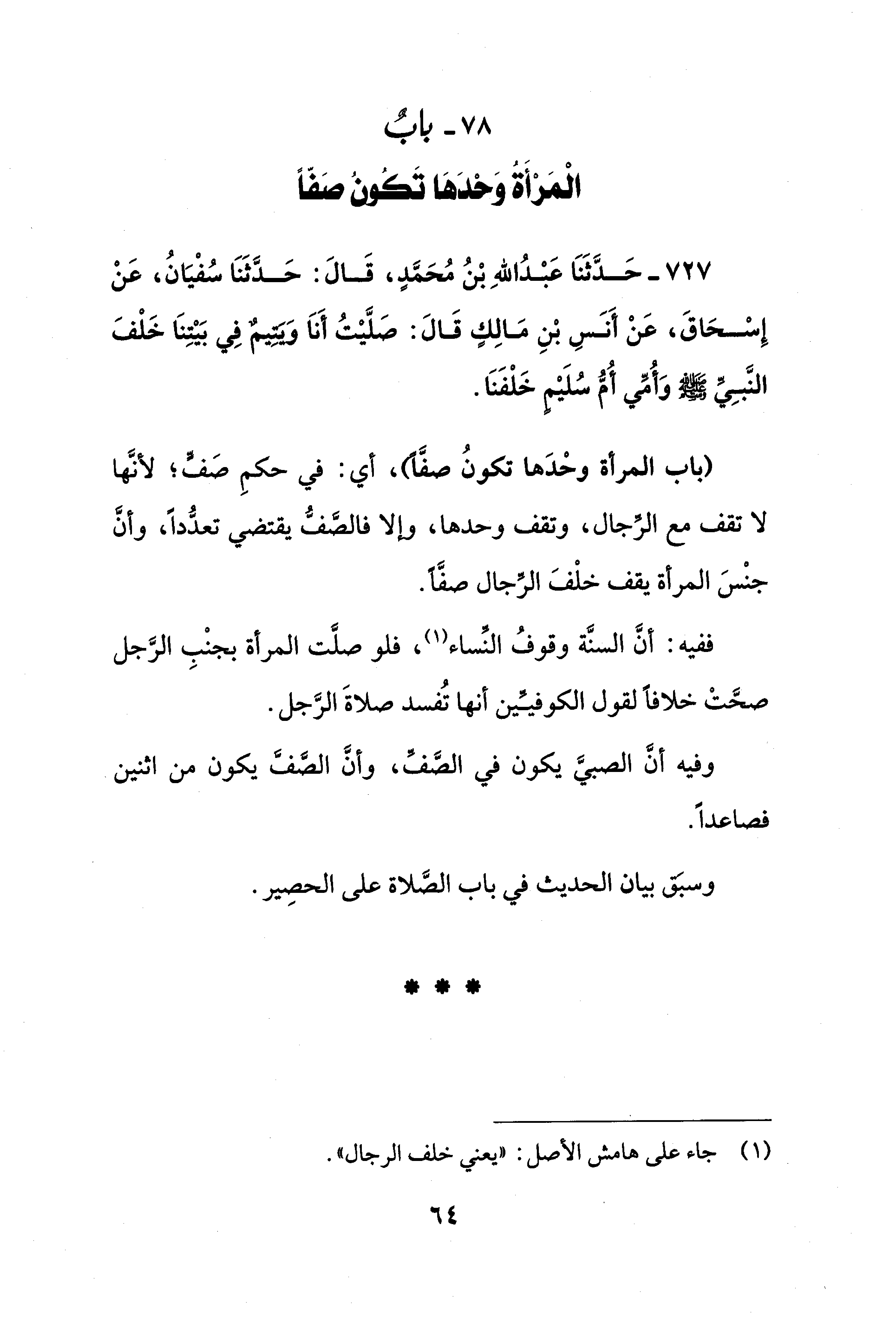 78 - بابٌ الْمَرْأةُ وَحْدَهَا تَكونُ صَفًّا