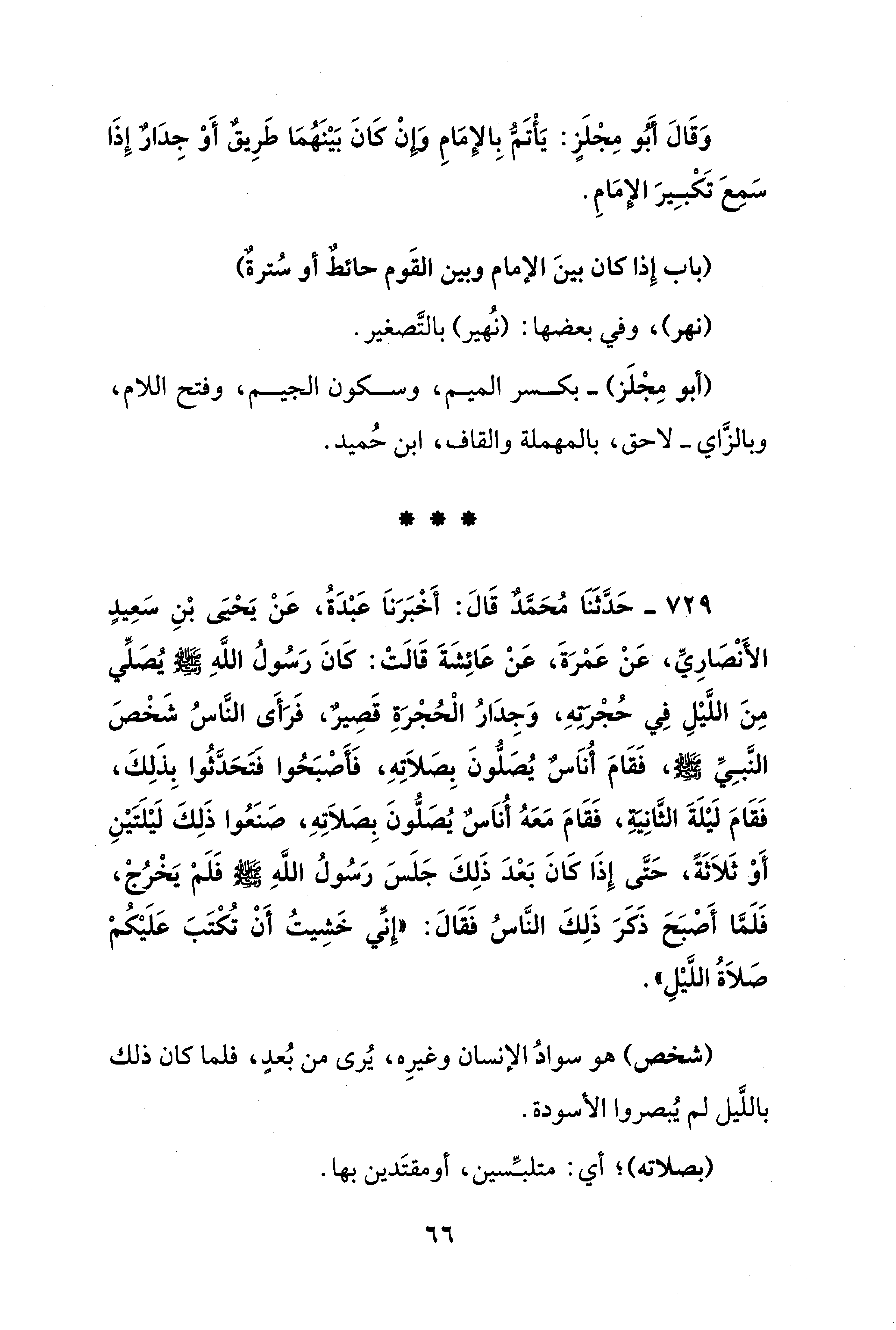 729 - حَدَّثَنَا مُحَمَّدٌ قَالَ: أَخْبَرَناَ عَبْدَةُ، عَنْ يَحْيَى بْنِ سَعِيدٍ الأَنْصَارِيِّ، عَنْ عَمْرَةَ، عَنْ عَائِشَةَ قَالَتْ: كَانَ رَسُولُ اللهِ - صلى الله عليه وسلم - يُصَلِّي مِنَ اللَّيْلِ فِي حُجْرتِهِ، وَجِدَارُ الْحُجْرَةِ قَصِيرٌ، فَرَأَى النَّاسُ شَخْصَ النَّبِيِّ - صلى الله عليه وسلم -، فَقَامَ أُناَسٌ يُصَلُّونَ بِصَلاَتِهِ، فَأَصْبَحُوا فتَحَدَّثُوا بِذَلِكَ، فَقَامَ لَيْلَةَ الثَّانِيَةِ، فَقَامَ مَعَهُ أُناَسٌ يُصَلُّونَ بِصَلاَتِهِ، صَنَعُوا ذَلِكَ لَيْلَتَيْنِ أَوْ ثَلاَثَةً، حَتَّى إِذَا كَانَ بَعْدَ ذَلِكَ جَلَسَ رَسُولُ اللهِ - صلى الله عليه وسلم - فَلَمْ يَخْرُجْ، فَلَمَّا أَصْبَحَ ذَكَرَ ذَلِكَ النَّاسُ فَقَالَ: "إِنِّي خَشِيتُ أَنْ تُكْتَبَ عَلَيْكُمْ صَلاَةُ اللَّيْلِ".