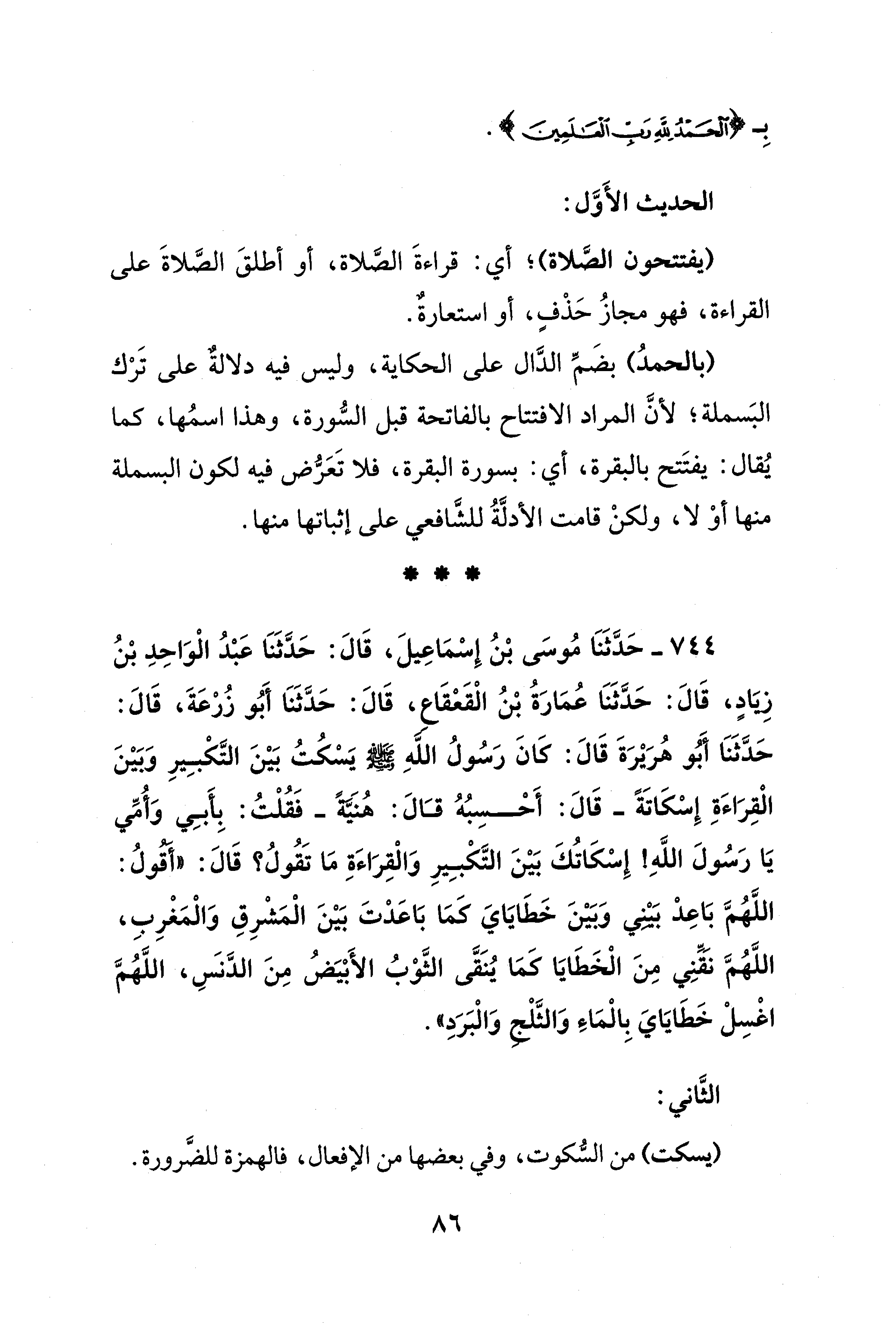 (بالحمدُ) بضَمِّ الدَّال على الحكاية، وليس فيه دلالةٌ على تَرْك البَسملة؛ لأنَّ المراد الافتتاح بالفاتحة قبل السُّورة، وهذا اسمُها، كما يُقال: يفتَتح بالبقرة، أي: بسورة البقرة، فلا تَعَرُّض فيه لكون البسملة منها أوْ لا، ولكنْ قامت الأدلَّةُ للشَّافعي على إثباتها منها.