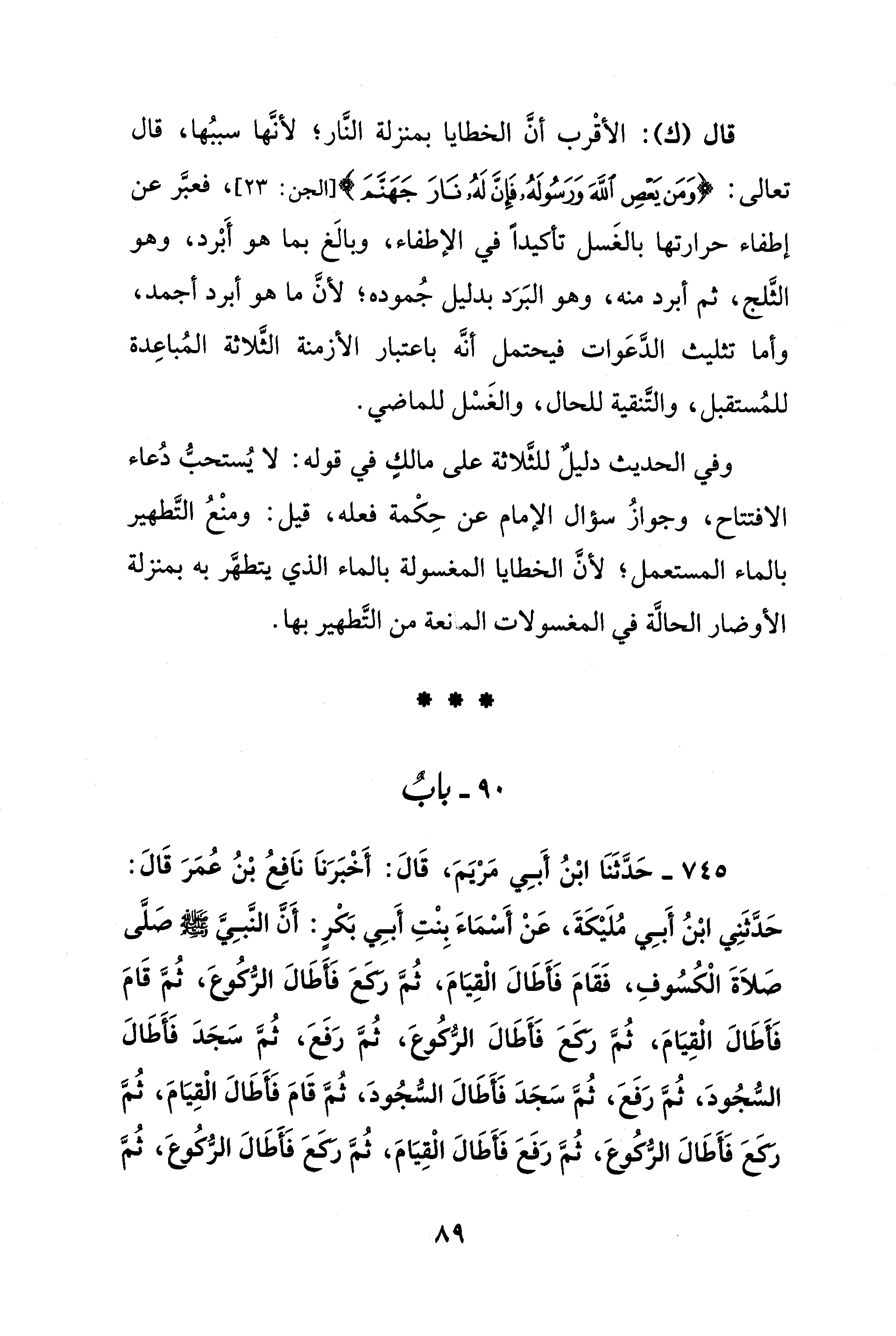 وفي الحديث دليلٌ للثَّلاثة على مالكٍ في قوله: لا يُستحبُّ دُعاء الافتتاح، وجوازُ سؤال الإمام عن حِكْمة فعله، قيل: ومنْعُ التَّطهير بالماء المستعمل؛ لأنَّ الخطايا المغسولة بالماء الذي يتطهَّر به بمنزلة الأوضار الحالَّة في المغسولات المانعة من التَّطهير بها.