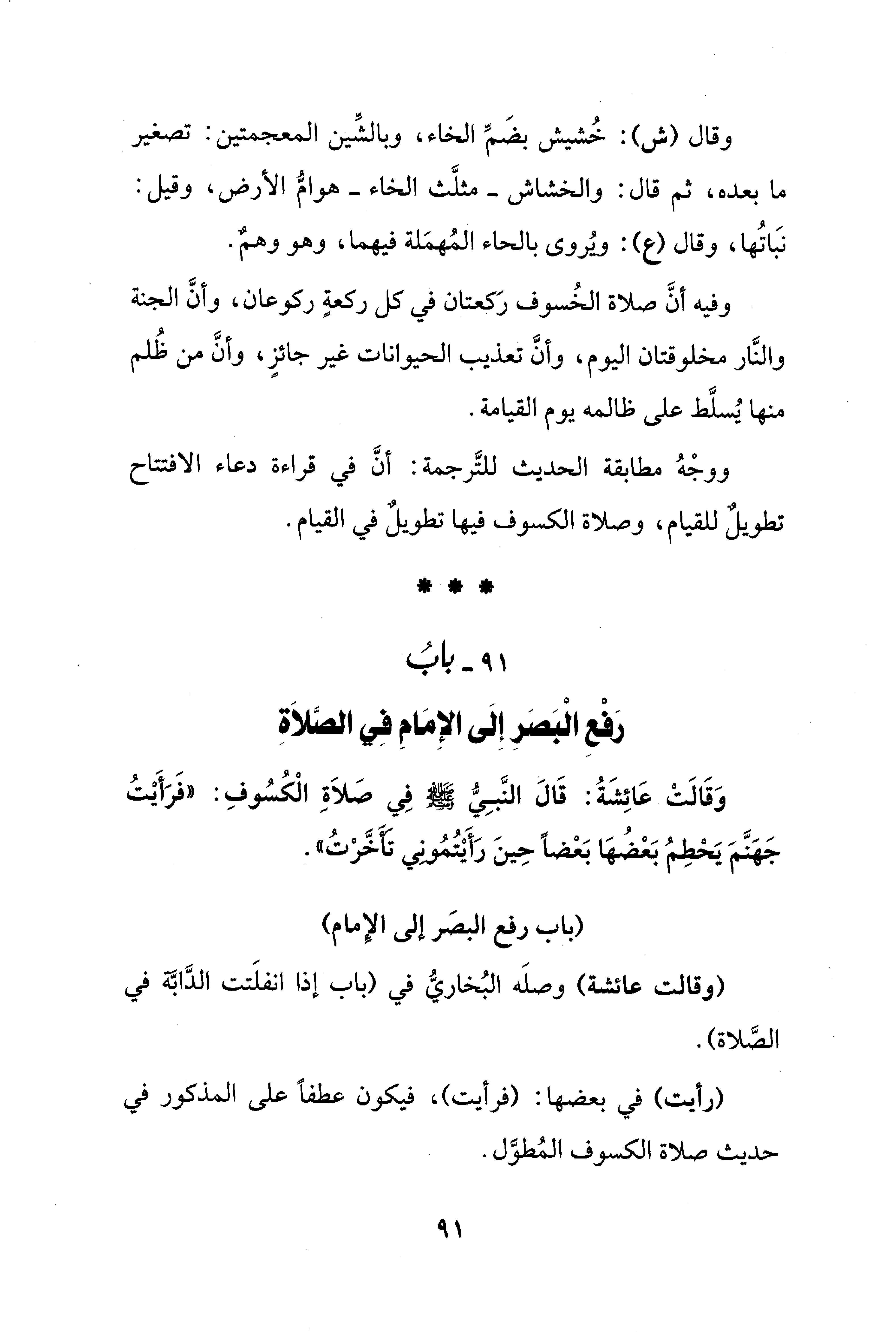 91 - بابُ رَفْعِ الْبَصَرِ إِلَى الإِمَامِ فِي الصَّلاَةِ
