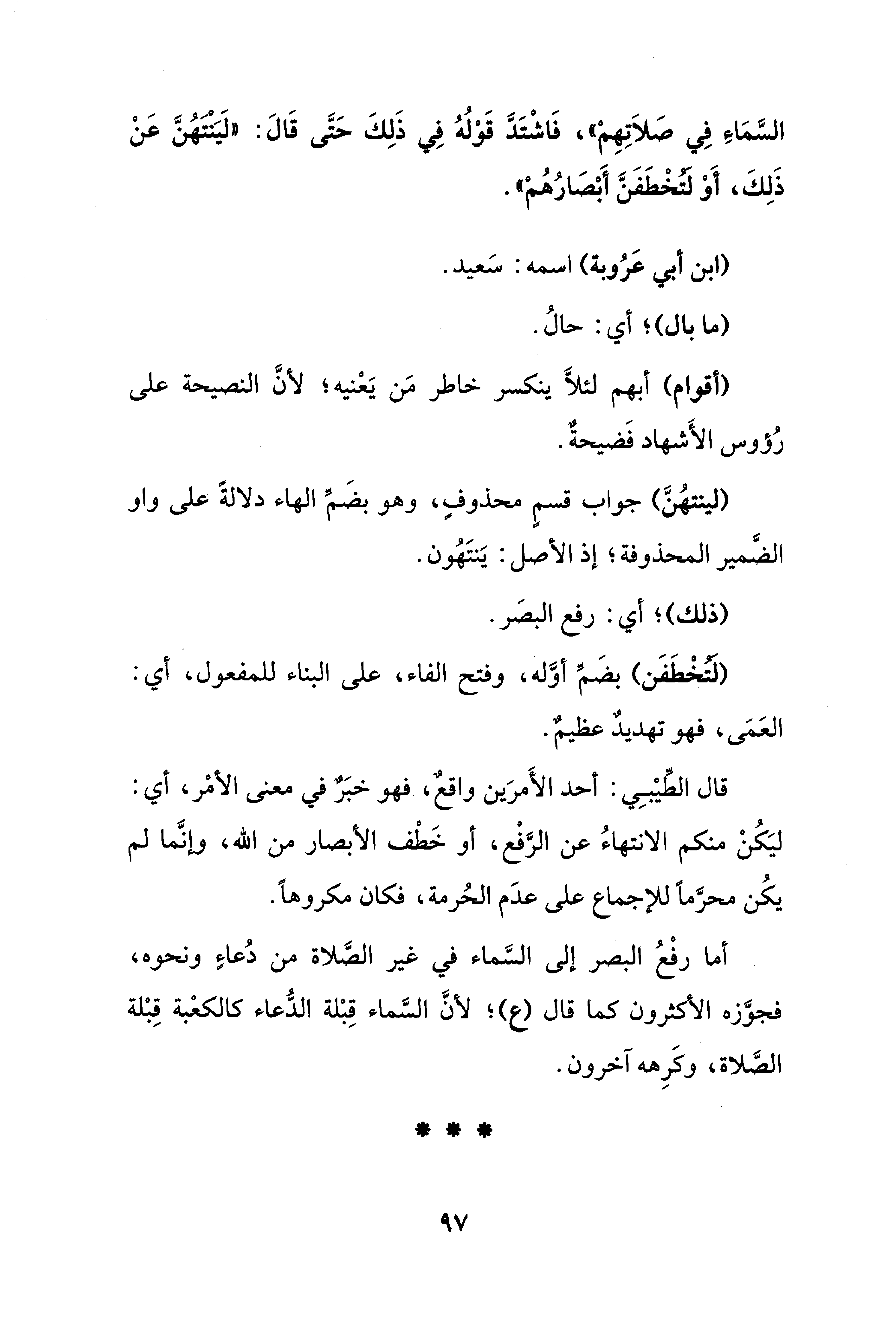 السَّمَاءَ فِي صَلاَتِهِمْ"، فَاشْتَدَّ قَوْلُهُ فِي ذَلِكَ حَتَّى قَالَ: "لَيَنْتَهُنَّ عَنْ ذَلِكَ، أَوْ لَتُخْطَفَنَّ أَبْصَارُهُمْ".