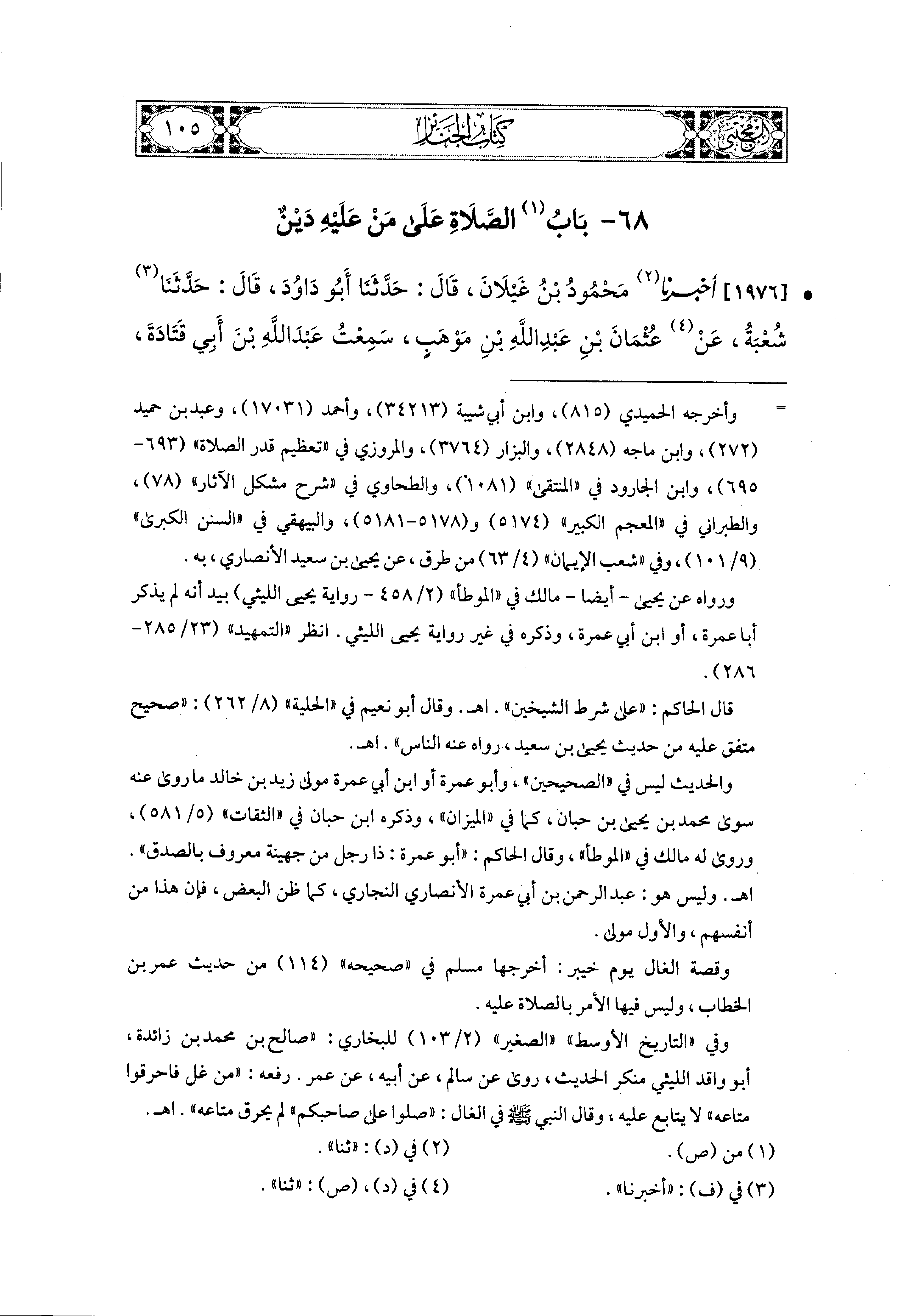 1976- أَخبَرَنا مَحْمُودُ بْنُ غَيْلاَنَ، قال: حَدثنا أَبو دَاوُدَ، قال: حَدثنا شُعبَةُ، عَن عُثمَانَ بْنِ عَبدِ اللهِ بْنِ مَوْهِبٍ، سَمِعْتُ عَبدَ اللهِ بْنَ أَبي قَتَادَةَ يُحَدِّثُ، عَن أَبيهِ، أَنَّ رَسُولَ اللهِ صَلى الله عَليه وسَلم أُتِيَ بِرَجُلٍ مِنَ الأَنصَارِ لِيُصَلِّيَ عَلَيهِ فَقَالَ النَّبيُّ صَلى الله عَليه وسَلم: صَلُّوا عَلَى صَاحِبِكُمْ فَإِنَّ عَلَيهِ دَيْنًا، قَالَ أَبو قَتَادَةَ: هُوَ عَلَيَّ، قَالَ النَّبيُّ صَلى الله عَليه وسَلم: بِالوَفَاءِ، قَالَ: بِالوَفَاءِ، فَصَلَّى عَلَيهِ.