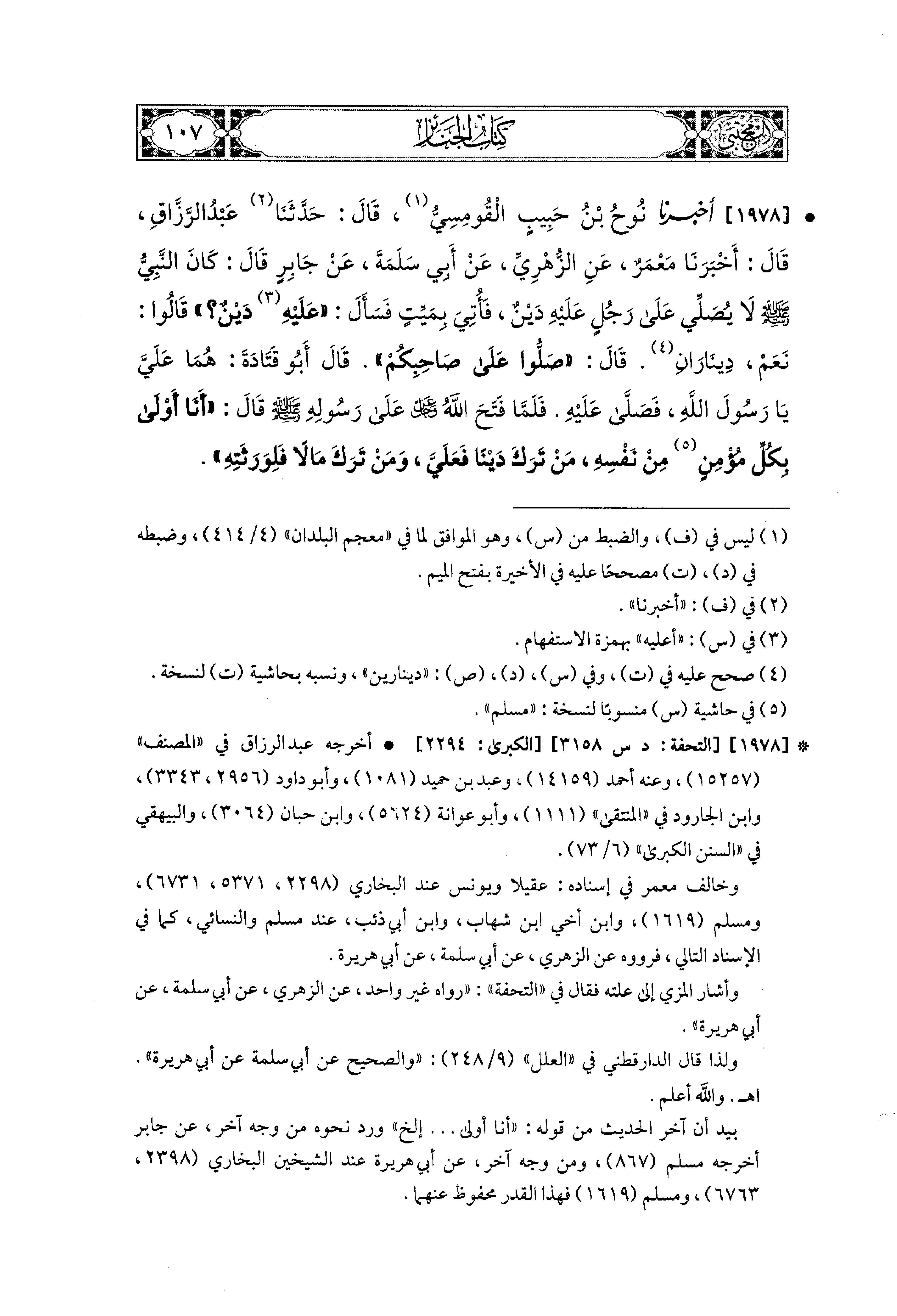 1978- أَخبَرَنا نُوحُ بْنُ حَبِيبٍ القُوْمَسِيُّ، قال: حَدثنا عَبدُ الرَّزَّاقِ، قَالَ: أَخبَرنا مَعْمَرٌ، عَنِ الزُّهْرِيِّ، عَن أَبي سَلَمَةَ، عَن جَابِرٍ قَالَ: كَانَ النَّبيُّ صَلى الله عَليه وسَلم لاَ يُصَلِّي عَلَى رَجُلٍ عَلَيهِ دَيْنٌ، فَأُتِيَ بِمَيْتٍ، فَسَأَلَ: عَلَيهِ دَيْنٌ؟ قَالُوا: نَعَمْ، دِينَارَانِ، قَالَ: صَلُّوا عَلَى صَاحِبِكُمْ، قَالَ أَبو قَتَادَةَ: هُمَا عَلَيَّ يَا رَسُولَ اللهِ، فَصَلَّى عَلَيهِ، فَلَمَّا فَتَحَ اللهُ عَزَّ وَجَلَّ عَلَى رَسُولِهِ صَلى الله عَليه وسَلم قَالَ: أَنَا أَوْلَى بِكُلِّ مُؤْمِنٍ مِنْ نَفْسِهِ، مَنْ تَرَكَ دَيْنًا فَعَلَيَّ، وَمَنْ تَرَكَ مَالاً فَلِوَرَثَتِهِ.