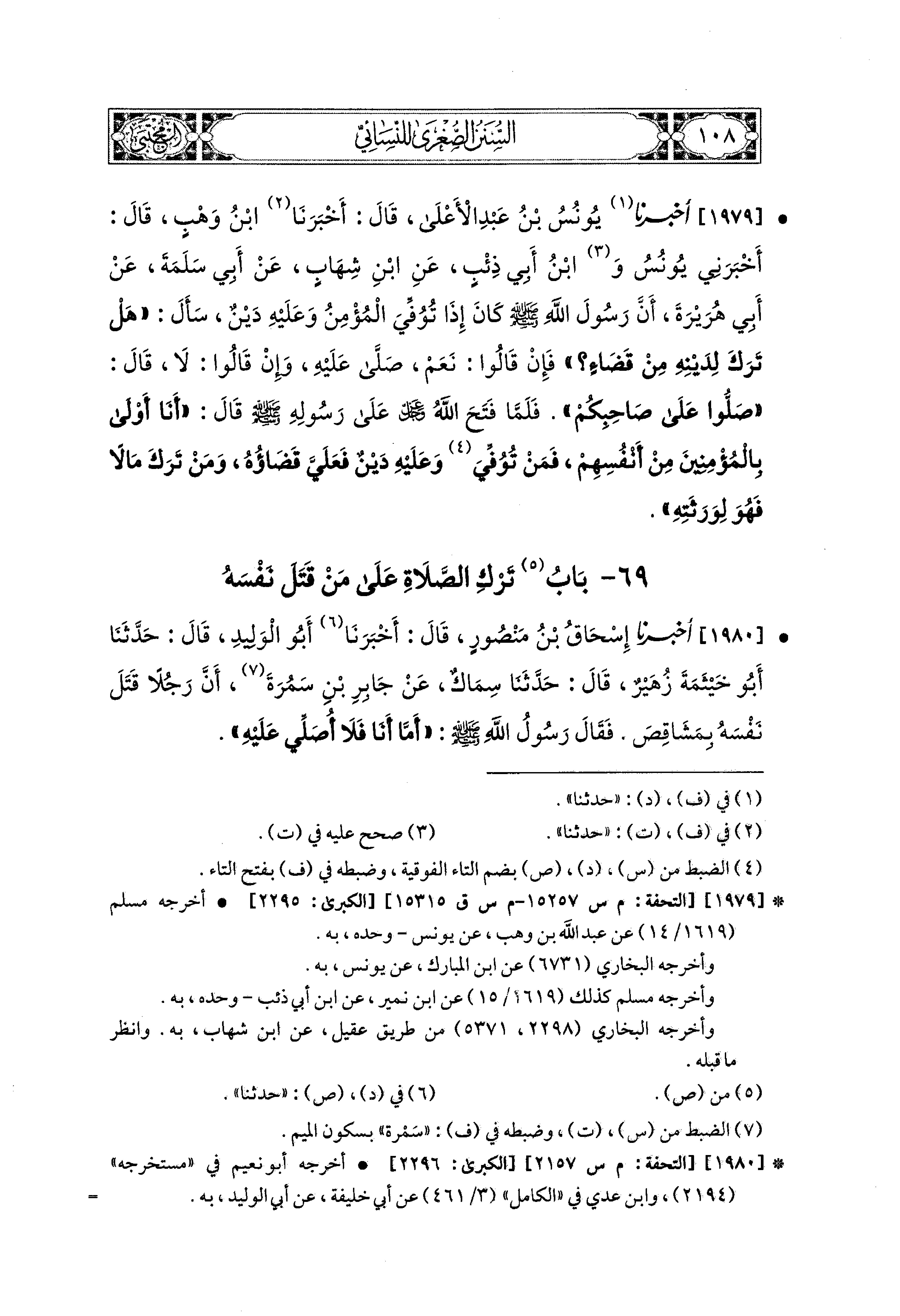 1980- أَخبَرَنا إِسحَاقُ بْنُ مَنْصُورٍ، قَالَ: أَخبَرنا أَبو الوَلِيدِ، قال: حَدثنا أَبو خَيْثَمَةَ زُهَيْرٌ، قال: حَدثنا سِمَاكٌ، عَنِ جابر بنِ سَمُرَةَ، أَنَّ رَجُلاً قَتَلَ نَفْسَهُ بِمَشَاقِصَ، فَقَالَ رَسُولُ اللهِ صَلى الله عَليه وسَلم: أَمَّا أَنَا فَلاَ أُصَلِّي عَلَيهِ.