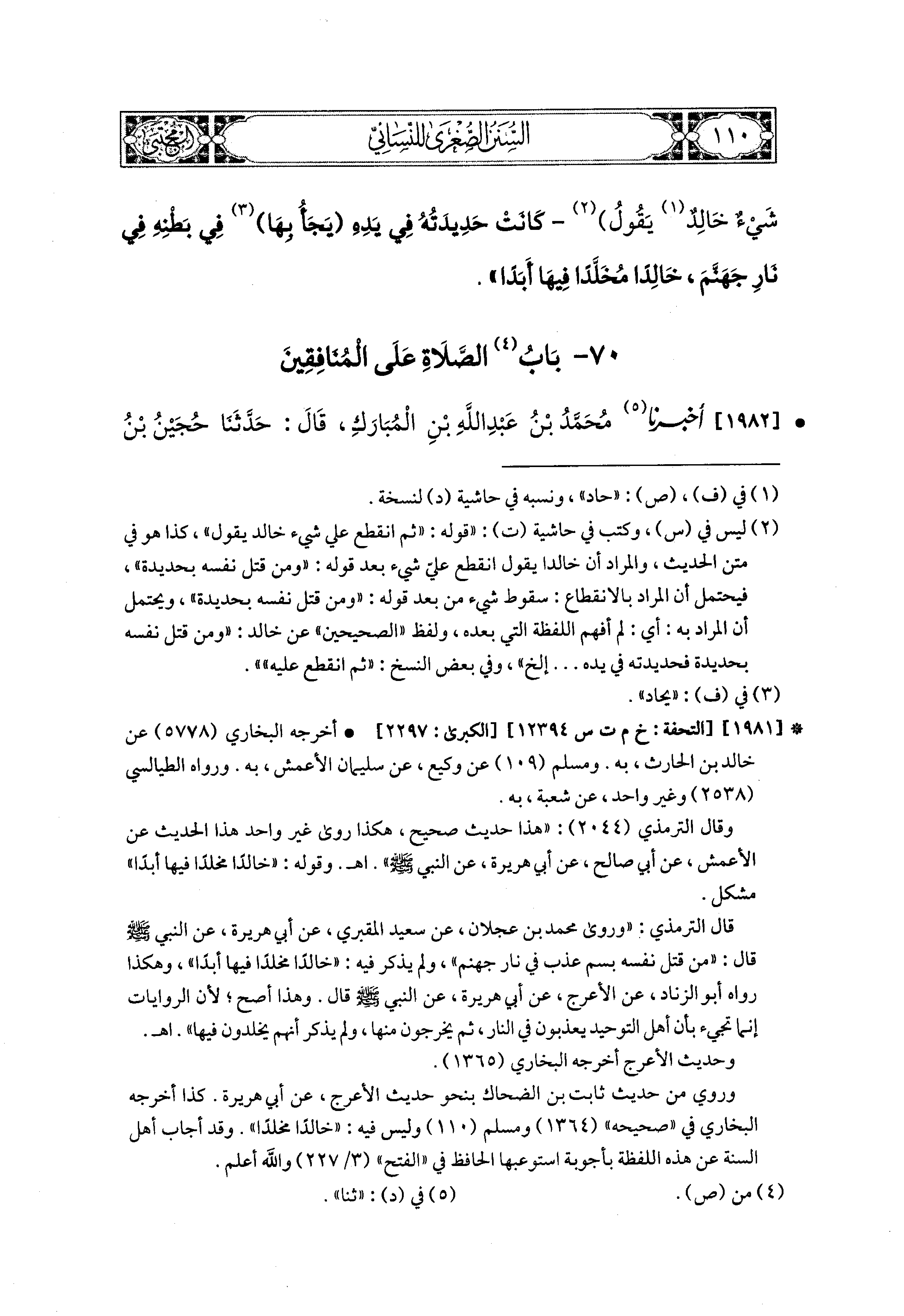 1982- أَخبَرَنا مُحَمد بْنُ عَبدِ اللهِ بْنِ المُبَارَكِ، قال: حَدثنا حُجَيْنُ بْنُ المُثَنَّى، قال: حَدثنا اللَّيْثُ، عَن عُقَيْلٍ، عَنِ ابنِ شِهَابٍ، عَن عُبَيدِ اللهِ بْنِ عَبدِ اللهِ، عَن عَبد اللهِ بن عَبَّاسٍ، عَن عُمَرَ بْنِ الخَطَّابِ قَالَ: لَمَّا مَاتَ عَبدُ اللهِ بْنُ أُبَيِّ بْنِ سَلُولٍ دُعِيَ لَهُ رَسُولُ اللهِ صَلى الله عَليه وسَلم لِيُصَلِّيَ عَلَيهِ، فَلَمَّا قَامَ رَسُولُ اللهِ صَلى الله عَليه وسَلم وَثَبْتُ إِلَيْهِ، ثم قُلْتُ: يَا رَسُولَ اللهِ، أتُصَلِّي عَلَى ابنِ أُبَيٍّ؟ وَقَدْ قَالَ يَوْمَ كَذَا وَكَذَا كَذَا وَكَذَا، أُعَدِّدُ عَلَيهِ، فَتَبَسَّمَ رَسُولُ اللهِ صَلى الله عَليه وسَلم وَقَالَ: أَخِّرْ عَنِّي يَا عُمَرُ، فَلَمَّا أَكْثَرْتُ عَلَيهِ، قَالَ: إِنِّي خُيِّرْتُ فَاخْتَرْتُ، فَلَوْ عَلِمْتُ أَنِّي لَوْ زِدْتُ عَلَى السَّبْعِينَ غُفِرَ لَهُ لَزِدْتُ عَلَيهَا، فَصَلَّى عَلَيهِ رَسُولُ اللهِ صَلى الله عَليه وسَلم، ثُمَّ انْصَرَفَ، فَلَمْ يَمْكُثْ إِلاَّ يَسِيرًا حَتَّى نَزَلَتِ الآيَتَانِ مِنْ بَرَاءَةَ: {وَلاَ تُصَلِّ عَلَى أَحَدٍ مِنْهُمْ مَاتَ أَبَدًا وَلاَ تَقُمْ عَلَى قَبْرِهِ إِنَّهُمْ كَفَرُوا بِالله وَرَسُولِهِ وَمَاتُوا وَهُمْ فَاسِقُونَ}، فَعَجِبْتُ بَعْدُ مِنْ جُرْأَتِي عَلَى رَسُولِ اللهِ صَلى الله عَليه وسَلم يَوْمَئِذٍ وَاللهُ، وَرَسُولُهُ أَعْلَمُ.