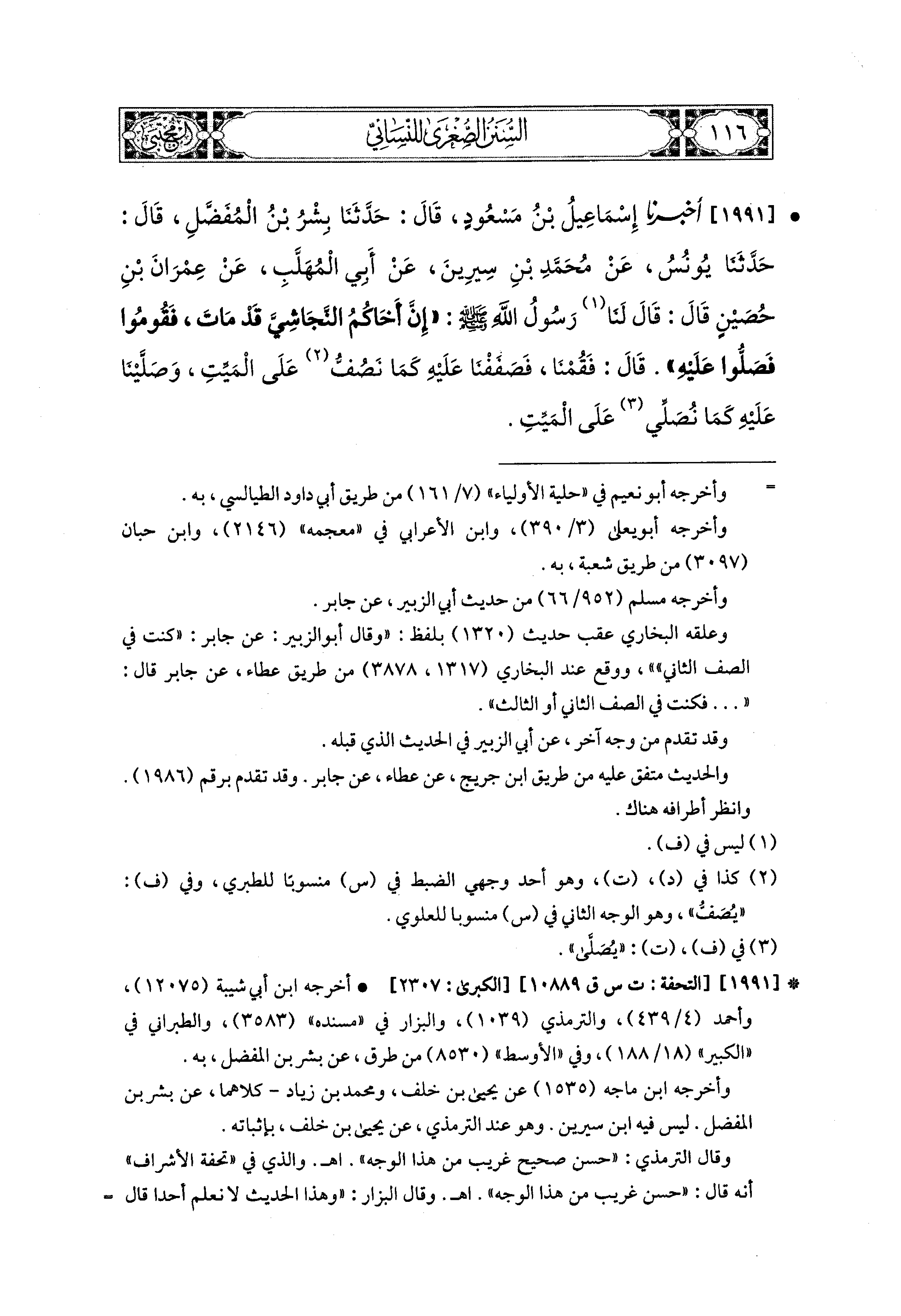 1991- أَخبَرَنا إِسماعِيلُ بْنُ مَسْعُودٍ، قال: حَدثنا بِشْرُ بْنُ المُفَضَّلِ، قال: حَدثنا يُونُسُ، عَن مُحَمدِ بْنِ سِيرِينَ، عَن أَبي المُهَلَّبِ، عَن عِمْرَانَ بْنِ حُصَيْنٍ قَالَ: قَالَ لَنَا رَسُولُ اللهِ صَلى الله عَليه وسَلم: إِنَّ أَخَاكُمُ النَّجَاشِيَّ قَدْ مَاتَ، فَقُومُوا فَصَلُّوا عَلَيهِ، قَالَ: فَقُمْنَا فَصَفَفْنَا عَلَيهِ كَمَا نُصَفُّ عَلَى المَيِّتِ، وَصَلَّيْنَا عَلَيهِ كَمَا نُصَلَّى عَلَى المَيِّتِ.