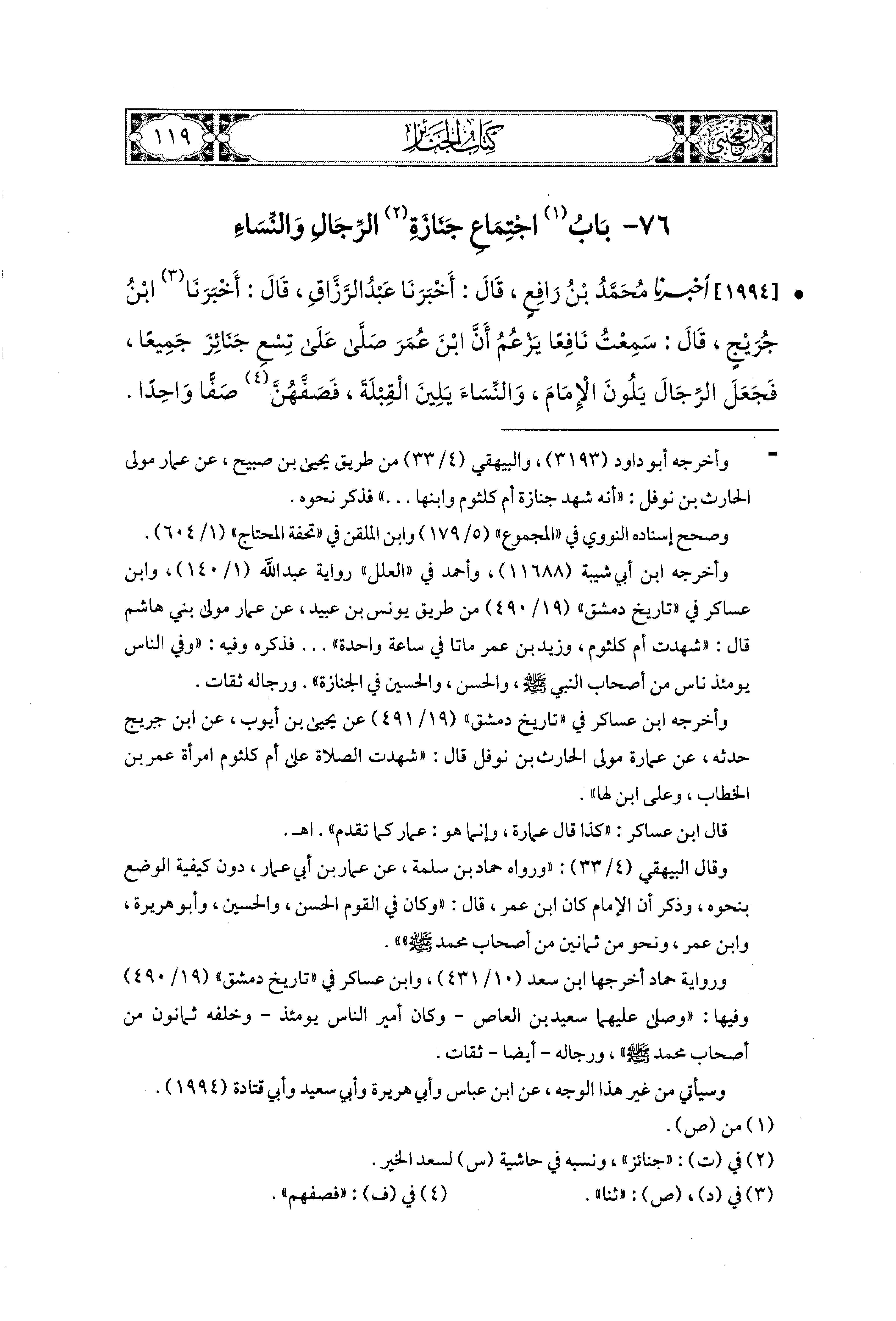 1994- أَخبَرَنا مُحَمد بْنُ رَافِعٍ، قَالَ: أَخبَرنا عَبدُ الرَّزَّاقِ، قَالَ: أَخبَرنا ابنُ جُرَيْجٍ، قَالَ: سَمِعْتُ نَافِعًا يَزْعُمُ، أَنَّ ابنَ عُمَرَ صَلَّى عَلَى تِسْعِ جَنَائِزَ جَميعًا فَجَعَلَ الرِّجَالَ يَلُونَ الإِمَامَ، وَالنِّسَاءُ يَلِينَ القِبْلَةَ، فَصَفَّهُنَّ صَفًّا وَاحِدًا، وَوُضِعَتْ جَنَازَةُ أُمِّ كُلْثُومِ بِنْتِ عَلِيٍّ امْرَأَةِ عُمَرَ بْنِ الخَطَّابِ، وَابنٍ لَهُ يُقَالُ لَهُ زَيْدٌ، وُضِعَا جَميعًا وَالإِمَامُ يَوْمَئِذٍ سَعيدُ بْنُ العَاصِ، وَفِي النَّاسِ ابنُ عَبَّاسٍ (1)، وَأَبو هُرَيرَةَ، وَأَبو سَعيدٍ، وَأَبو قَتَادَةَ، فَوُضِعَ الغُلاَمُ مِمَّا يَلِي الإِمَامَ، فَقَالَ رَجُلٌ: فَأَنْكَرْتُ ذَلِكَ، فَنَظَرْتُ إِلَى ابنِ عَبَّاسٍ، وَأَبي هُرَيرَةَ، وَأَبي سَعيدٍ، وَأَبي قَتَادَةَ، فَقُلْتُ: مَا هَذَا؟ قَالُوا: هِيَ السُّنَّةُ.