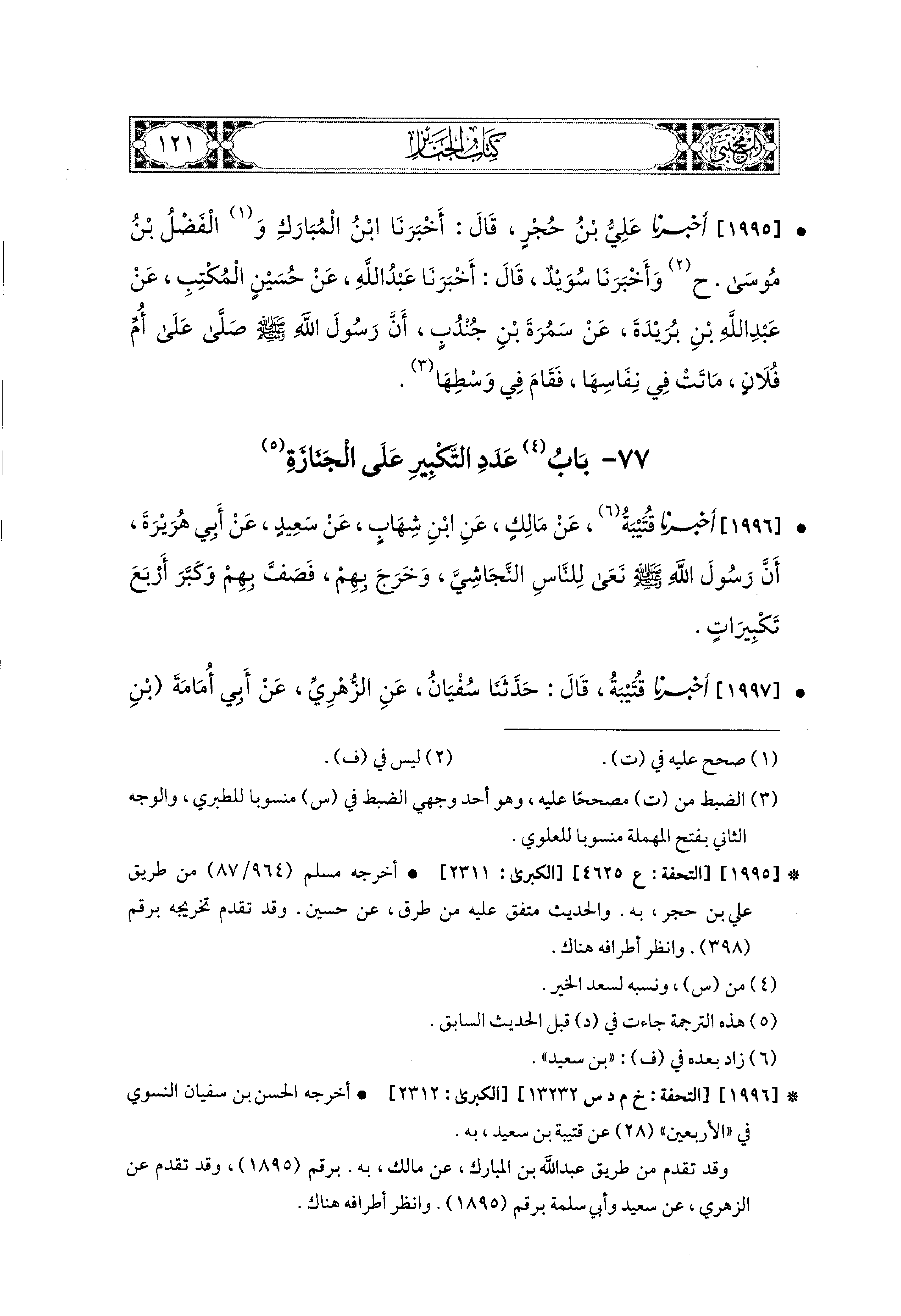 1995- أَخبَرَنا عَلِيُّ بْنُ حُجْرٍ، قَالَ: أَخبَرنا ابنُ المُبَارَكِ، وَالفَضْلُ بْنُ مُوسَى (ح) وأَخبَرَنا سُوَيْدٌ، قَالَ: أَخبَرنا عَبدُ اللهِ، عَن حُسَيْنٍ المُكْتِبِ، عَن عَبد اللهِ بن بُرَيْدَةَ، عَن سَمُرَةَ بْنِ جُنْدُبٍ، أَنَّ رَسُولَ اللهِ صَلى الله عَليه وسَلم صَلَّى عَلَى أُمِّ فُلاَنٍ مَاتَتْ فِي نِفَاسِهَا، فَقَامَ فِي وَسَطِهَا.