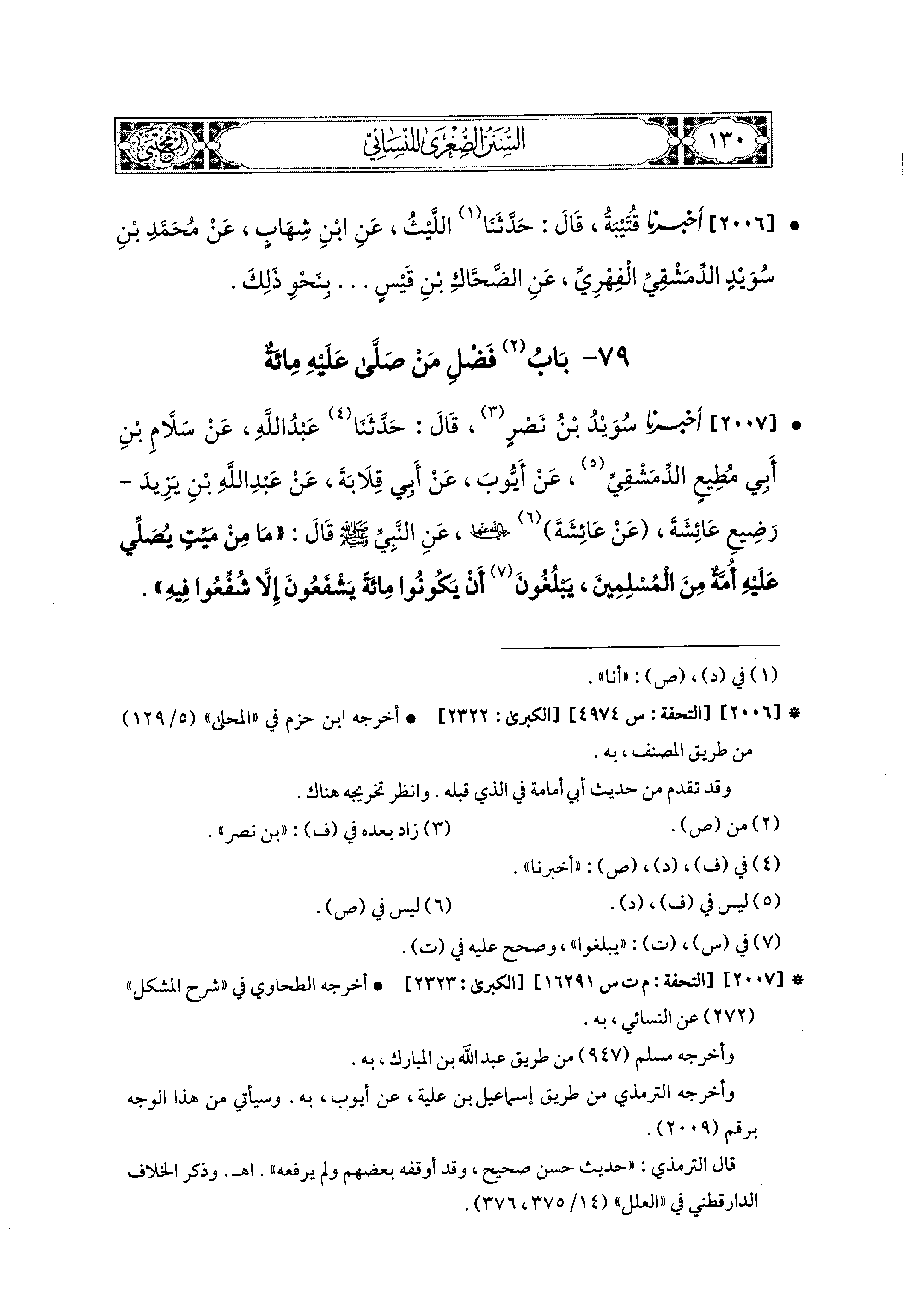 2007- أَخبَرَنا سُوَيْدٌ بن نصر، قال: حَدثنا عَبدُ اللهِ، عَن سَلاَّمِ بْنِ أَبي مُطِيعٍ الدِّمَشْقِيِّ، عَن أَيُّوبَ، عَن أَبي قِلاَبَةَ، عَن عَبد اللهِ بن يَزِيدَ، رَضِيعِ عَائِشَةَ، عَن عَائِشَةَ رَضِيَ اللهُ عَنهَا، عَنِ النَّبيِّ صَلى الله عَليه وسَلم قَالَ: مَا مِنْ مَيِّتٍ يُصَلِّي عَلَيهِ أُمَّةٌ مِنَ المُسْلِمينَ يَبْلُغُونَ أَنْ يَكُونُوا مِئَةً يَشْفَعُونَ إِلاَّ شُفِّعُوا فِيهِ.