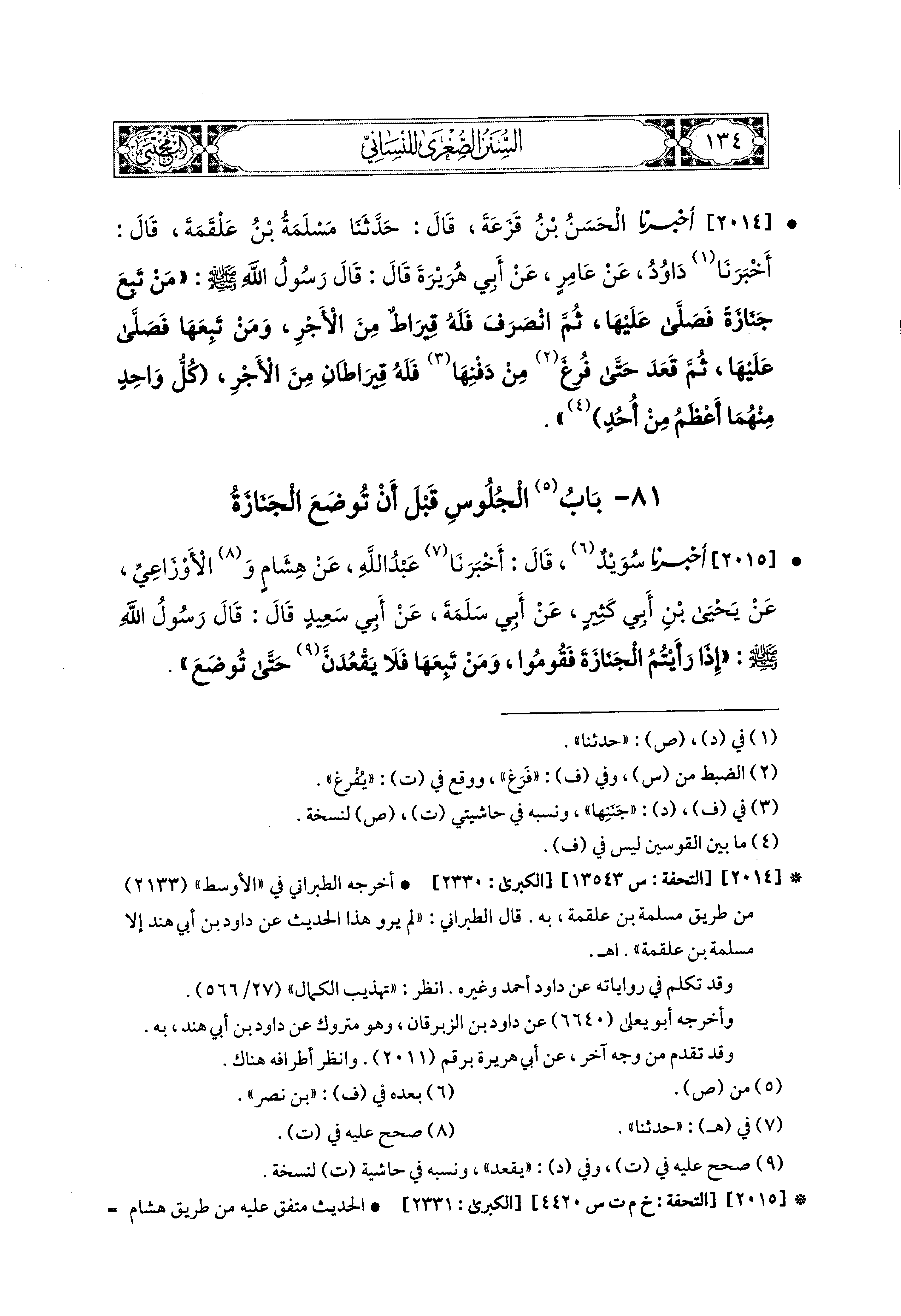 2014- أَخبَرَنا الحَسَنُ بْنُ قَزَعَةَ، قال: حَدثنا مَسْلَمَةُ بْنُ عَلْقَمَةَ، قَالَ: أَخبَرنا دَاوُدُ، عَن عَامِرٍ، عَن أَبي هُرَيرَةَ قَالَ: قَالَ رَسُولُ اللهِ صَلى الله عَليه وسَلم: مَنْ تَبِعَ جَنَازَةً فَصَلَّى عَلَيهَا ثُمَّ انْصَرَفَ فَلَهُ قِيرَاطٌ مِنَ الأَجْرِ، وَمَنْ تَبِعَهَا فَصَلَّى عَلَيهَا ثُمَّ قَعَدَ حَتَّى فْرَغَ مِنْ دَفْنِهَا فَلَهُ قِيرَاطَانِ مِنَ الأَجْرِ، كُلُّ وَاحِدٍ مِنْهُمَا أَعْظَمُ مِنْ أُحُدٍ.