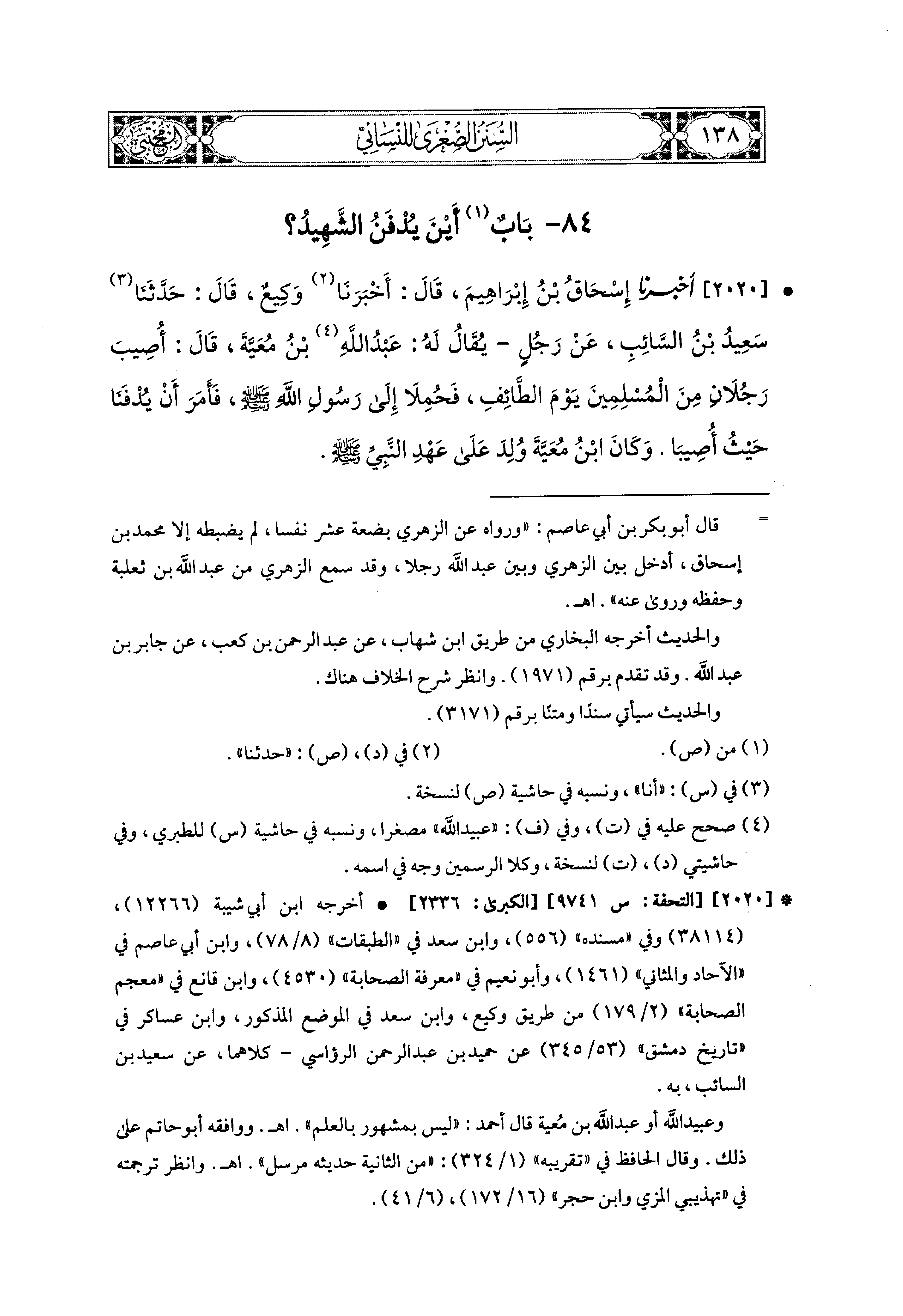 2020- أَخبَرَنا إِسحَاقُ بْنُ إِبراهِيمَ، قَالَ: أَخبَرنا وَكِيعٌ، قال: حَدثنا سَعيدُ بْنُ السَّائِبِ، عَن رَجُلٍ، يُقَالُ لَهُ: عَبد الله بن مُعَية (1)، قَالَ: أُصِيبَ رَجُلاَنِ مِنَ المُسْلِمينَ يَوْمَ الطَّائِفِ فَحُمِلاَ إِلَى رَسُولِ اللهِ صَلى الله عَليه وسَلم، فَأَمَرَ أَنْ يُدْفَنَا حَيْثُ أُصِيبَا، وَكَانَ ابنُ مُعَيَّةَ وُلِدَ عَلَى عَهْدِ النَّبيِّ صَلى الله عَليه وسَلم.