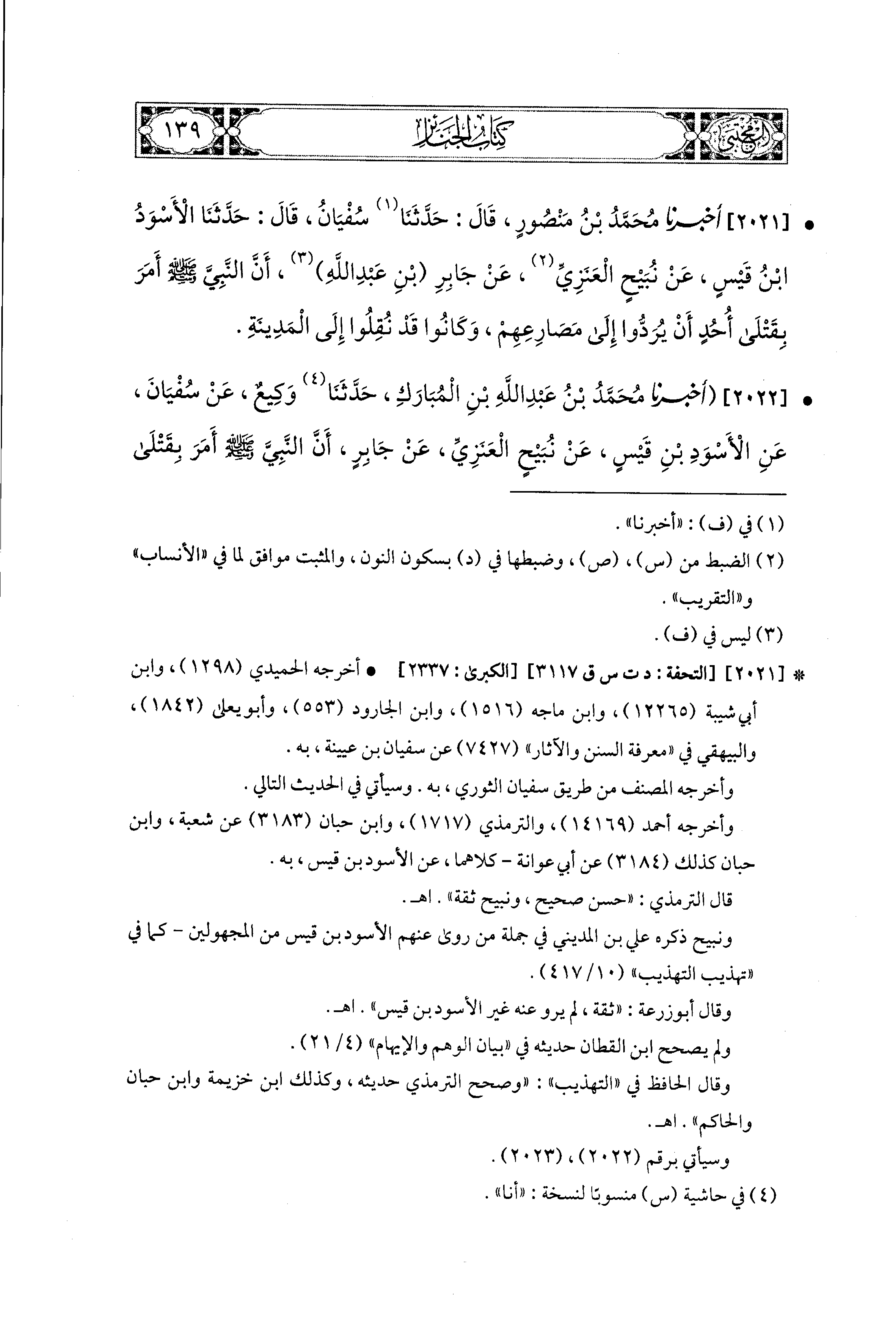 2021- أَخبَرَنا مُحَمد بْنُ مَنْصُورٍ، قال: حَدثنا سُفيَانُ، قال: حَدثنا الأَسْوَدُ بْنُ قَيْسٍ، عَن نُبَيْحٍ العَنَزِيِّ، عَن جَابِرِ بْنِ عَبدِ اللهِ، أَنَّ النَّبيَّ صَلى الله عَليه وسَلم أَمَرَ بِقَتْلَى أُحُدٍ أَنْ يُرَدُّوا إِلَى مَصَارِعِهِمْ، وَكَانُوا قَدْ نُقِلُوا إِلَى المَدِينَةِ.