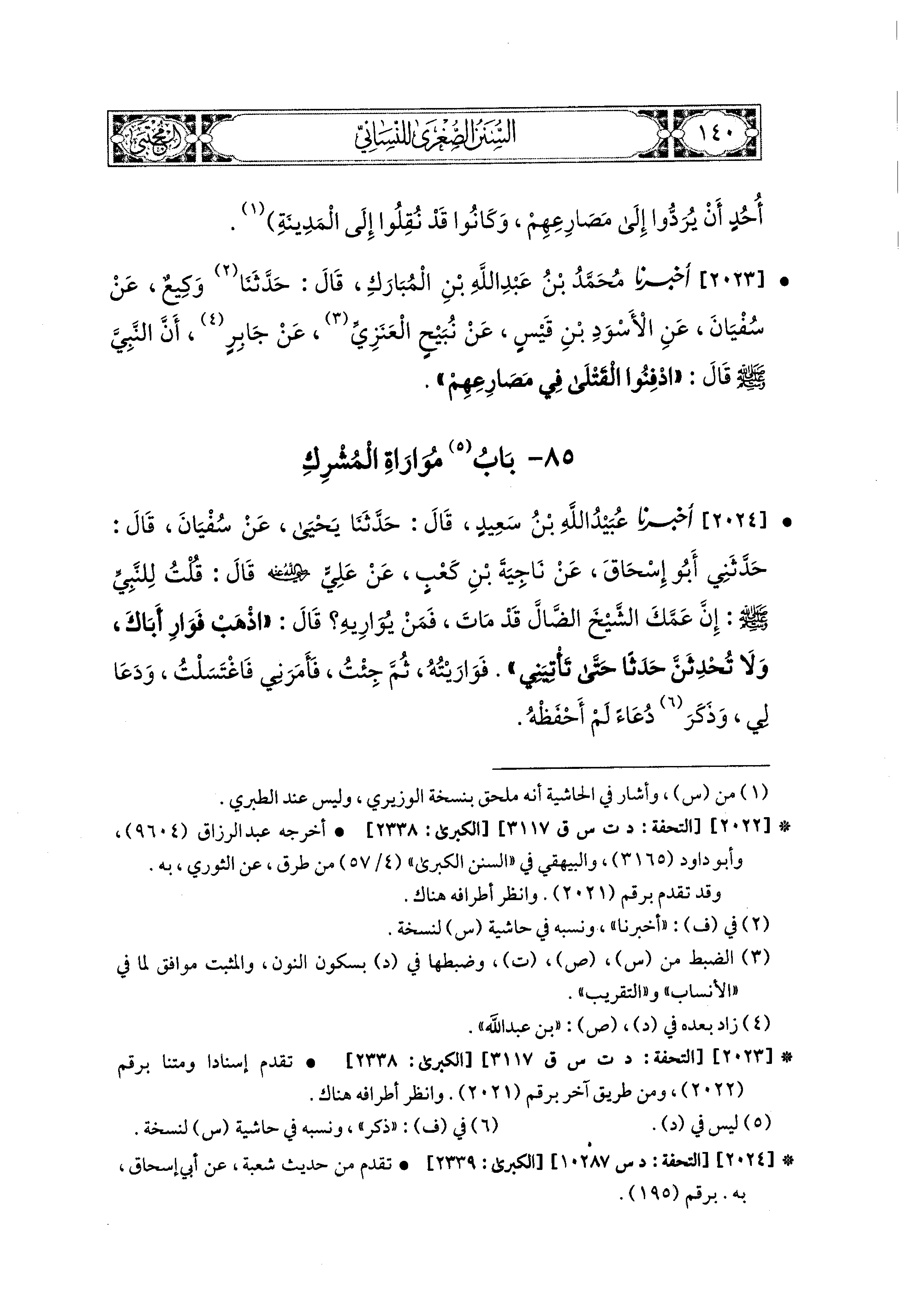 2023- أَخبَرَنا مُحَمد بْنُ عَبدِ اللهِ بْنِ المُبَارَكِ، قال: حَدثنا وَكِيعٌ، عَن سُفيَانَ، عَنِ الأَسْوَدِ بْنِ قَيْسٍ، عَن نُبَيْحٍ العَنَزِىِّ، عَن جَابِرٍ، أَنَّ النَّبيَّ صَلى الله عَليه وسَلم قَالَ: ادْفِنُوا القَتْلَى فِي مَصَارِعِهِمْ.