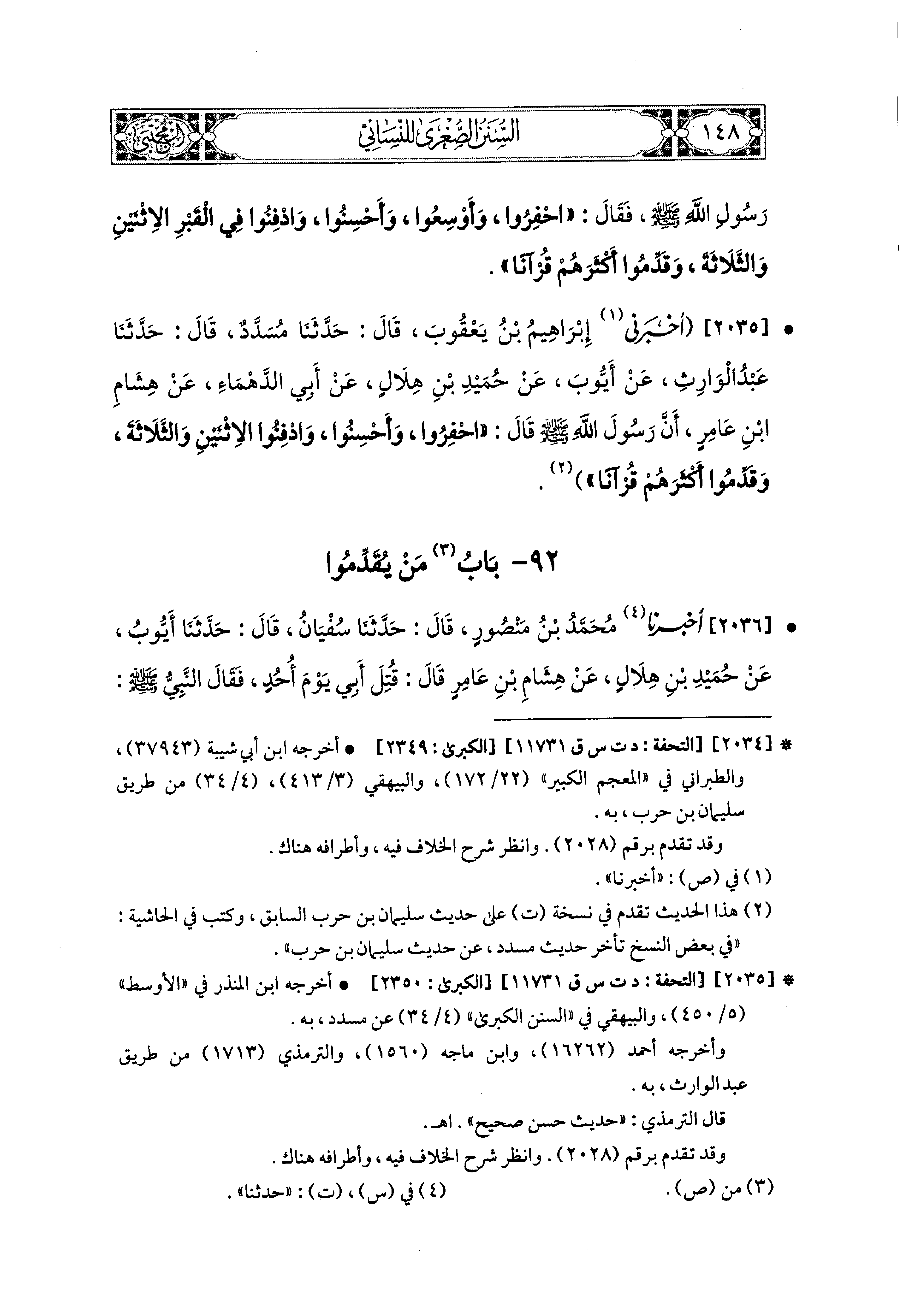 2035- أَخْبَرَنِي إِبراهِيمُ بْنُ يَعقُوبَ، قال: حَدثنا مُسَدَّدٌ، قال: حَدثنا عَبدُ الوَارِثِ، عَن أَيُّوبَ، عَن حُمَيدِ بْنِ هِلاَلٍ، عَن أَبي الدَّهْمَاءِ، عَن هِشَامِ بْنِ عَامِرٍ، أَنَّ رَسُولَ اللهِ صَلى الله عَليه وسَلم قَالَ: احْفِرُوا وَأَحْسِنُوا، وَادْفِنُوا الاِثْنَيْنِ وَالثَّلاَثَةَ، وَقَدِّمُوا أَكْثَرَهُمْ قُرْآنًا.