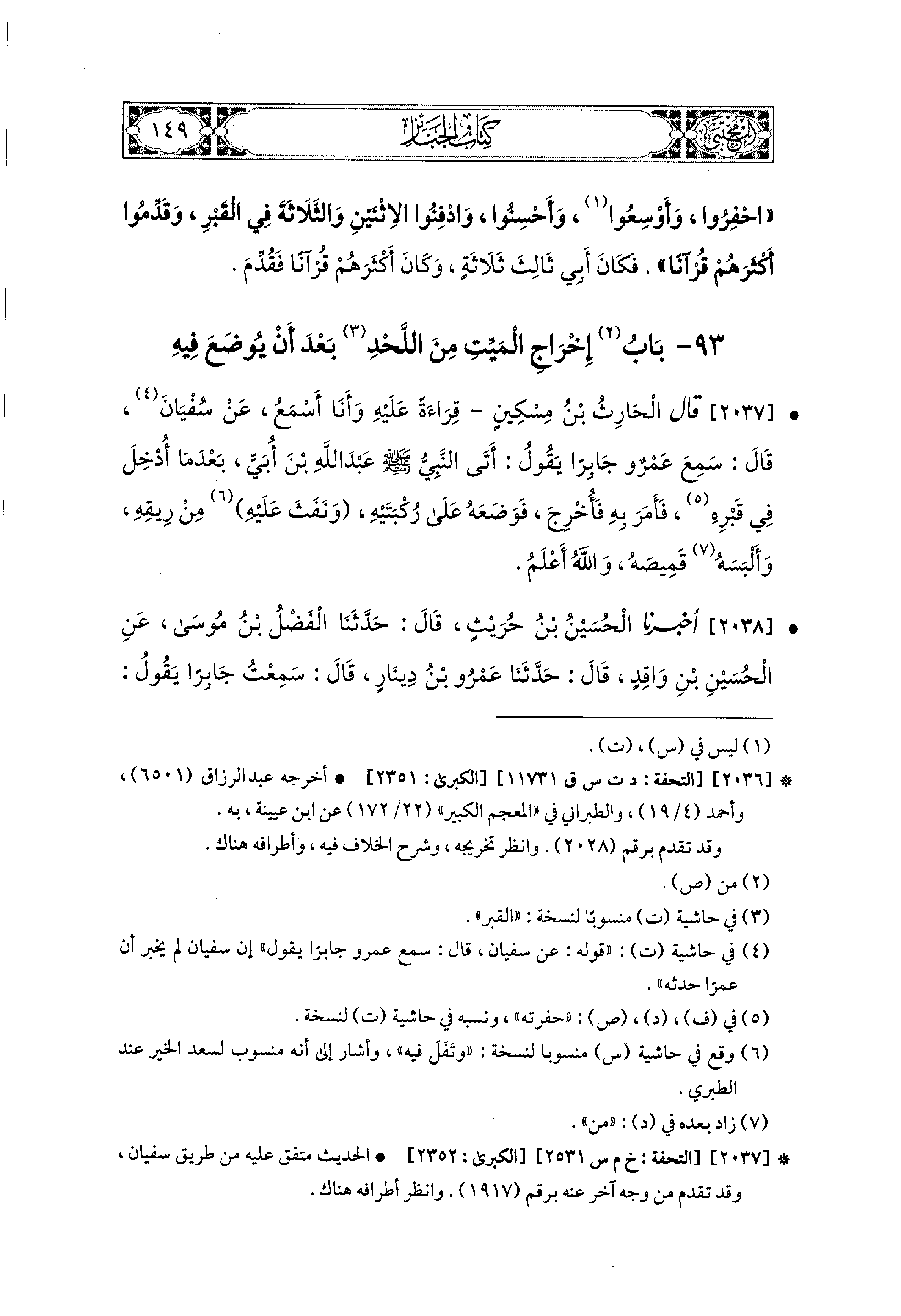2037- قَالَ: الحَارِثُ بْنُ مِسكينٍ، قِرَاءَةً عَلَيهِ وَأَنَا أَسْمَعُ، عَن سُفيَانَ، قَالَ: سَمِعَ عَمْرٌو جَابِرًا يَقُولُ: أَتَى النَّبيُّ صَلى الله عَليه وسَلم عَبدَ اللهِ بْنَ أُبَيٍّ بَعْدَ مَا أُدْخِلَ فِي قَبْرِهِ فَأَمَرَ بِهِ فَأُخْرِجَ، فَوَضَعَهُ عَلَى رُكْبَتَيْهِ، وَنَفَثَ عَلَيهِ مِنْ رِيقِهِ، وَأَلْبَسَهُ قَميصَهُ، وَاللهُ أَعْلَمُ.
