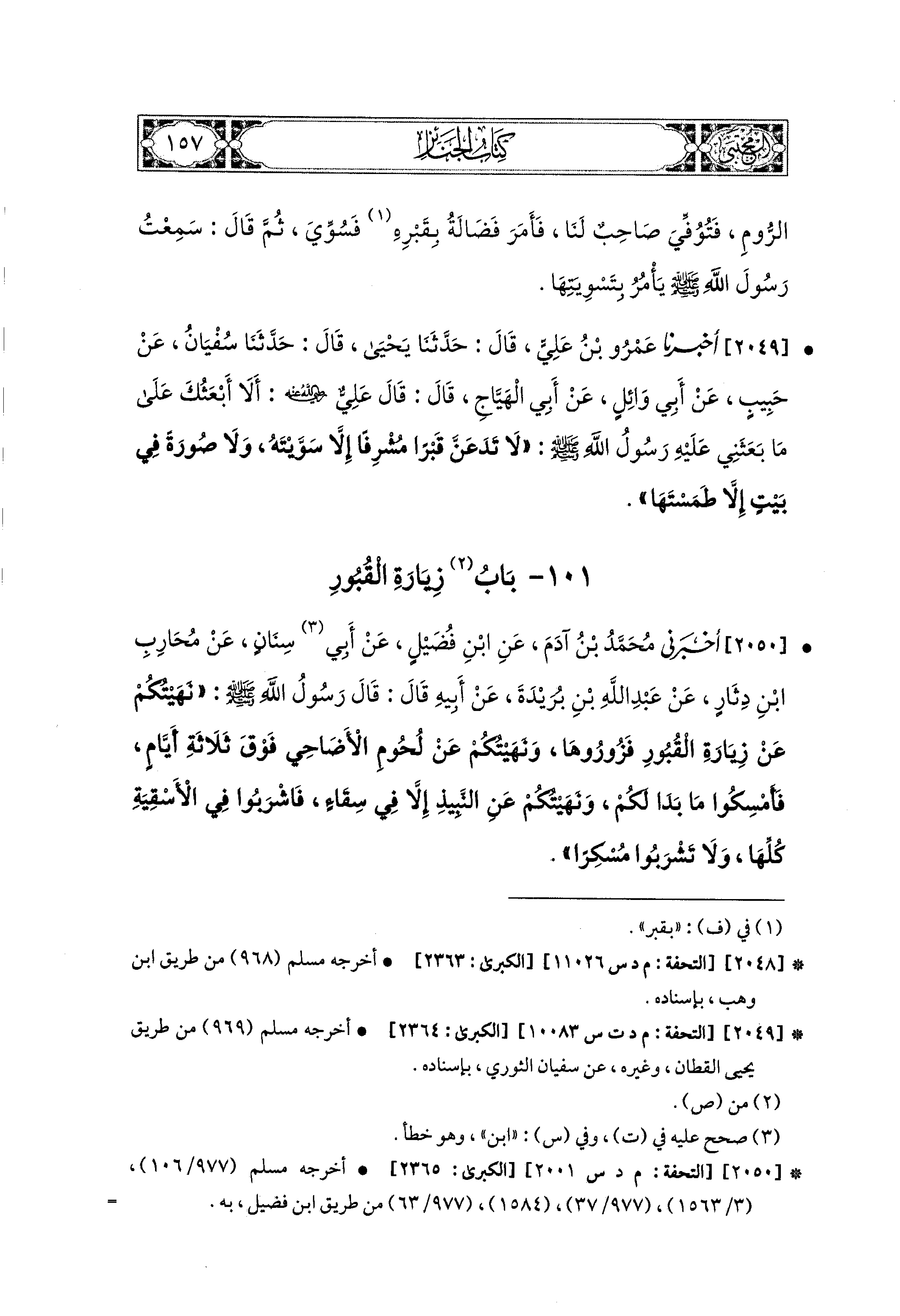 2049- أَخبَرَنا عَمْرُو بْنُ عَلِيٍّ، قال: حَدثنا يَحيَى، قال: حَدثنا سُفيَانُ، عَن حَبِيبٍ، عَن أَبي وَائِلٍ، عَن أَبي الهَيَّاجِ، قَالَ: قَالَ عَلِيٌّ رَضِيَ اللهُ عَنهُ: أَلاَ أَبْعَثُكَ عَلَى مَا بَعَثَني عَلَيهِ رَسُولُ اللهِ صَلى الله عَليه وسَلم، لاَ تَدَعَنَّ قَبْرًا مُشْرِفًا إِلاَّ سَوَّيْتَهُ، وَلاَ صُورَةً فِي بَيْتٍ إِلاَّ طَمَسْتَهَا.