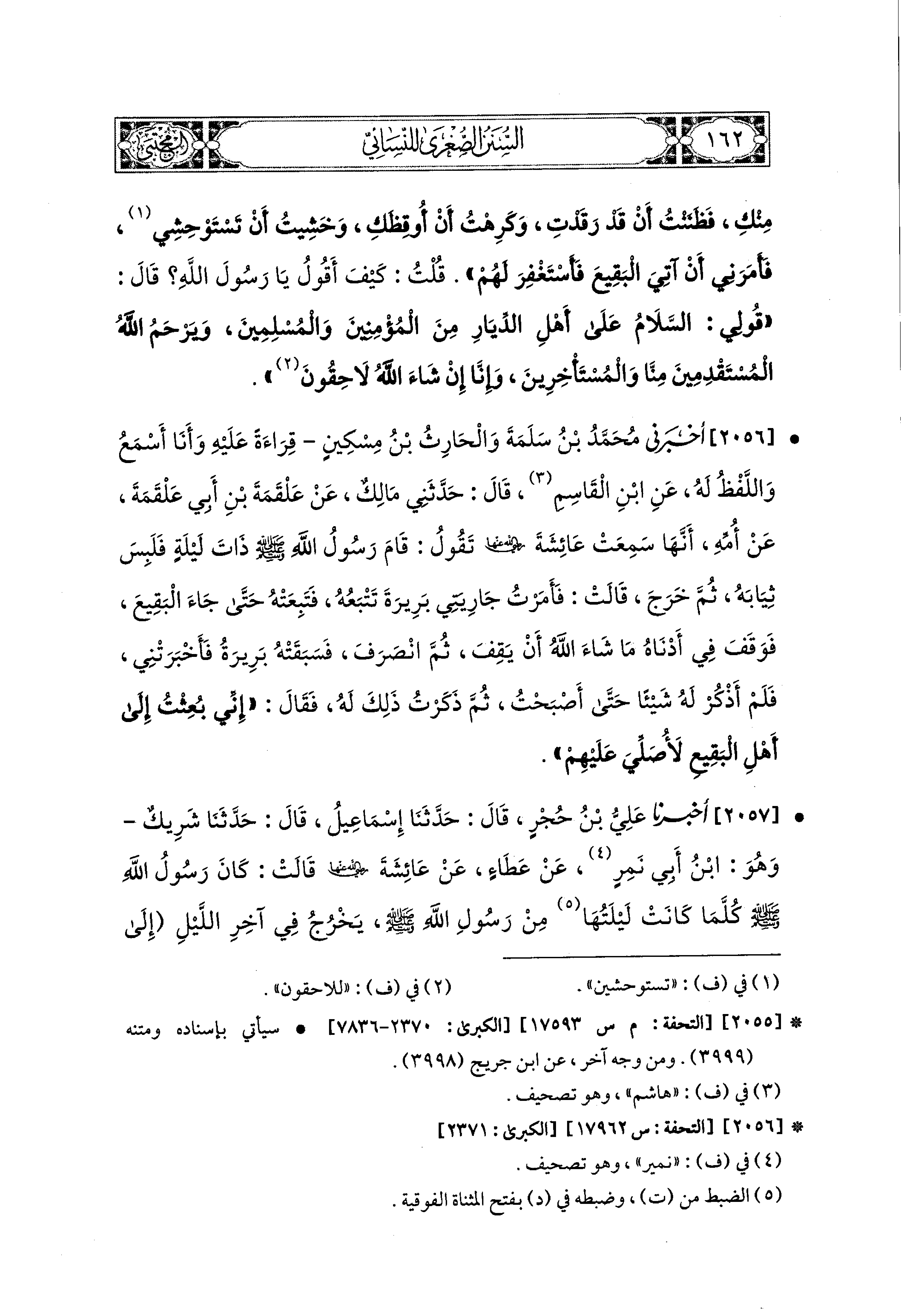 2057- أَخبَرَنا عَلِيُّ بْنُ حُجْرٍ، قال: حَدثنا إِسماعِيلُ، قال: حَدثنا شَرِيكٌ، وَهُوَ ابنُ أَبي نَمِرٍ، عَن عَطَاءٍ، عَن عَائِشَةَ رَضِيَ اللهُ عَنْهَا قَالَتْ: كَانَ رَسُولُ اللهِ صَلى الله عَليه وسَلم كُلَّمَا كَانَتْ لَيْلَتُهَا مِنْ رَسُولِ اللهِ صَلى الله عَليه وسَلم يَخْرُجُ فِي آخِرِ اللَّيلِ إِلَى البَقِيعِ فَيَقُولُ: السَّلاَمُ عَلَيْكُمْ دَارَ قَوْمٍ مُؤْمِنينَ، وَإِنَّا وَإِيَّاكُمْ مُتَوَاعِدُونَ غَدًا، وَمُوَاكِلُونَ، وَإِنَّا إِنْ شَاءَ اللهُ بِكُمْ لاَحِقُونَ، اللهُمَّ اغْفِرْ لأَهْلِ بَقِيعِ الغَرْقَدِ.