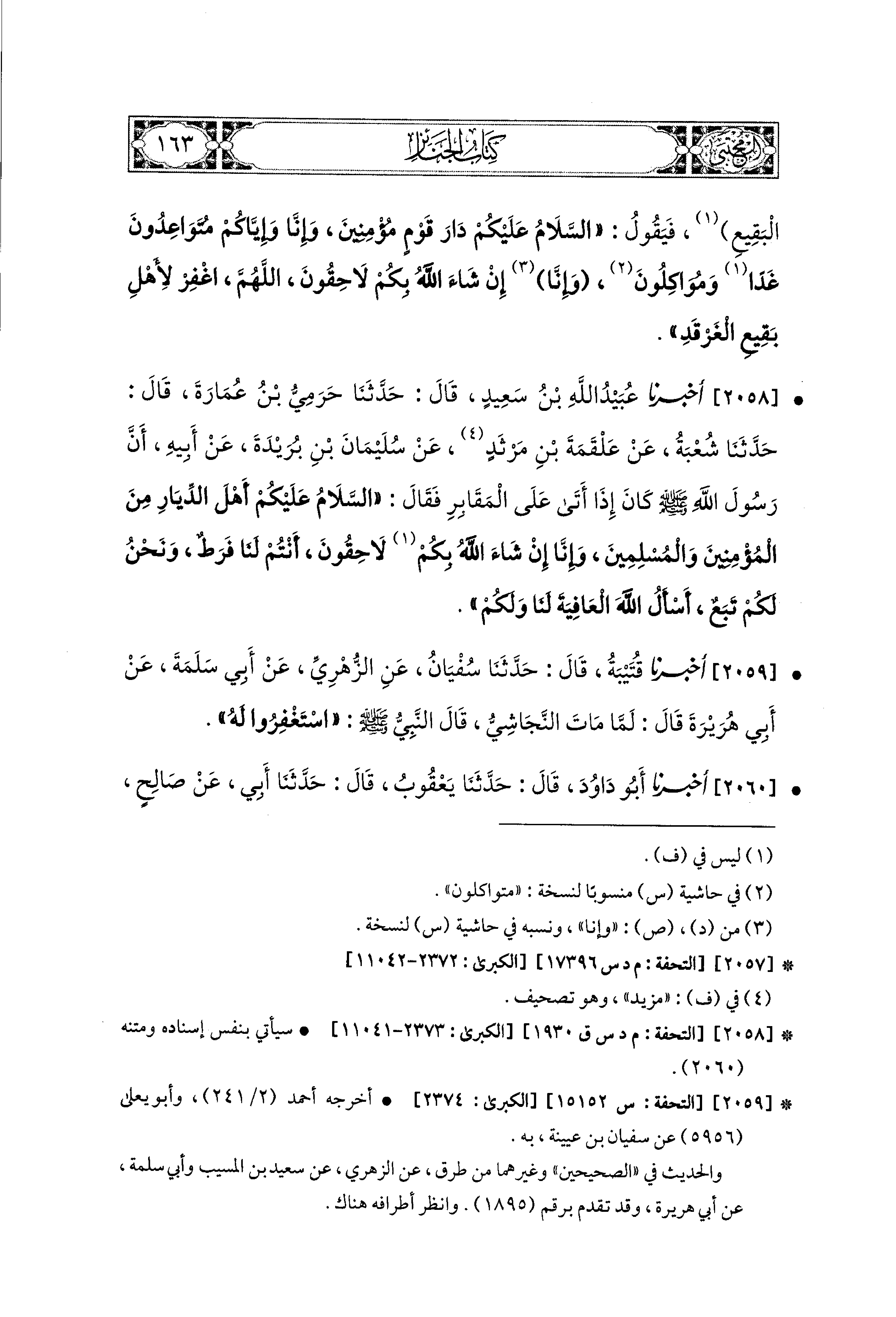 2058- أَخبَرَنا عُبَيدُ اللهِ بْنُ سَعيدٍ، قال: حَدثنا حَرَميُّ بْنُ عُمَارَةَ، قال: حَدثنا شُعبَةُ، عَن عَلْقَمَةَ بْنِ مَرْثَدٍ، عَن سُلَيمَانَ بْنِ بُرَيْدَةَ، عَن أَبيهِ، أَنَّ رَسُولَ اللهِ صَلى الله عَليه وسَلم كَانَ إِذَا أَتَى عَلَى المَقَابِرِ فَقَالَ: السَّلاَمُ عَلَيْكُمْ أَهْلَ الدِّيَارِ مِنَ المُؤْمِنينَ وَالمُسْلِمينَ، وَإِنَّا إِنْ شَاءَ اللهُ بِكُمْ لاَحِقُونَ، أَنْتُمْ لَنَا فَرَطٌ وَنَحْنُ لَكُمْ تَبَعٌ، أَسْأَلُ اللهَ العَافِيَةَ لَنَا وَلَكُمْ.