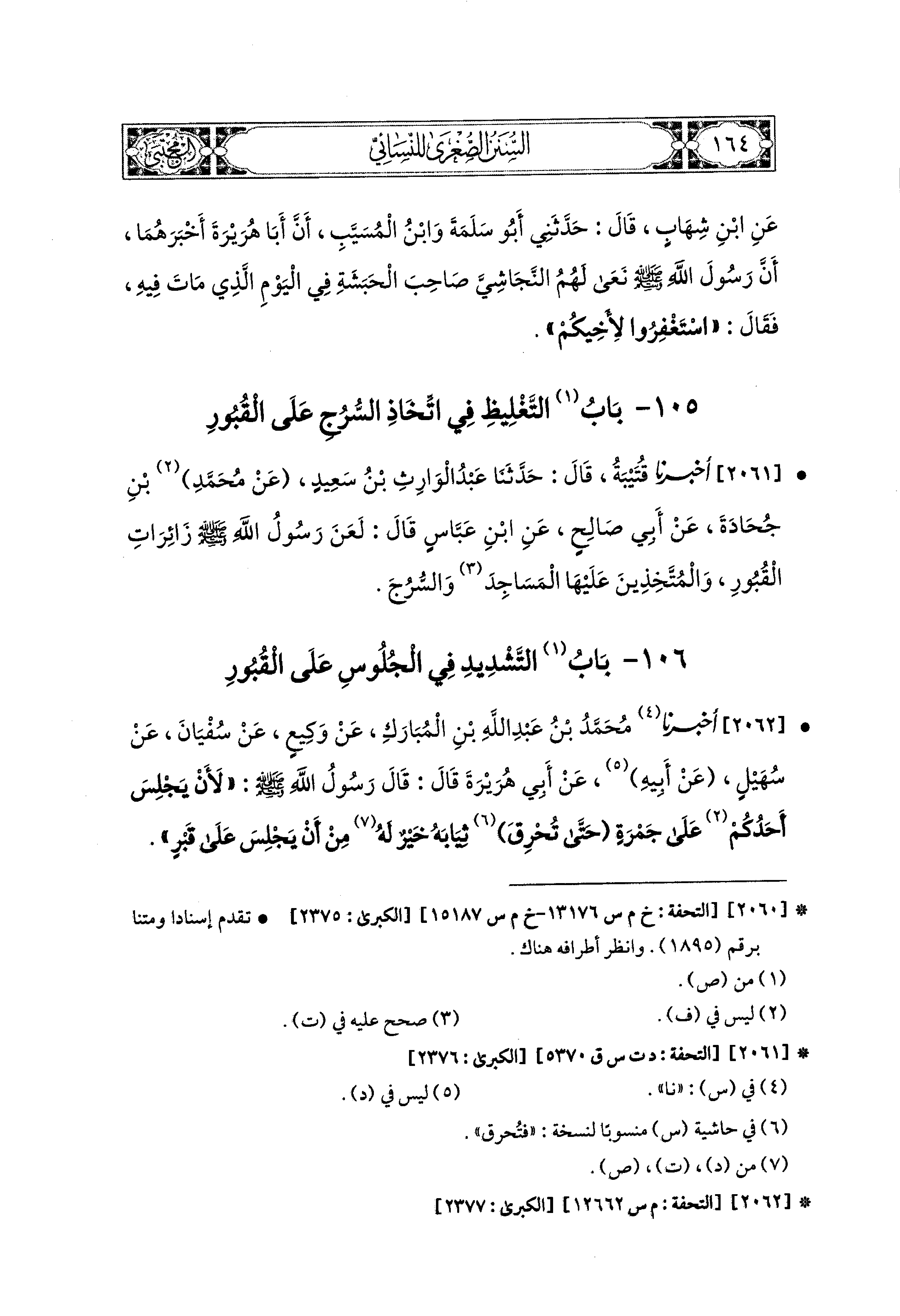 2061- أَخبَرَنا قُتَيبَةُ، قال: حَدثنا عَبدُ الوَارِثِ بْنُ سَعيدٍ، عَن مُحَمدِ بْنِ جُحَادَةَ، عَن أَبي صَالِحٍ، عَنِ ابنِ عَبَّاسٍ، قَالَ: لَعَنَ رَسُولُ اللهِ صَلى الله عَليه وسَلم زَائِرَاتِ القُبُورِ، وَالمُتَّخِذِينَ عَلَيهَا المَسَاجِدَ وَالسُّرُجَ.